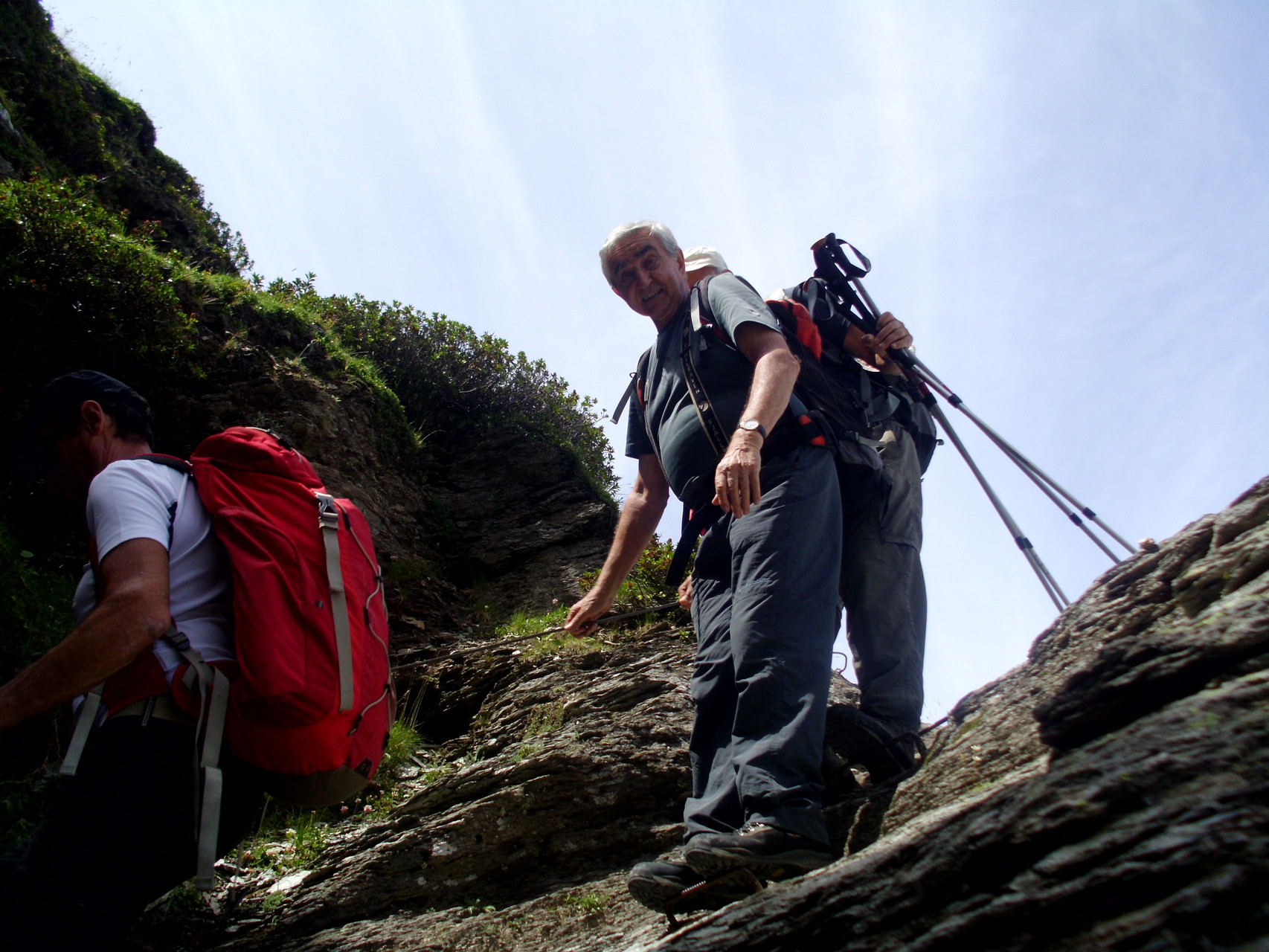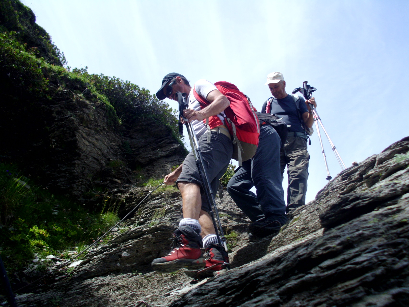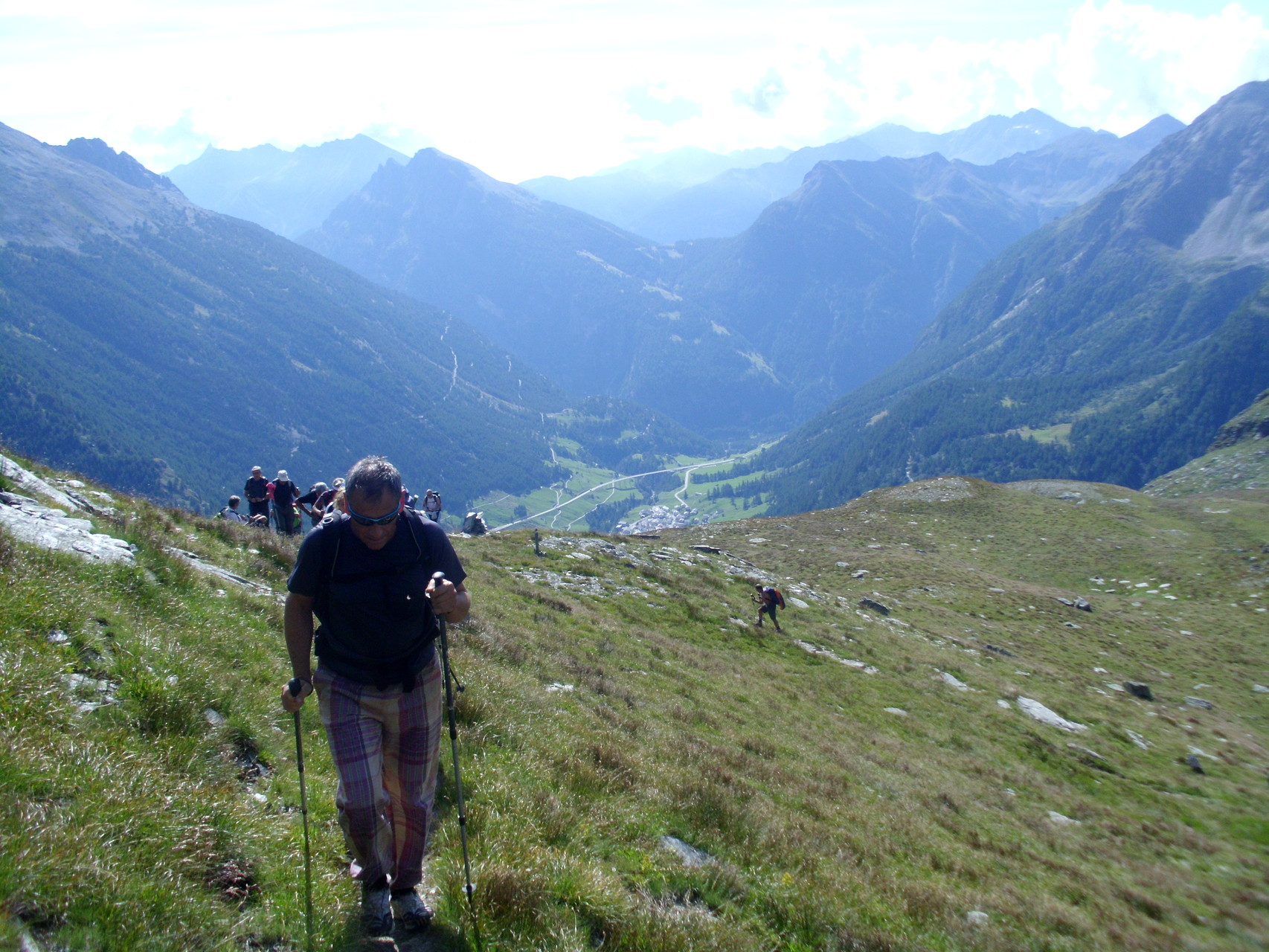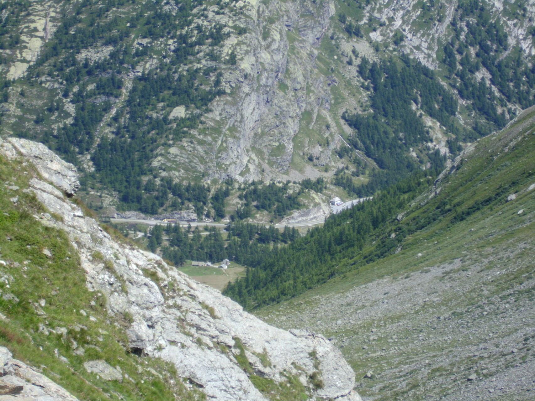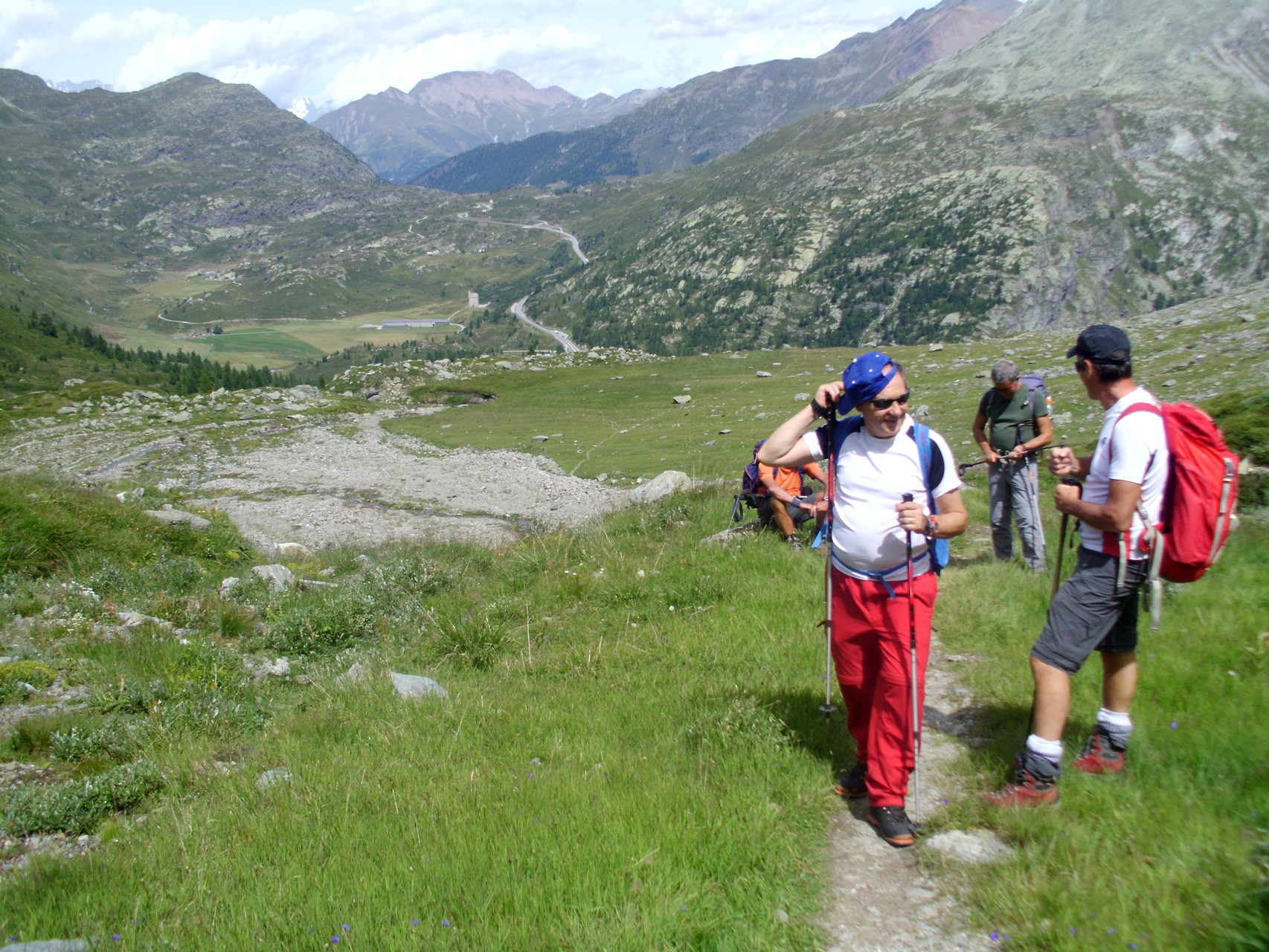 Dopo la lunga sosta per il pranzo ripartiamo alle 13,30. Risaliamo ai cartelli di segnaletica e scendiamo a sinistra, sempre su pietraia verso Engeloch. Superiamo un breve tratto attrezzato con scalini di ferro fissati nella roccia, alle 15,10 raggiungiamo l'altezza della suprestrada e prendiamo il sentiero Stockalper che in piano ci porta alle auto: sono le 16,05.