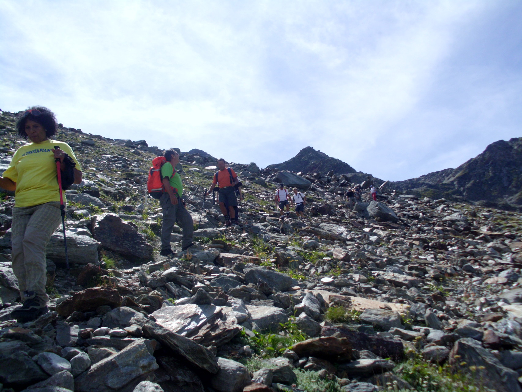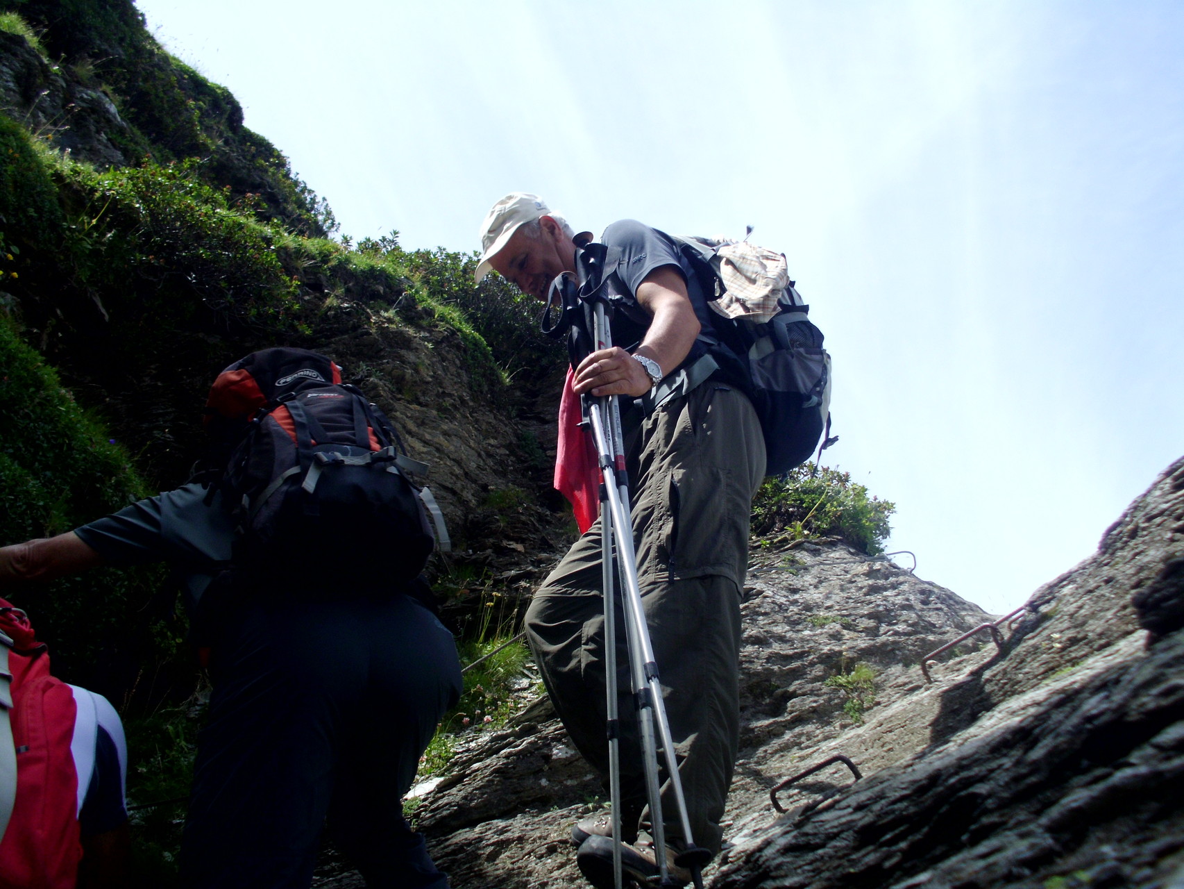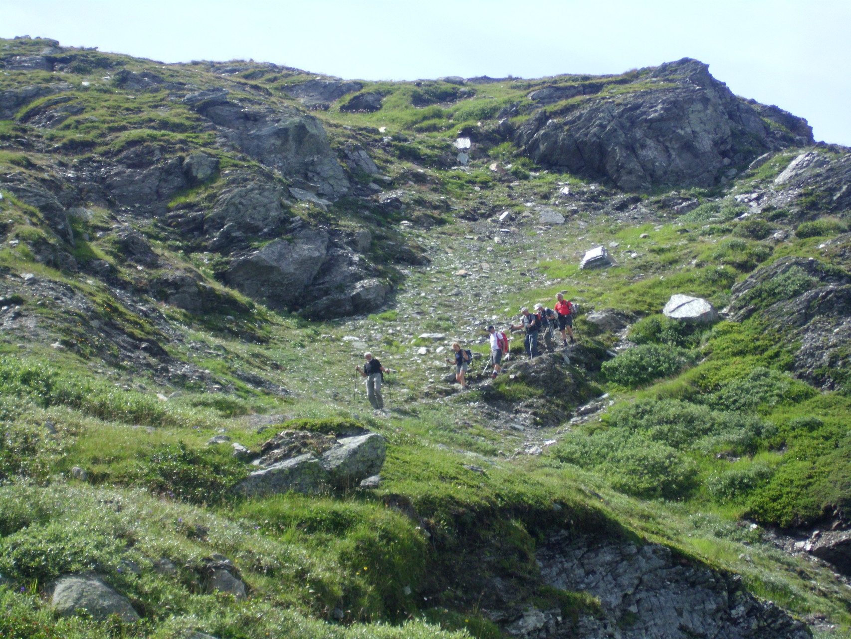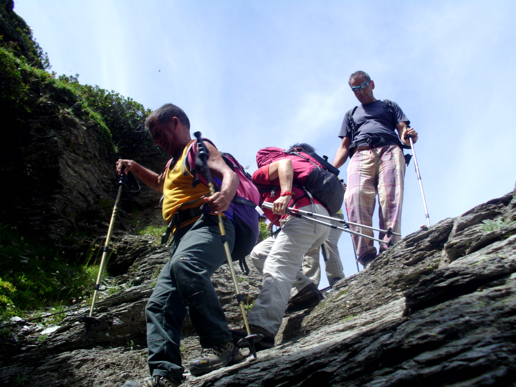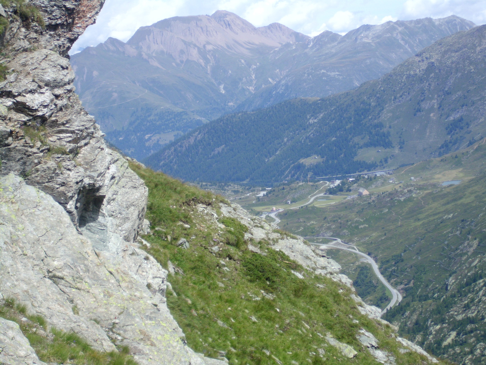 Dopo la lunga sosta per il pranzo ripartiamo alle 13,30. Risaliamo ai cartelli di segnaletica e scendiamo a sinistra, sempre su pietraia verso Engeloch. Superiamo un breve tratto attrezzato con scalini di ferro fissati nella roccia, alle 15,10 raggiungiamo l'altezza della suprestrada e prendiamo il sentiero Stockalper che in piano ci porta alle auto: sono le 16,05.