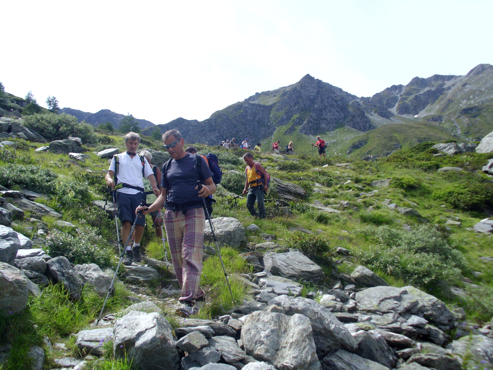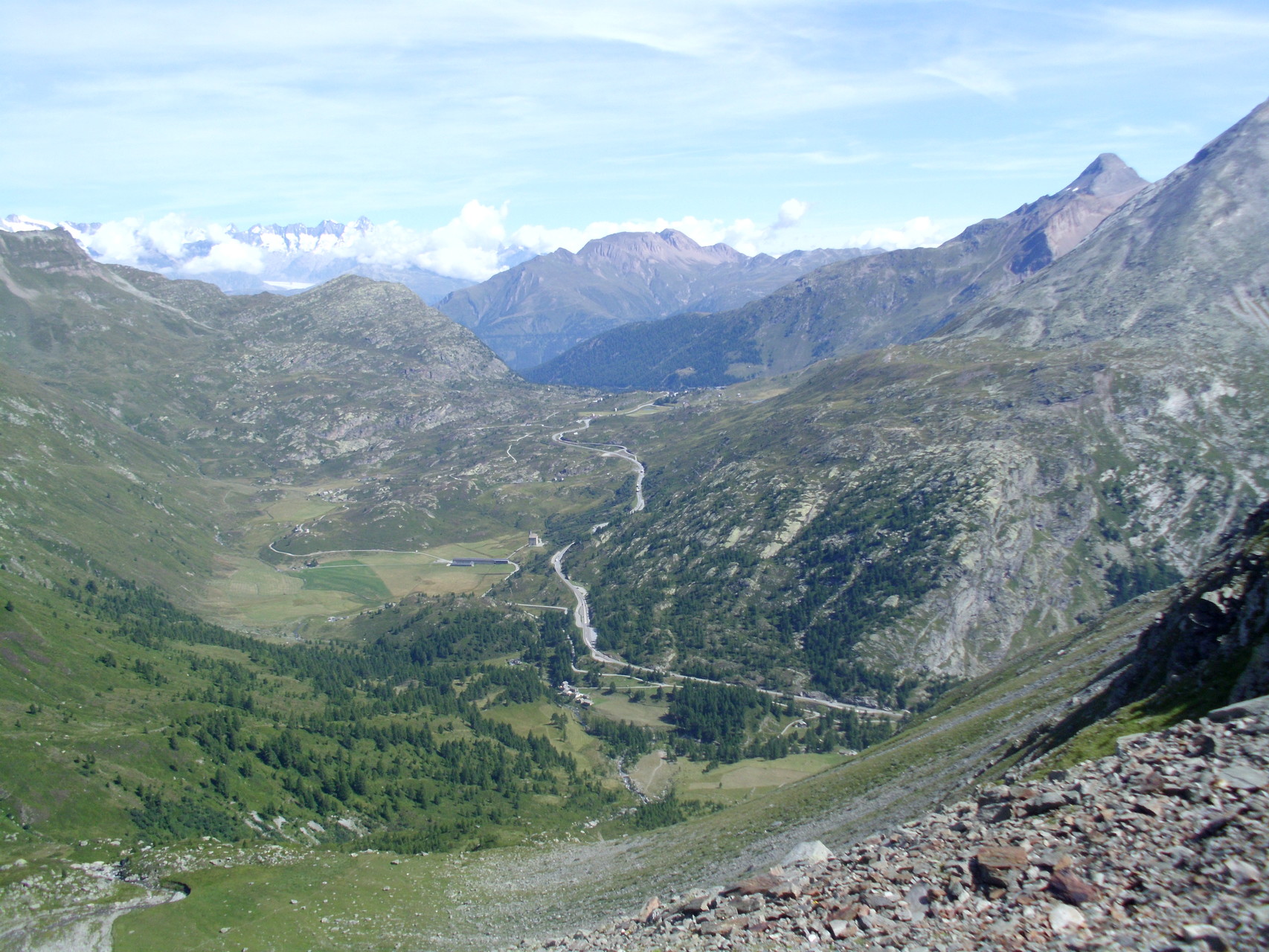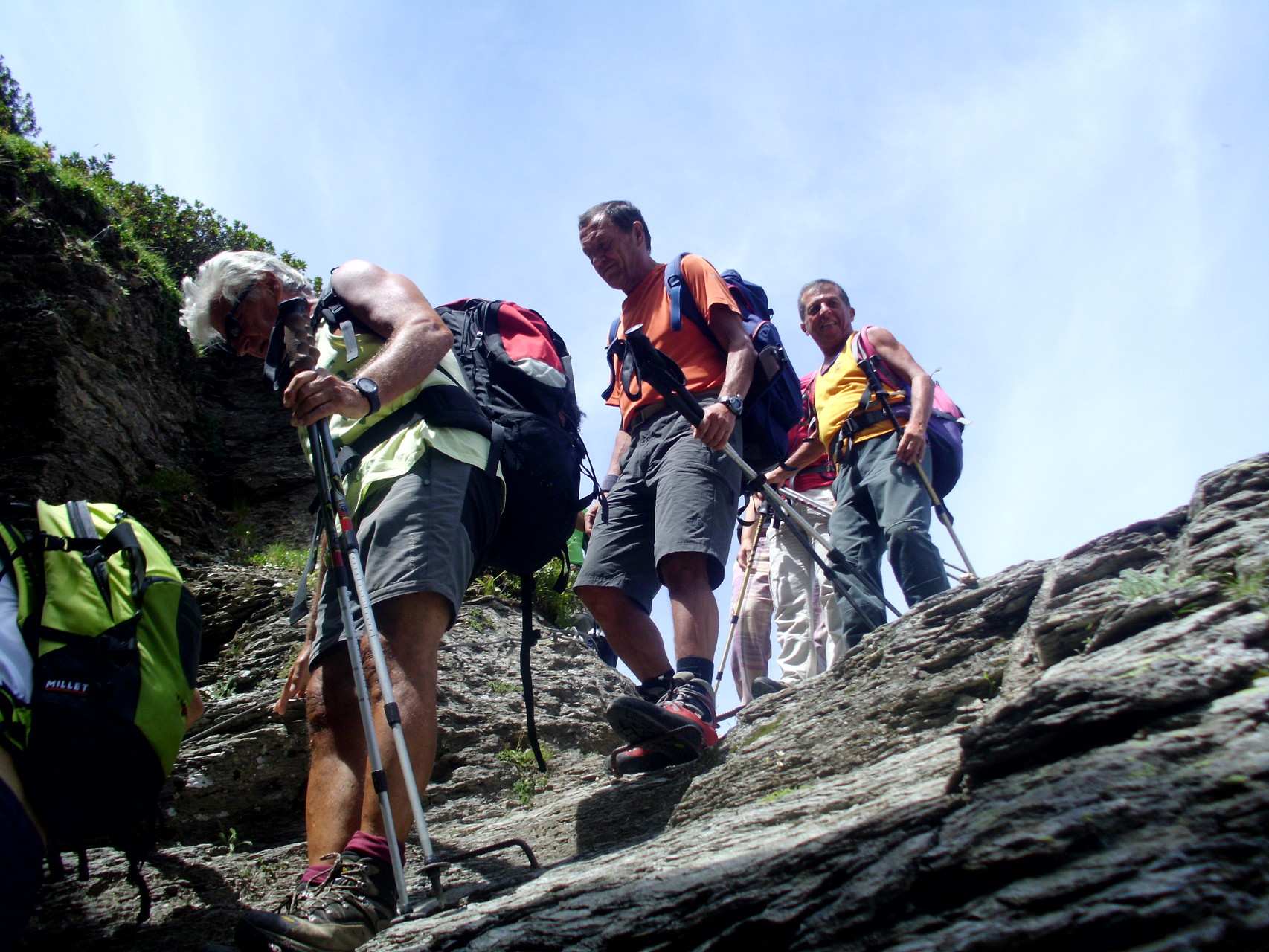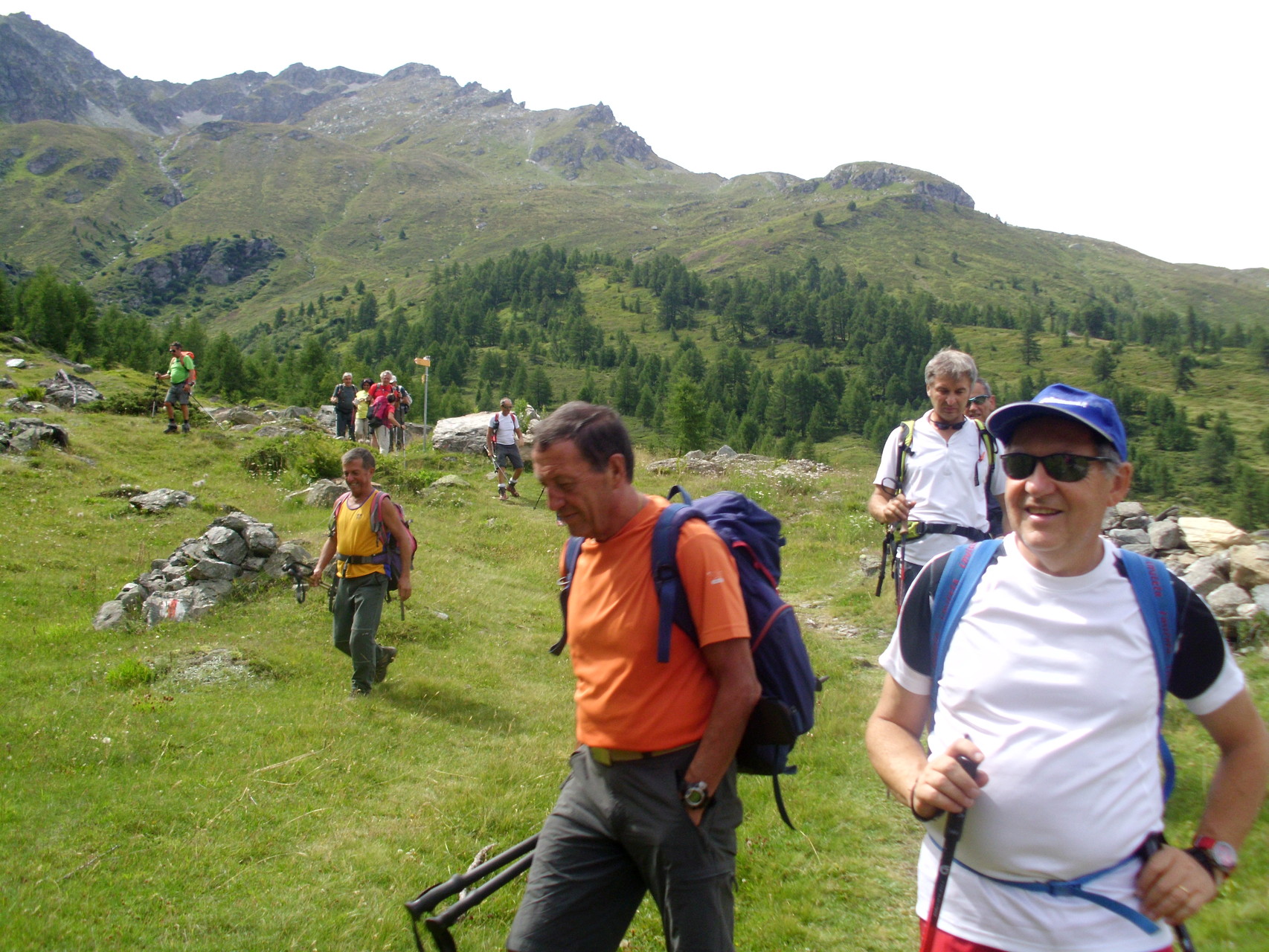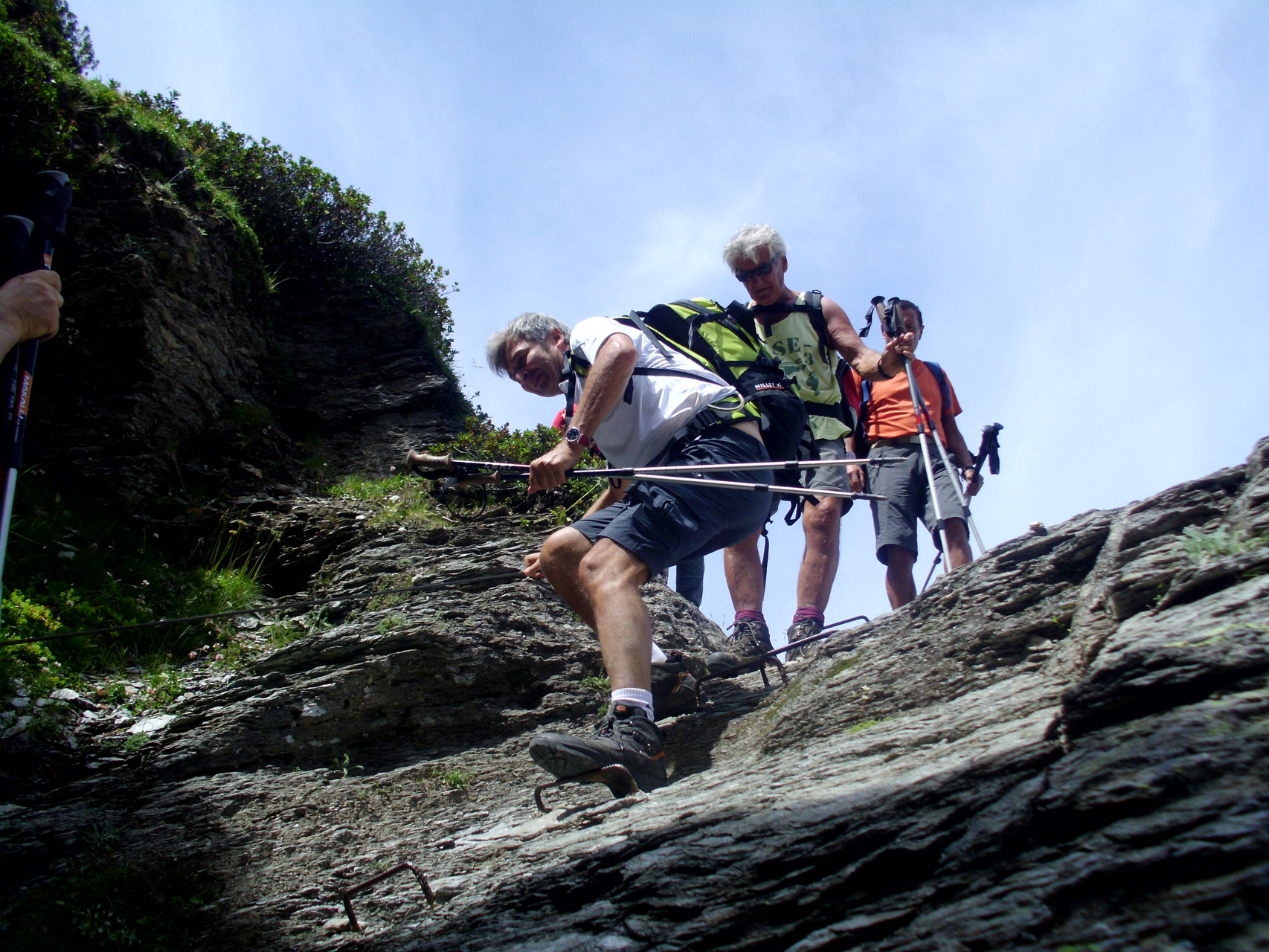 Dopo la lunga sosta per il pranzo ripartiamo alle 13,30. Risaliamo ai cartelli di segnaletica e scendiamo a sinistra, sempre su pietraia verso Engeloch. Superiamo un breve tratto attrezzato con scalini di ferro fissati nella roccia, alle 15,10 raggiungiamo l'altezza della suprestrada e prendiamo il sentiero Stockalper che in piano ci porta alle auto: sono le 16,05.