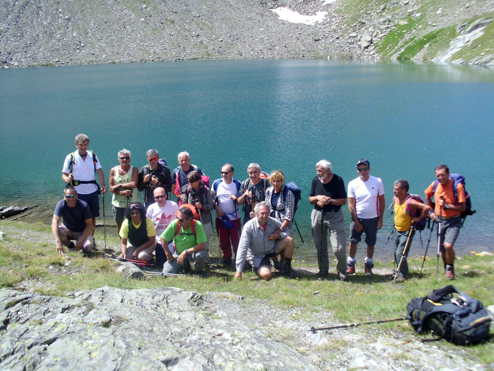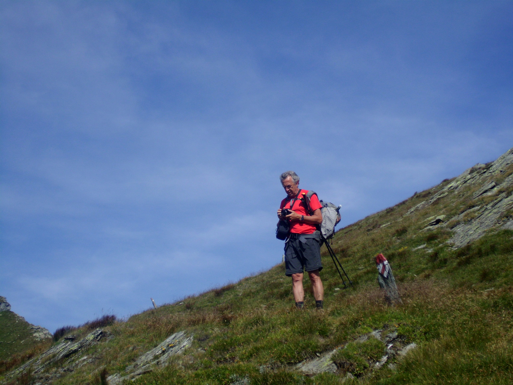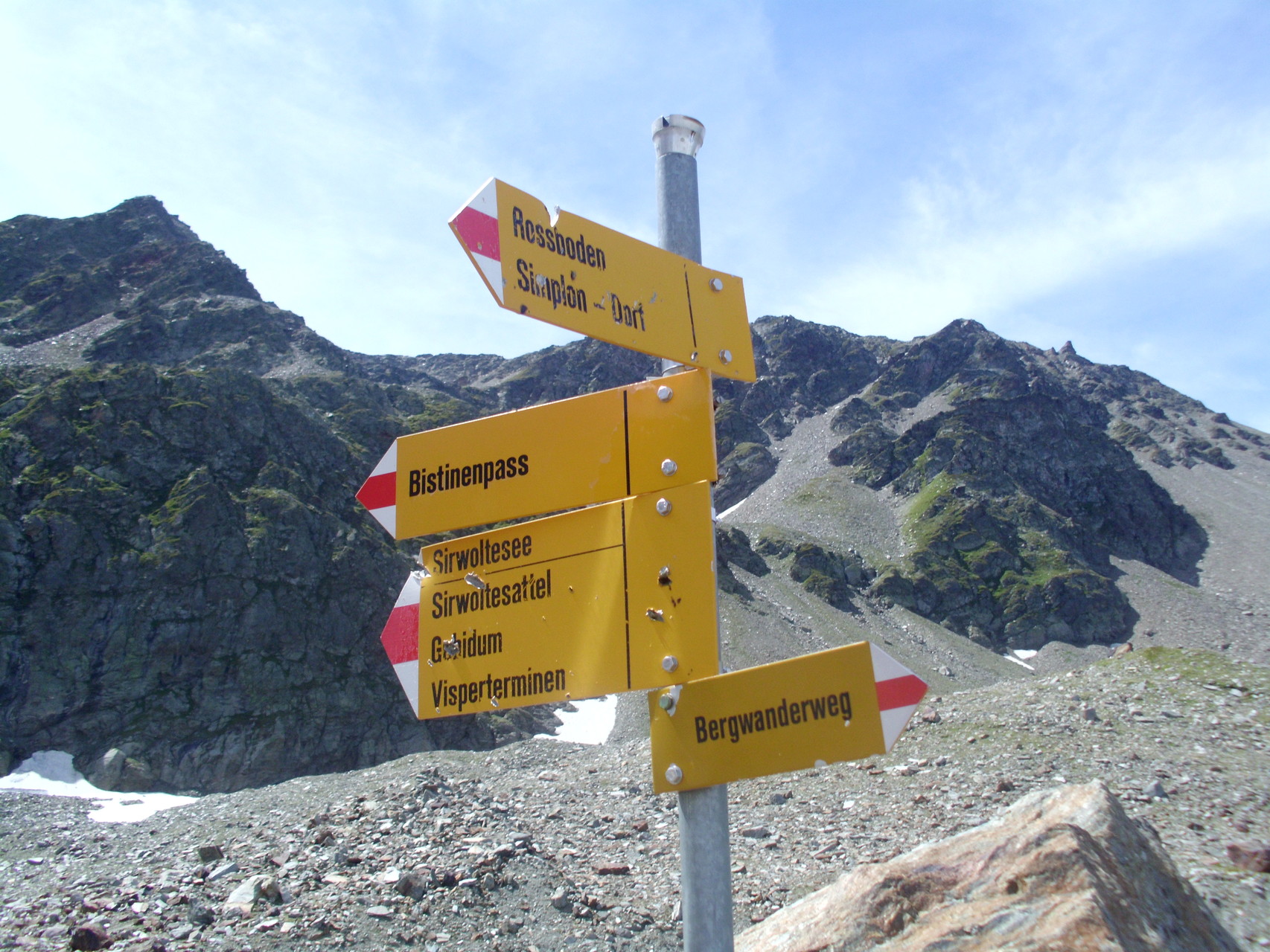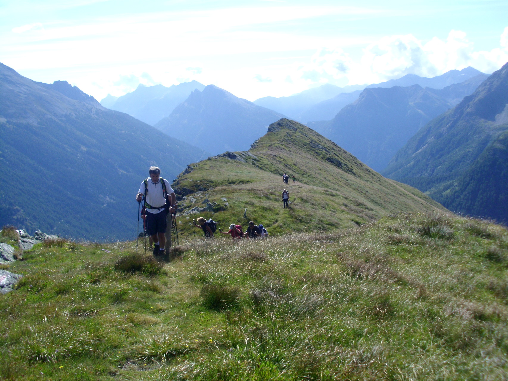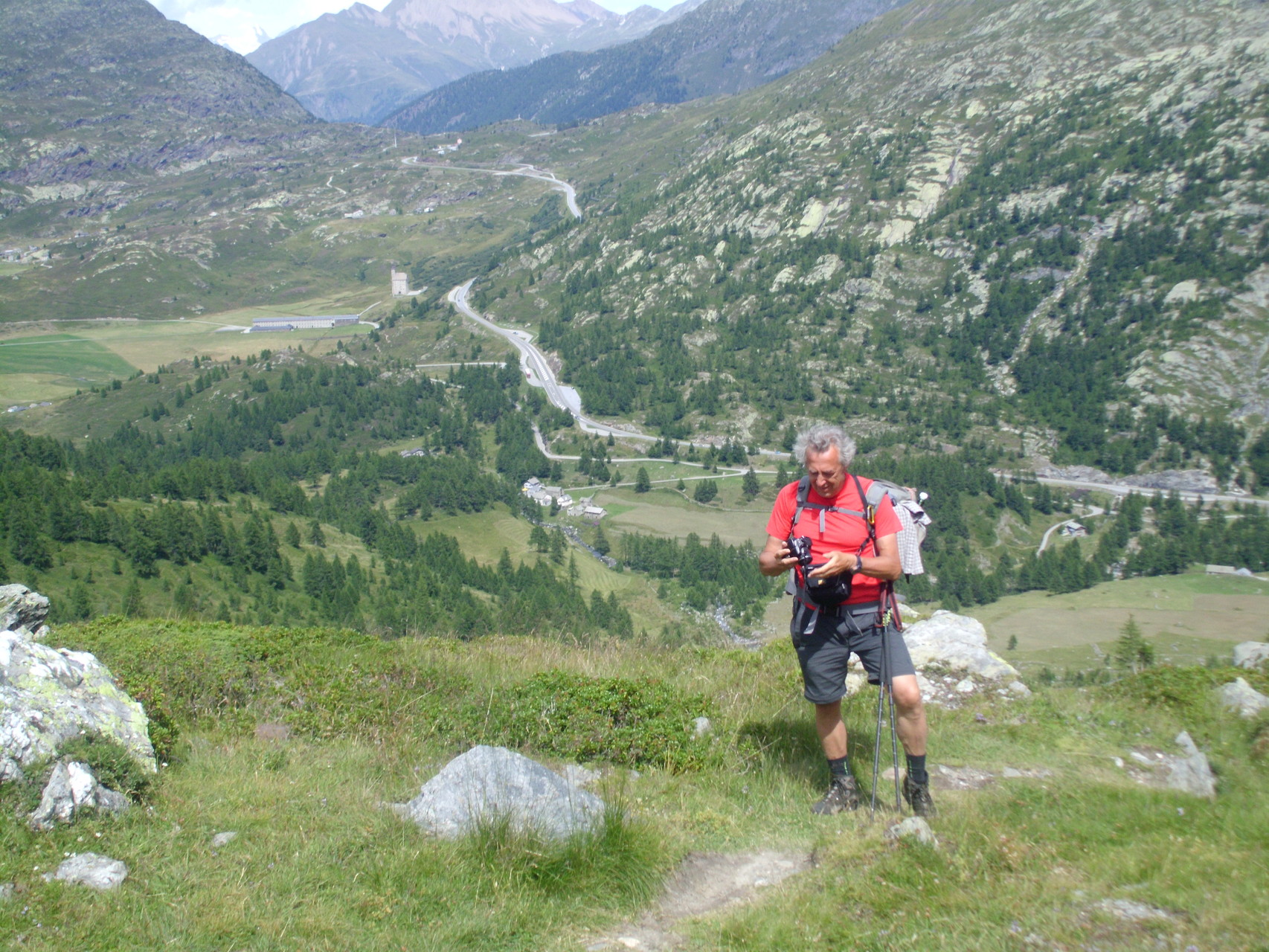 Saliamo su bel sentiero e alle 8,40 arriviamo al bel alpeggio di Rossboden m.1922, breve sosta quindi ripartiamo, la vegetazione finisce ma il percorso è sempre bello e panoramico. Raggiungiamo la cresta dove godiamo della magnifica vista sul Passo del Sempione. Proseguiamo in cresta fino al monte Rossboden m.2550, quindi scendiamo su ripida pietraia fino al lago Sirwoltesee m.2400 circa, sono le 11,50. Carlo decide di fare un tuffo nel lago (vedi fotogallery), l'acqua è gelida ed esce quasi subito.