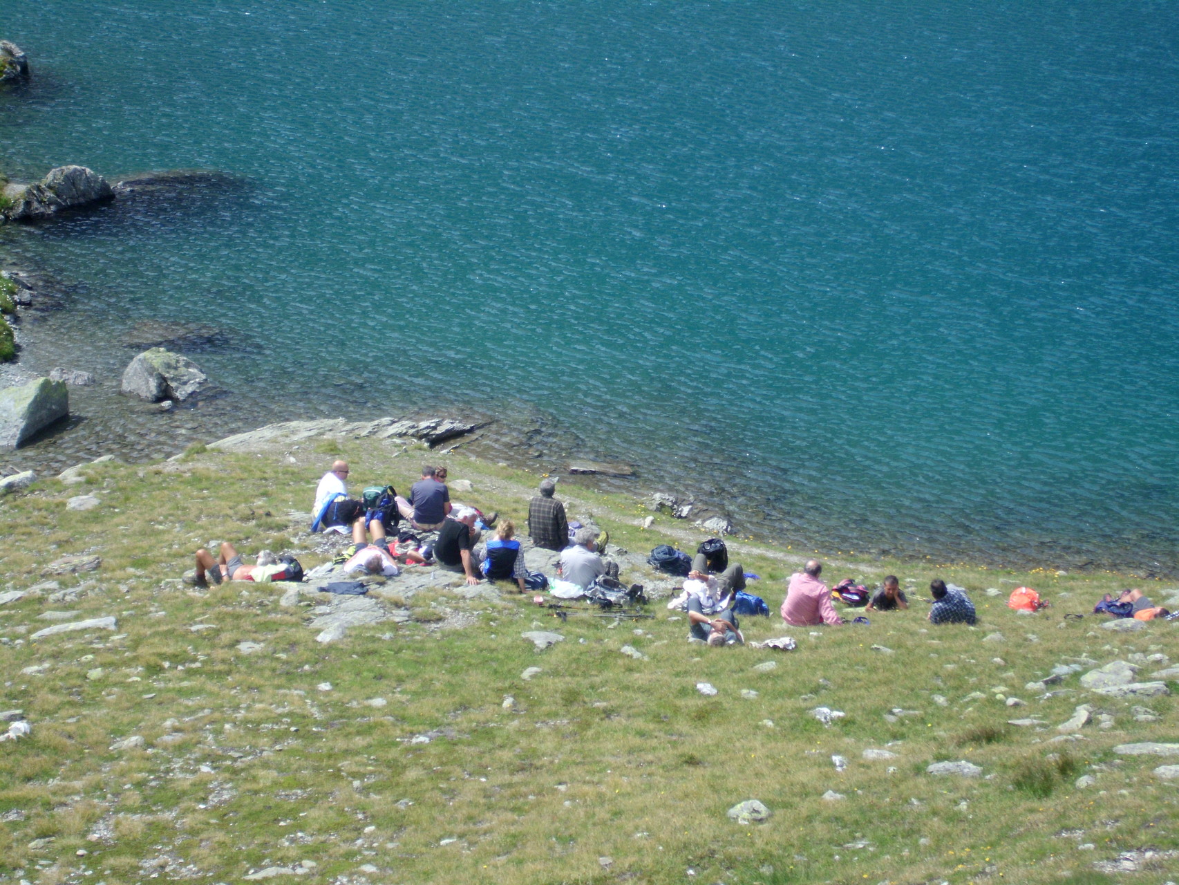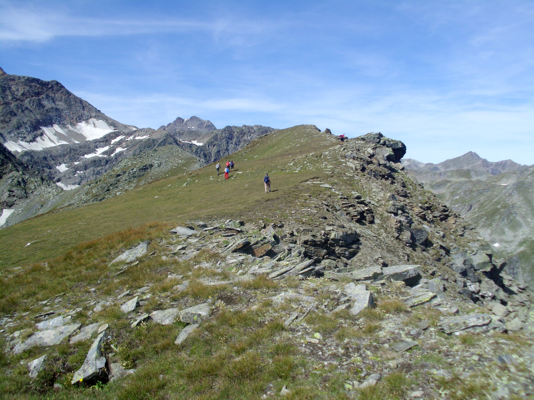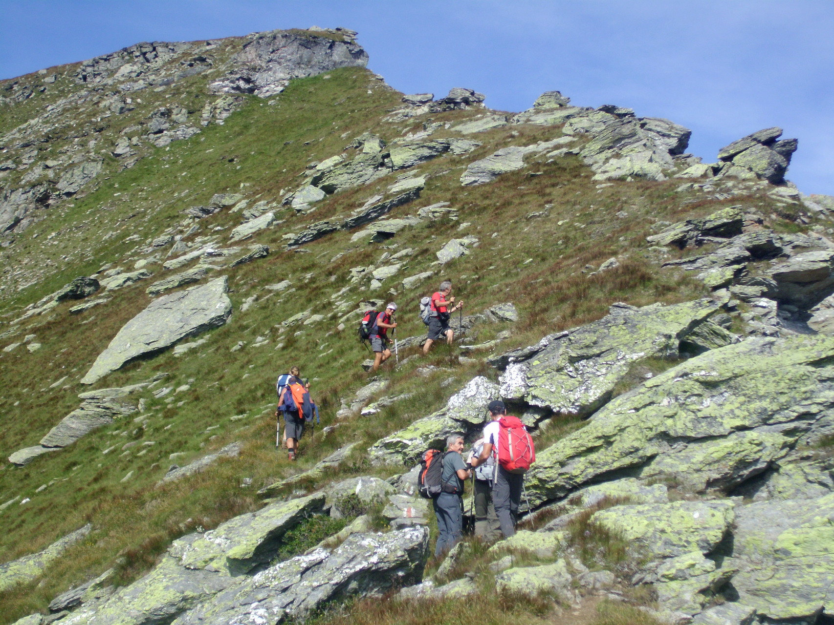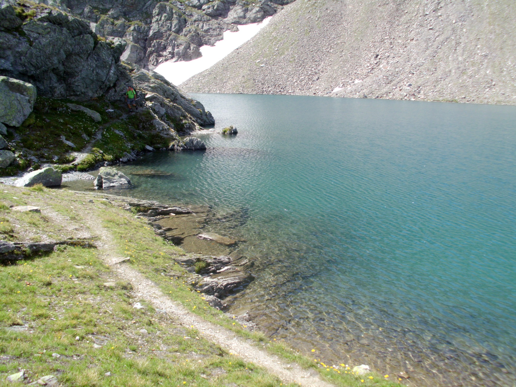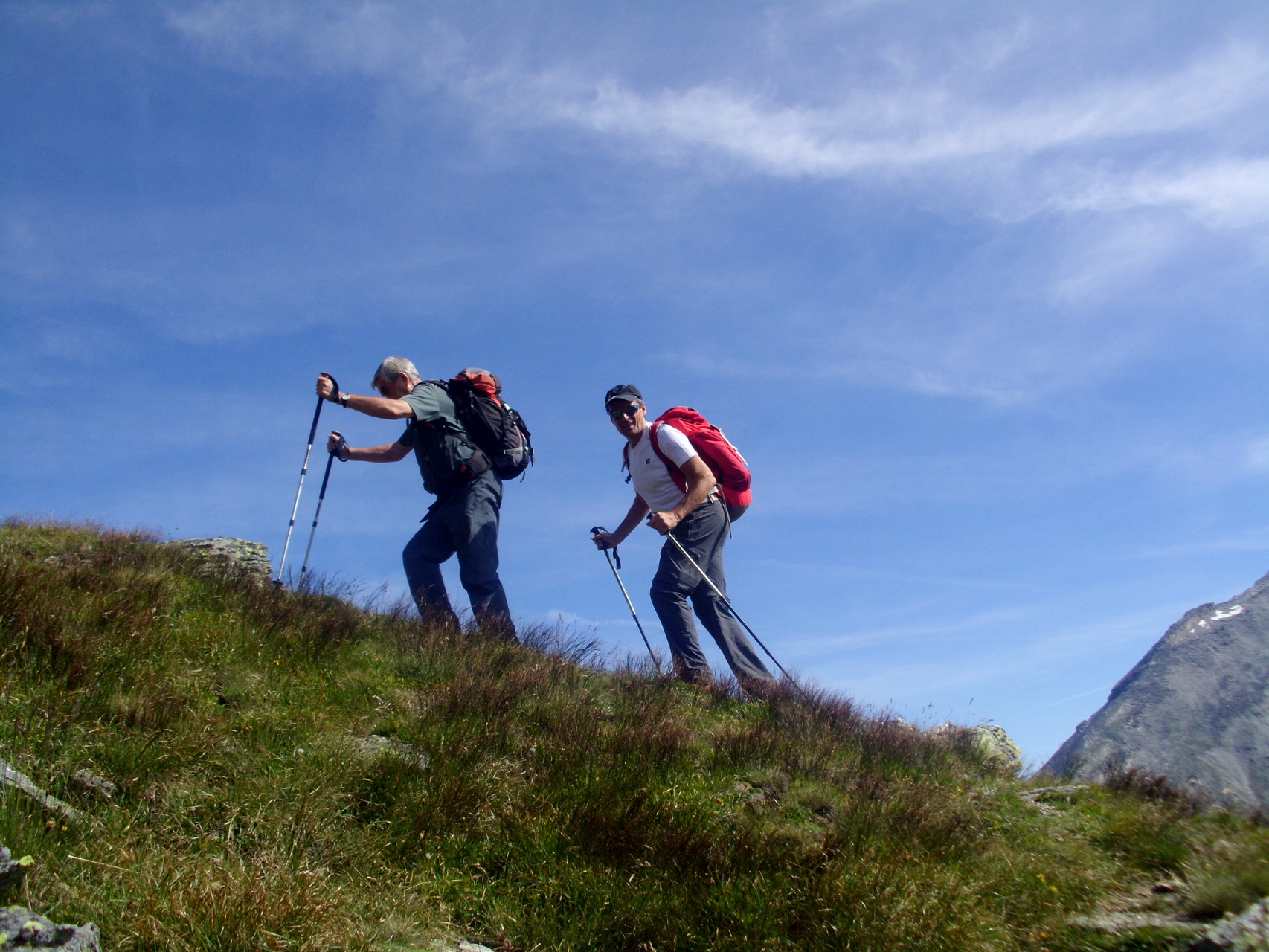 Saliamo su bel sentiero e alle 8,40 arriviamo al bel alpeggio di Rossboden m.1922, breve sosta quindi ripartiamo, la vegetazione finisce ma il percorso è sempre bello e panoramico. Raggiungiamo la cresta dove godiamo della magnifica vista sul Passo del Sempione. Proseguiamo in cresta fino al monte Rossboden m.2550, quindi scendiamo su ripida pietraia fino al lago Sirwoltesee m.2400 circa, sono le 11,50. Carlo decide di fare un tuffo nel lago (vedi fotogallery), l'acqua è gelida ed esce quasi subito.