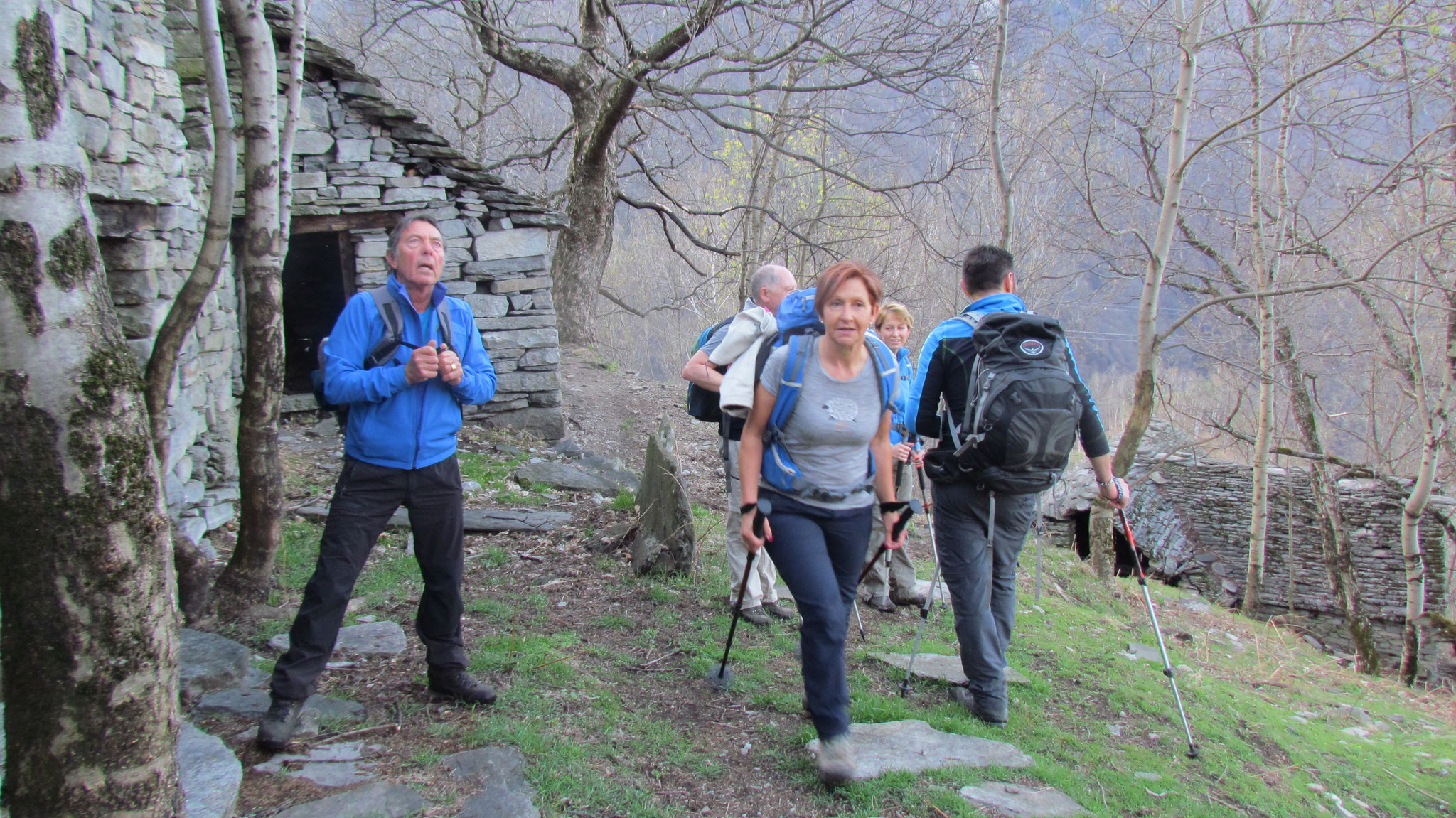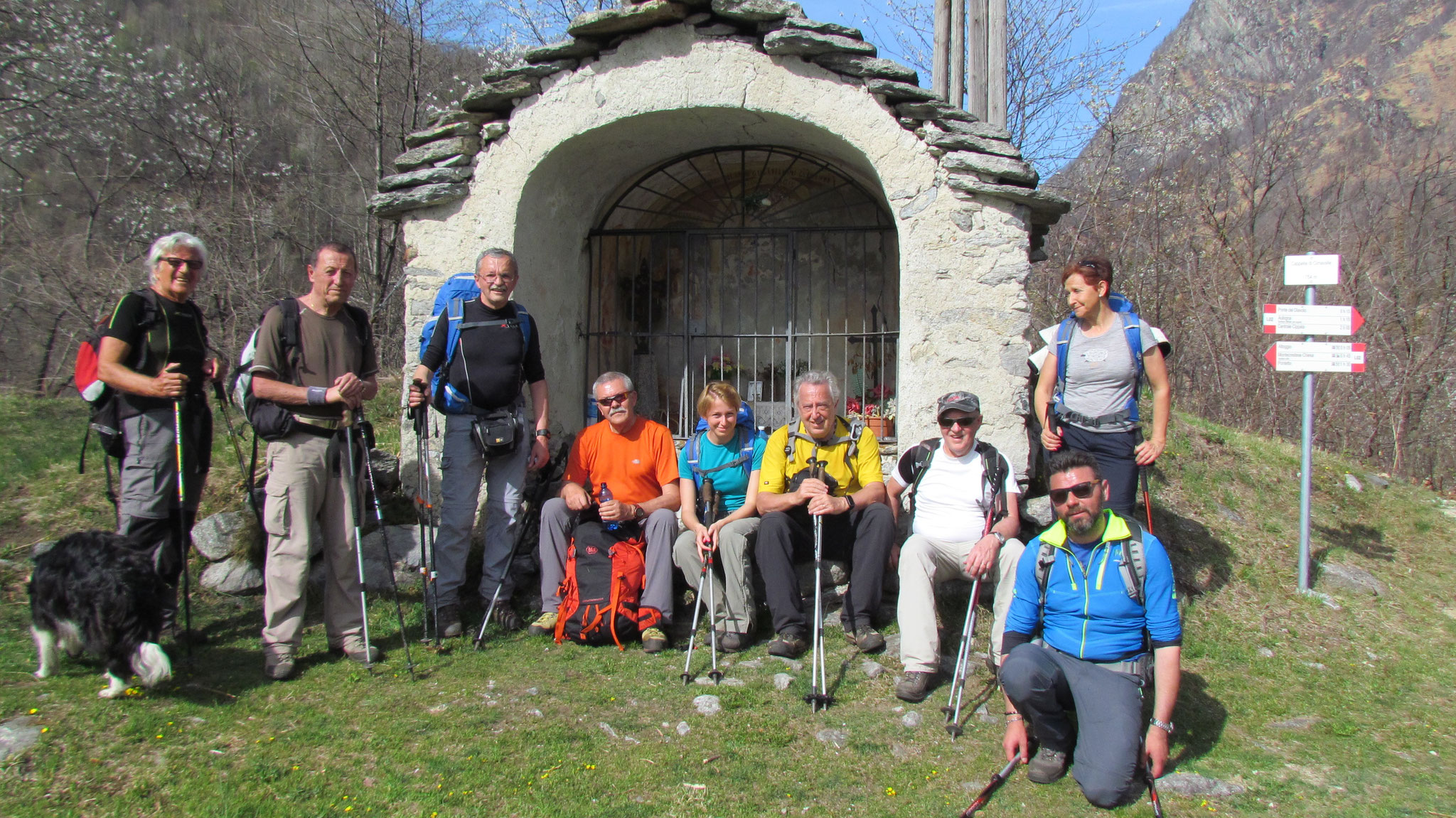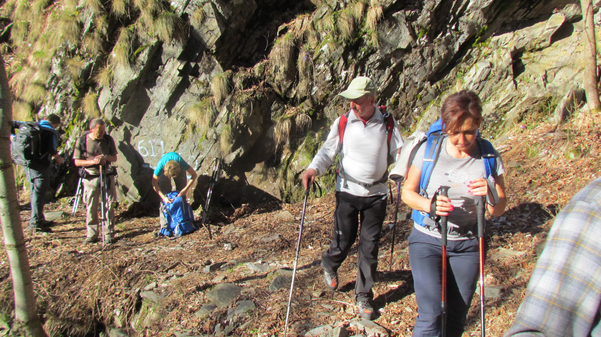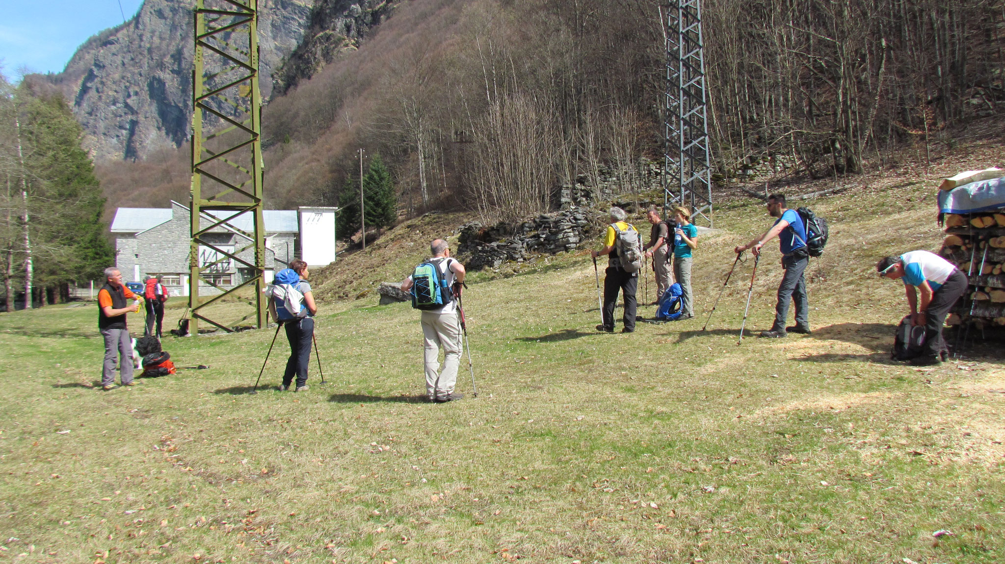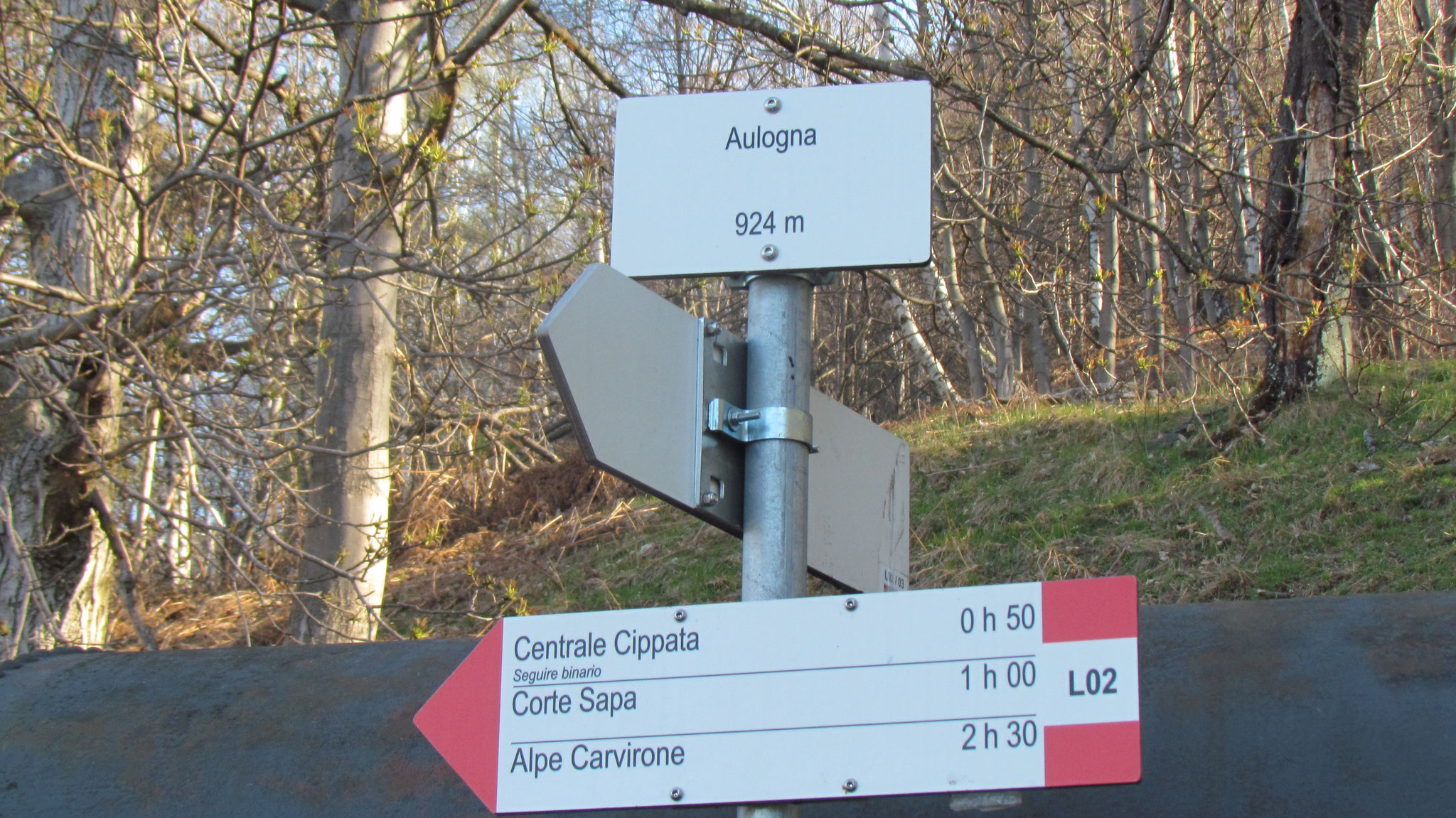 Attraversiamo il paese fino al lavatoio, poi giriamo a destra, usciamo nei prati e raggiungiamo la Cappella di Cimavalle m. 754, sono le 7,50. Prendiamo il sentiero che scende a destra della Cappella nella valle Isorno, perdiamo circa 150 metri di quota fino al ponte del Diavolo m. 600 che raggiungiamo alle 8,05. Risaliamo la sponda opposta e arriviamo alle prime baite di Aulogna alle 8,35. Saliamo fino ad arrivare alle ultime baite a quota 924 e alla casetta dei guardiani di una condotta di acqua. Sono le 8,55. Sosta per la colazione e ripartenza alle 9,10.
