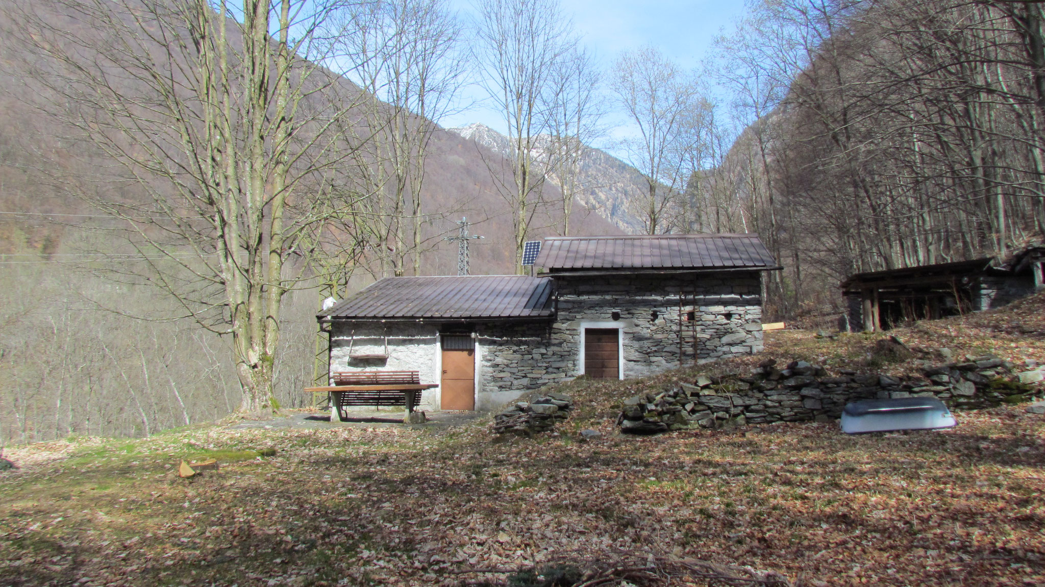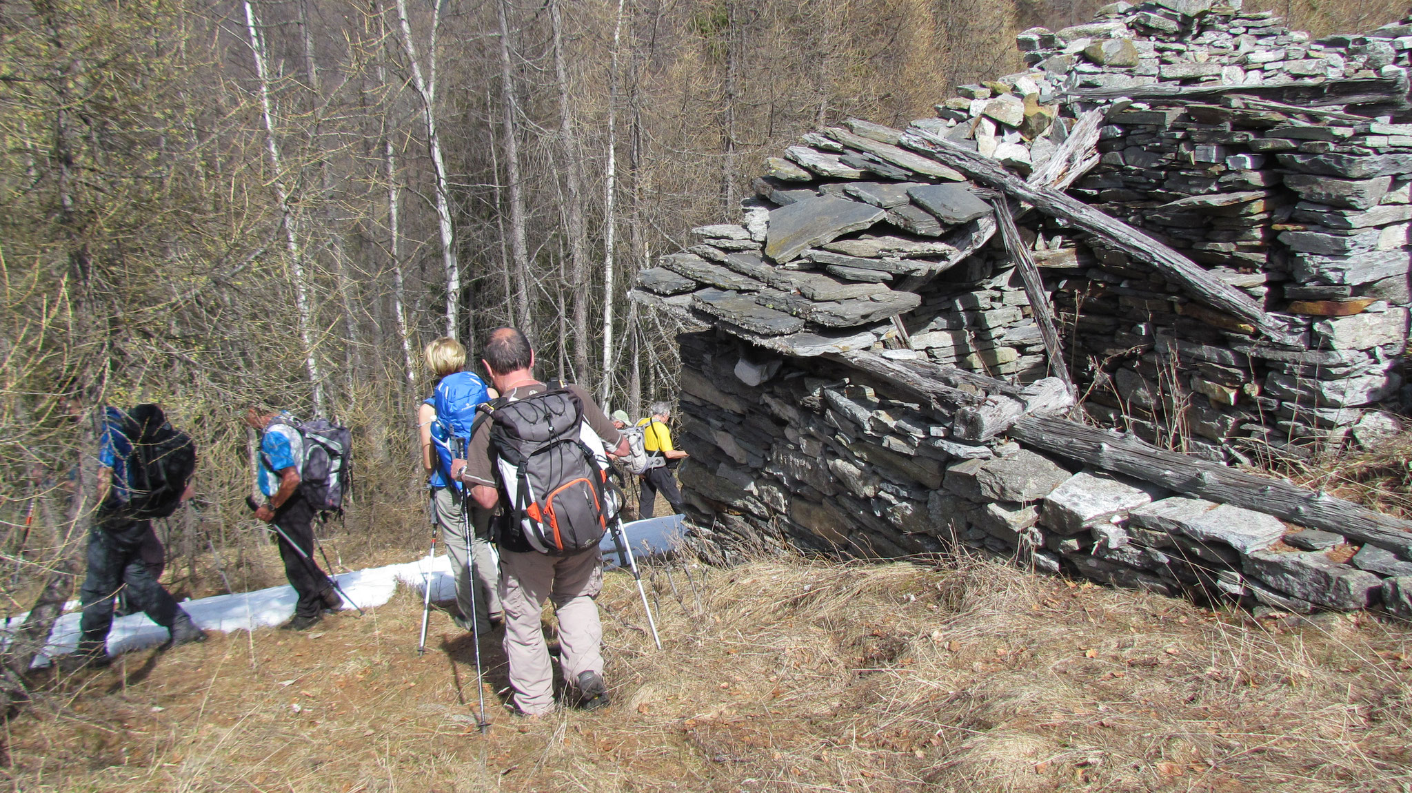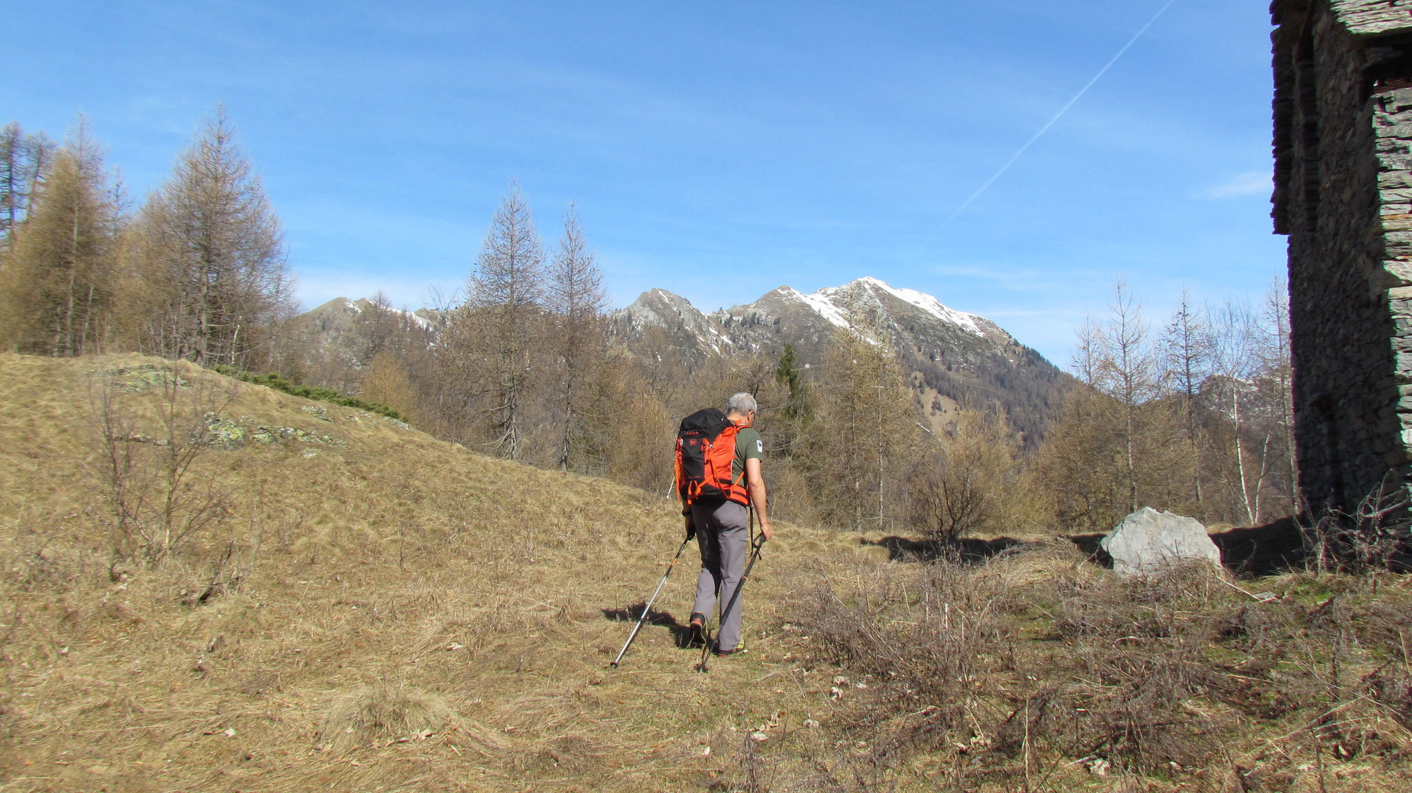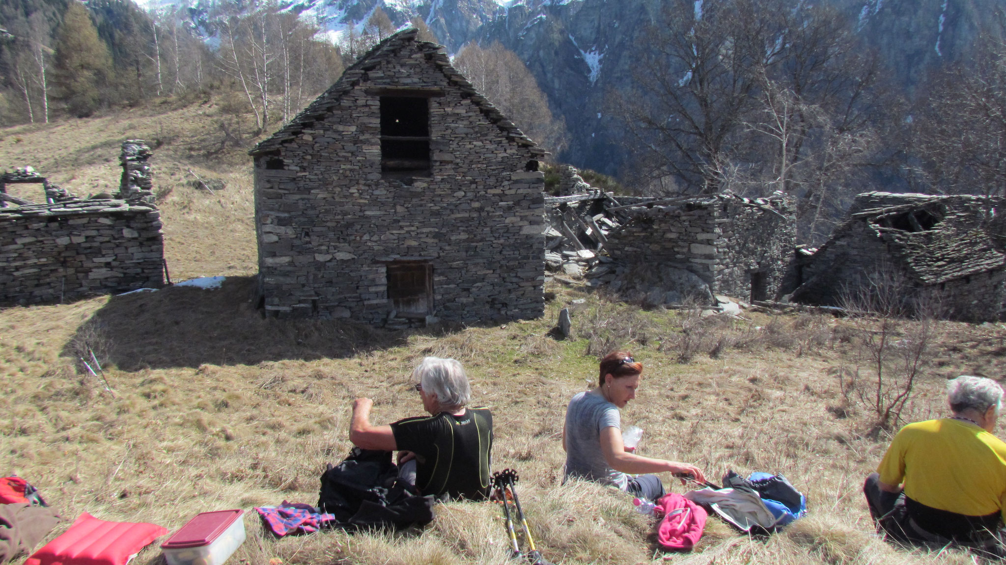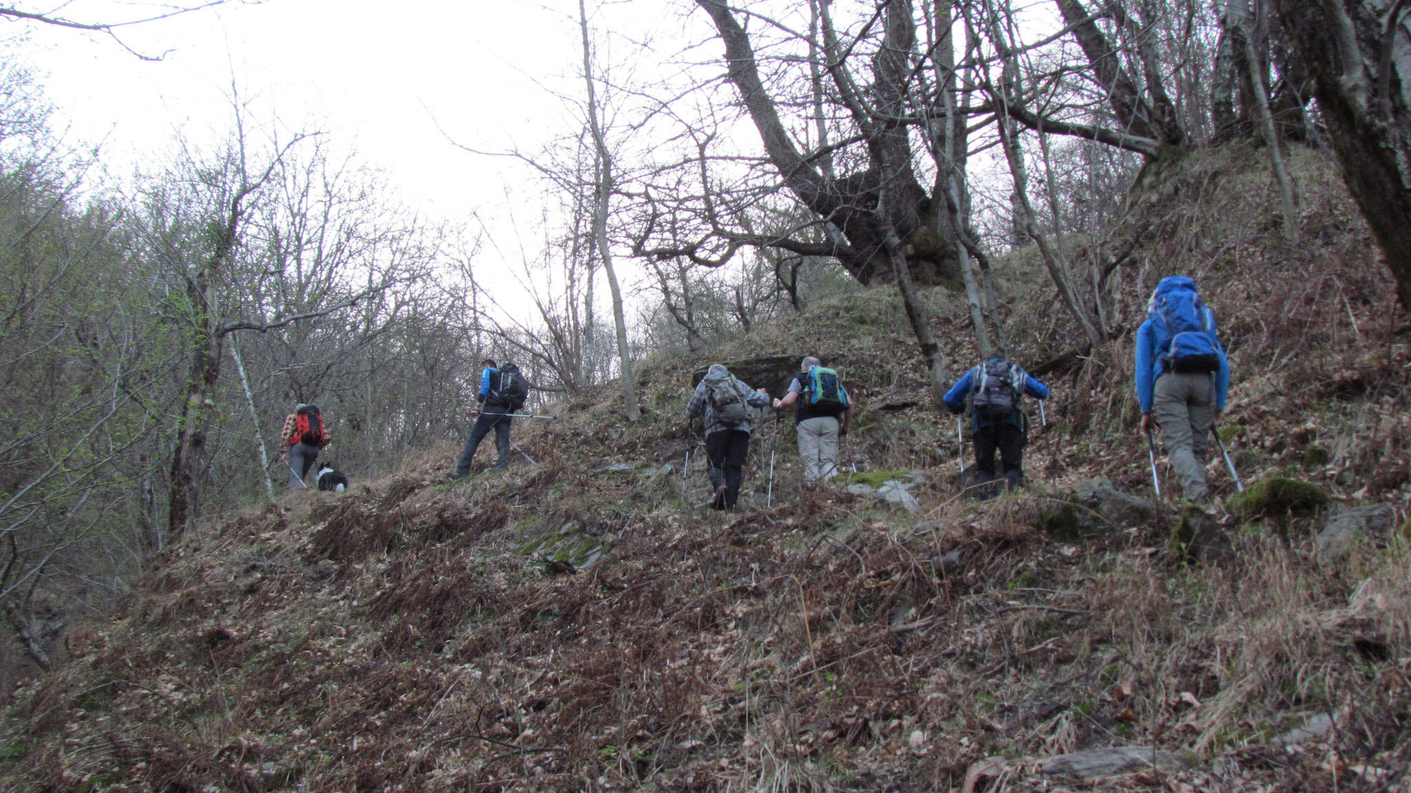 Attraversiamo il paese fino al lavatoio, poi giriamo a destra, usciamo nei prati e raggiungiamo la Cappella di Cimavalle m. 754, sono le 7,50. Prendiamo il sentiero che scende a destra della Cappella nella valle Isorno, perdiamo circa 150 metri di quota fino al ponte del Diavolo m. 600 che raggiungiamo alle 8,05. Risaliamo la sponda opposta e arriviamo alle prime baite di Aulogna alle 8,35. Saliamo fino ad arrivare alle ultime baite a quota 924 e alla casetta dei guardiani di una condotta di acqua. Sono le 8,55. Sosta per la colazione e ripartenza alle 9,10.