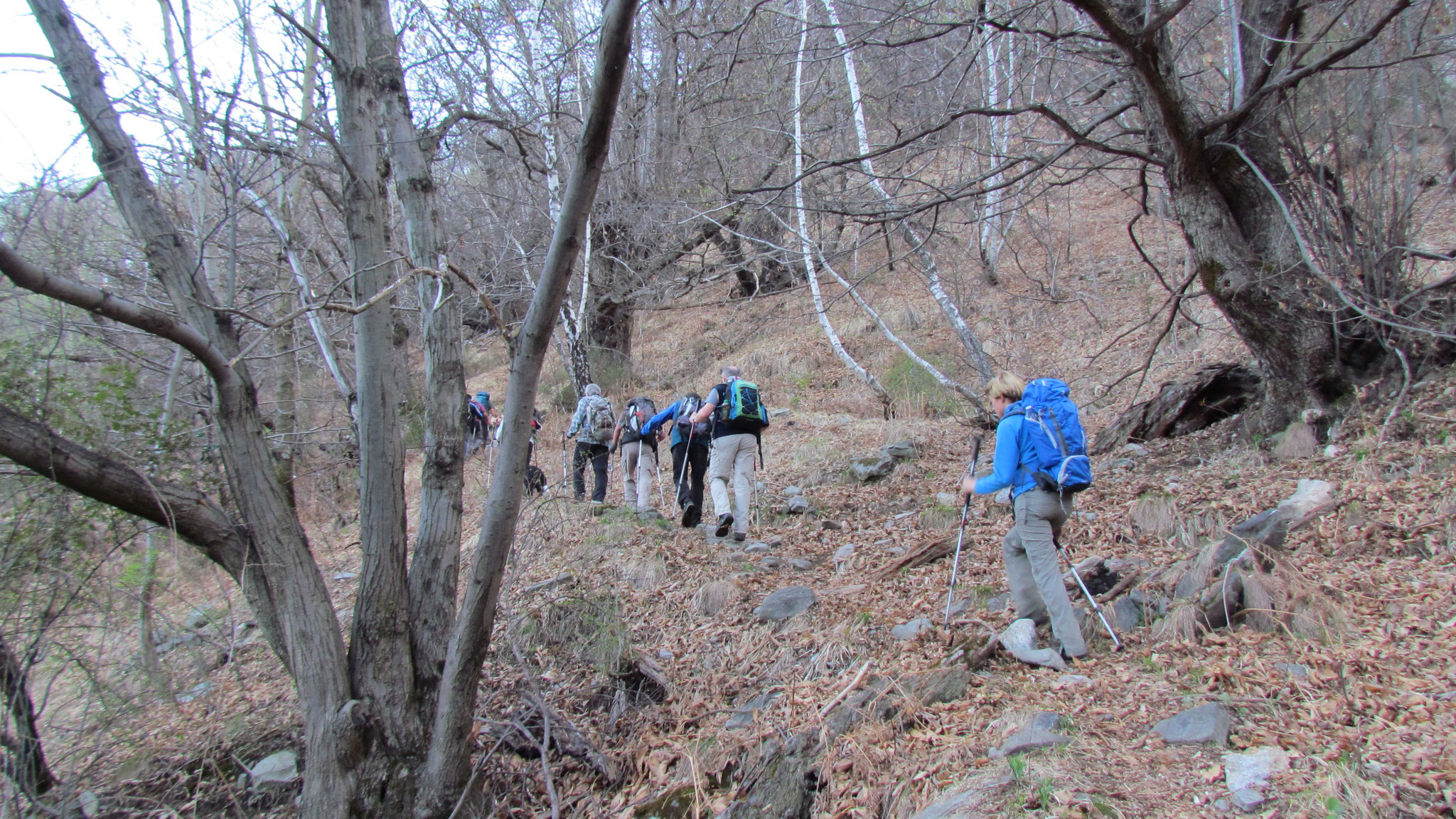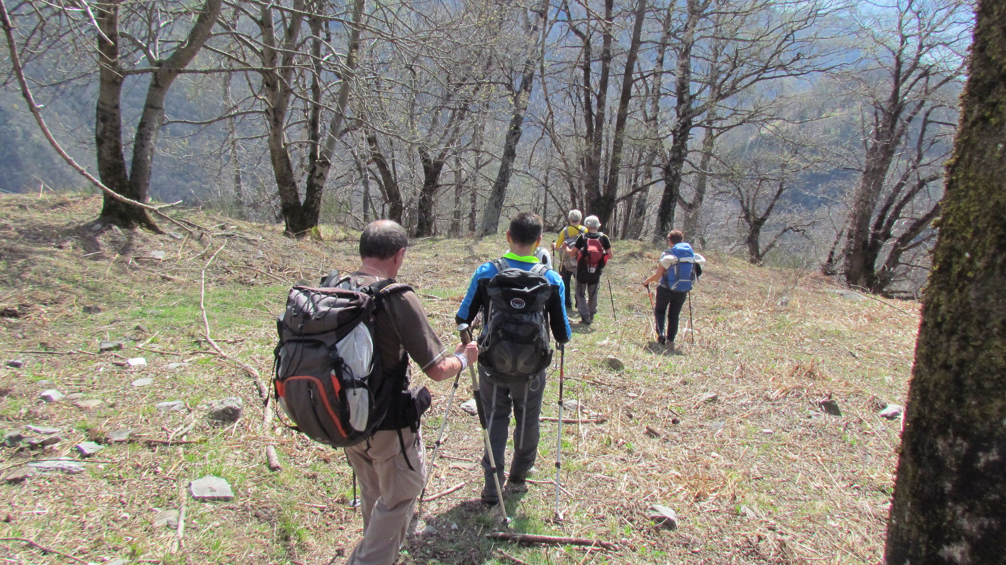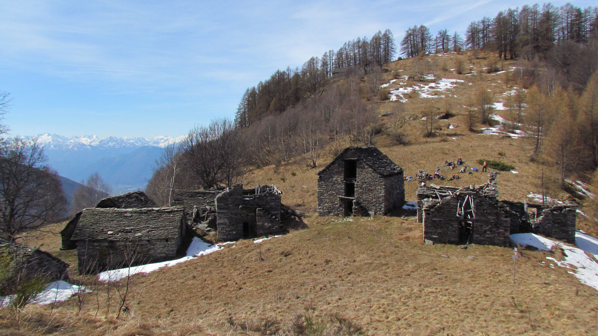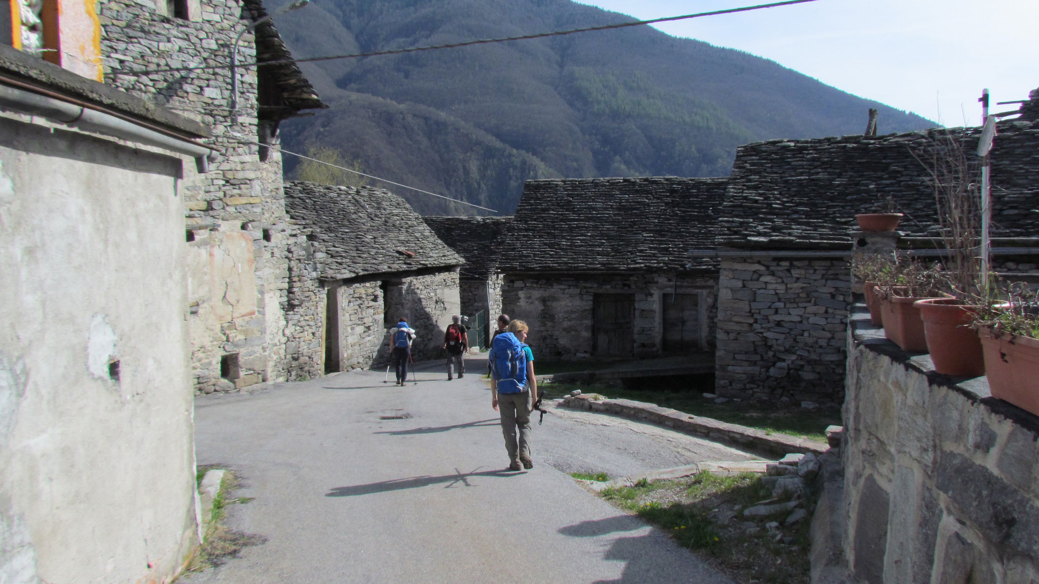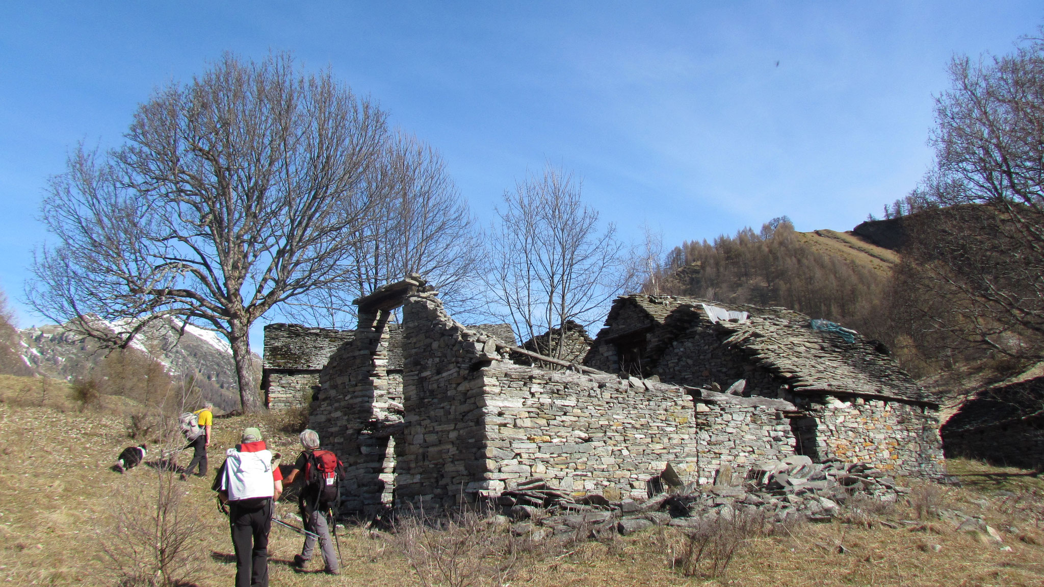 Attraversiamo il paese fino al lavatoio, poi giriamo a destra, usciamo nei prati e raggiungiamo la Cappella di Cimavalle m. 754, sono le 7,50. Prendiamo il sentiero che scende a destra della Cappella nella valle Isorno, perdiamo circa 150 metri di quota fino al ponte del Diavolo m. 600 che raggiungiamo alle 8,05. Risaliamo la sponda opposta e arriviamo alle prime baite di Aulogna alle 8,35. Saliamo fino ad arrivare alle ultime baite a quota 924 e alla casetta dei guardiani di una condotta di acqua. Sono le 8,55. Sosta per la colazione e ripartenza alle 9,10.