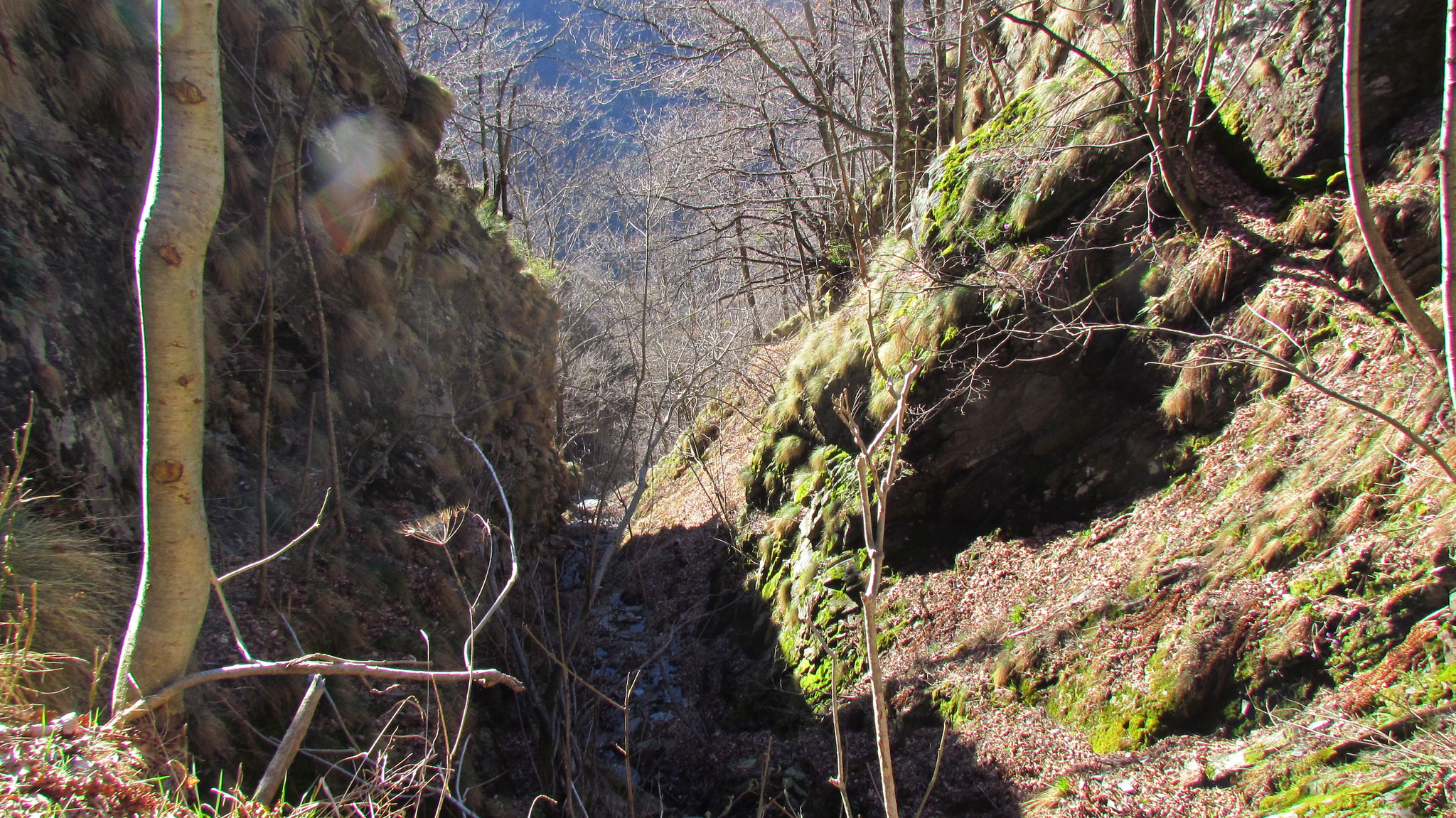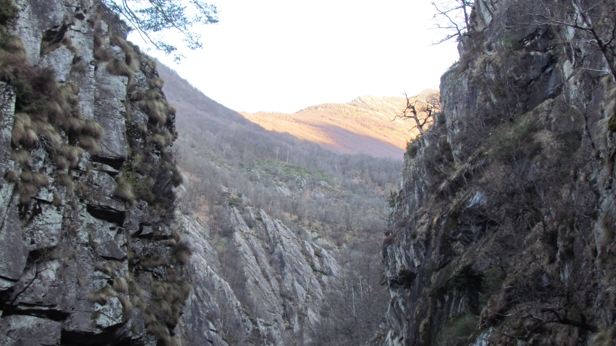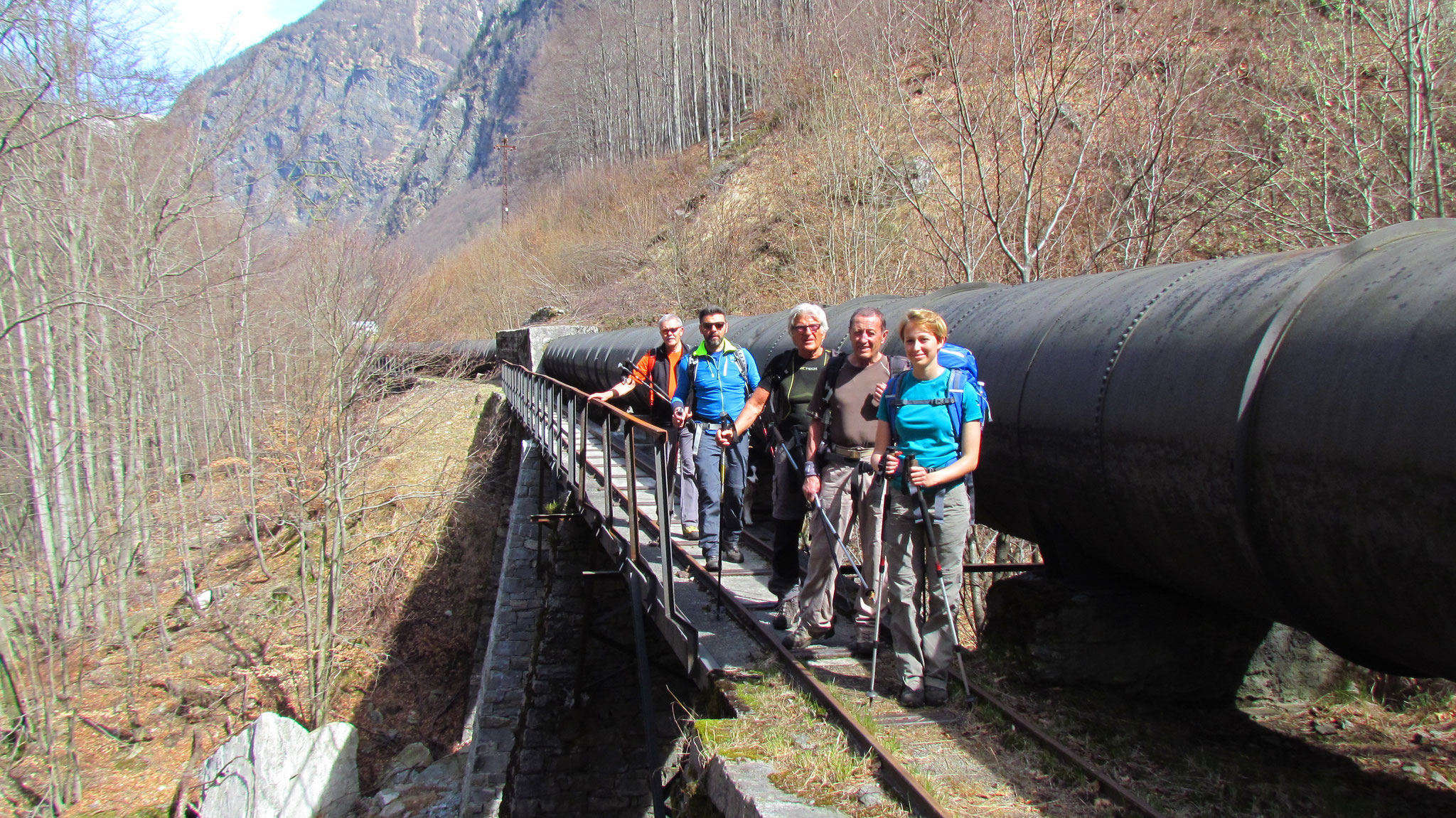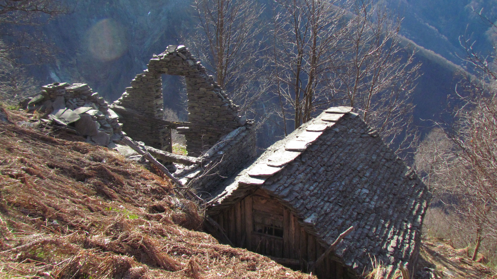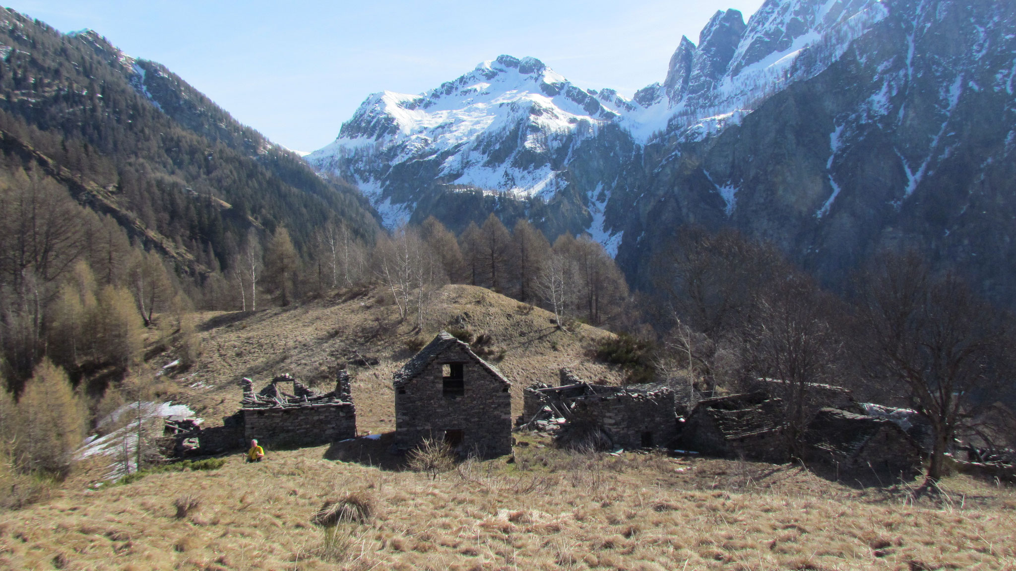 Attraversiamo il paese fino al lavatoio, poi giriamo a destra, usciamo nei prati e raggiungiamo la Cappella di Cimavalle m. 754, sono le 7,50. Prendiamo il sentiero che scende a destra della Cappella nella valle Isorno, perdiamo circa 150 metri di quota fino al ponte del Diavolo m. 600 che raggiungiamo alle 8,05. Risaliamo la sponda opposta e arriviamo alle prime baite di Aulogna alle 8,35. Saliamo fino ad arrivare alle ultime baite a quota 924 e alla casetta dei guardiani di una condotta di acqua. Sono le 8,55. Sosta per la colazione e ripartenza alle 9,10.