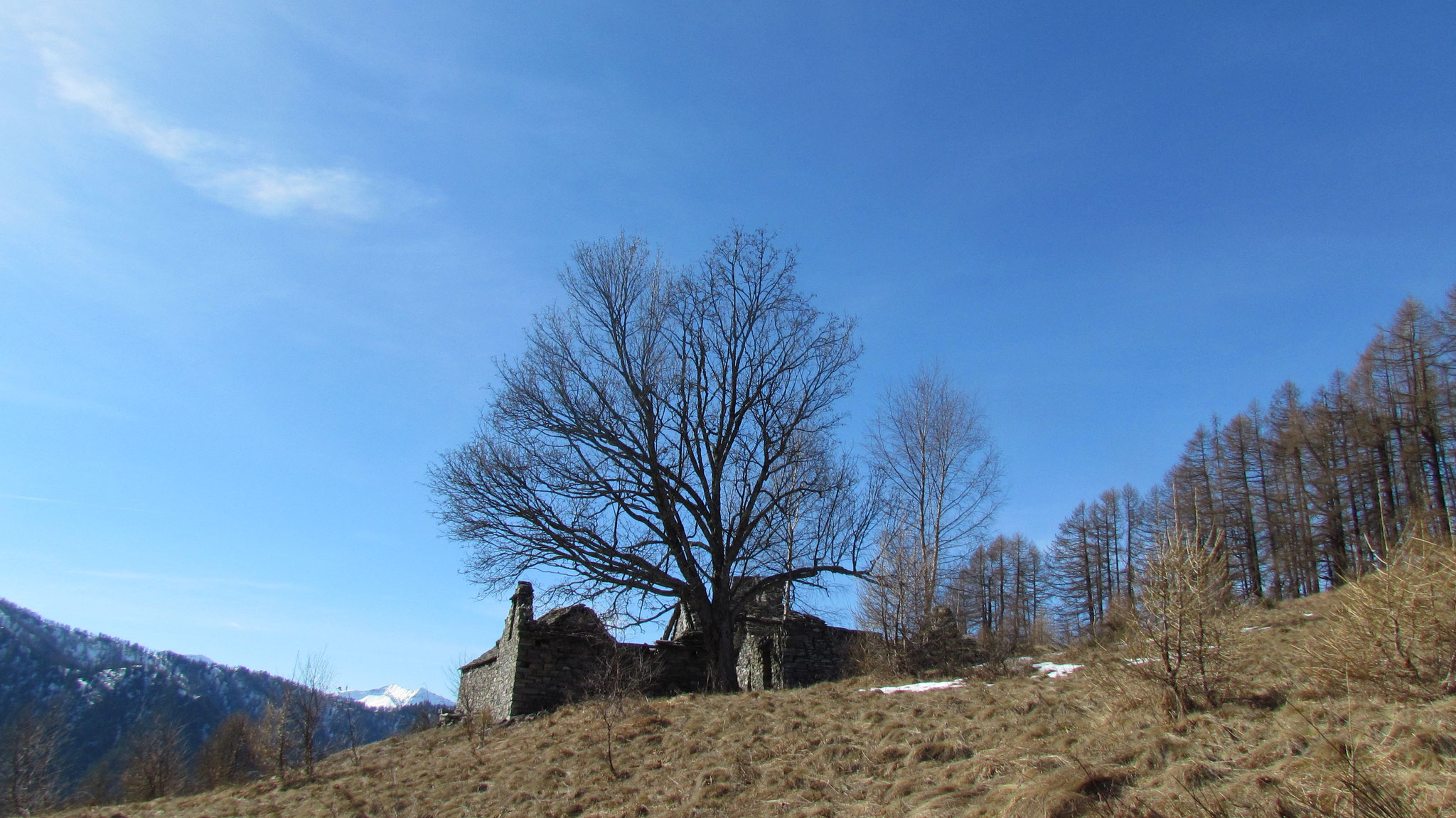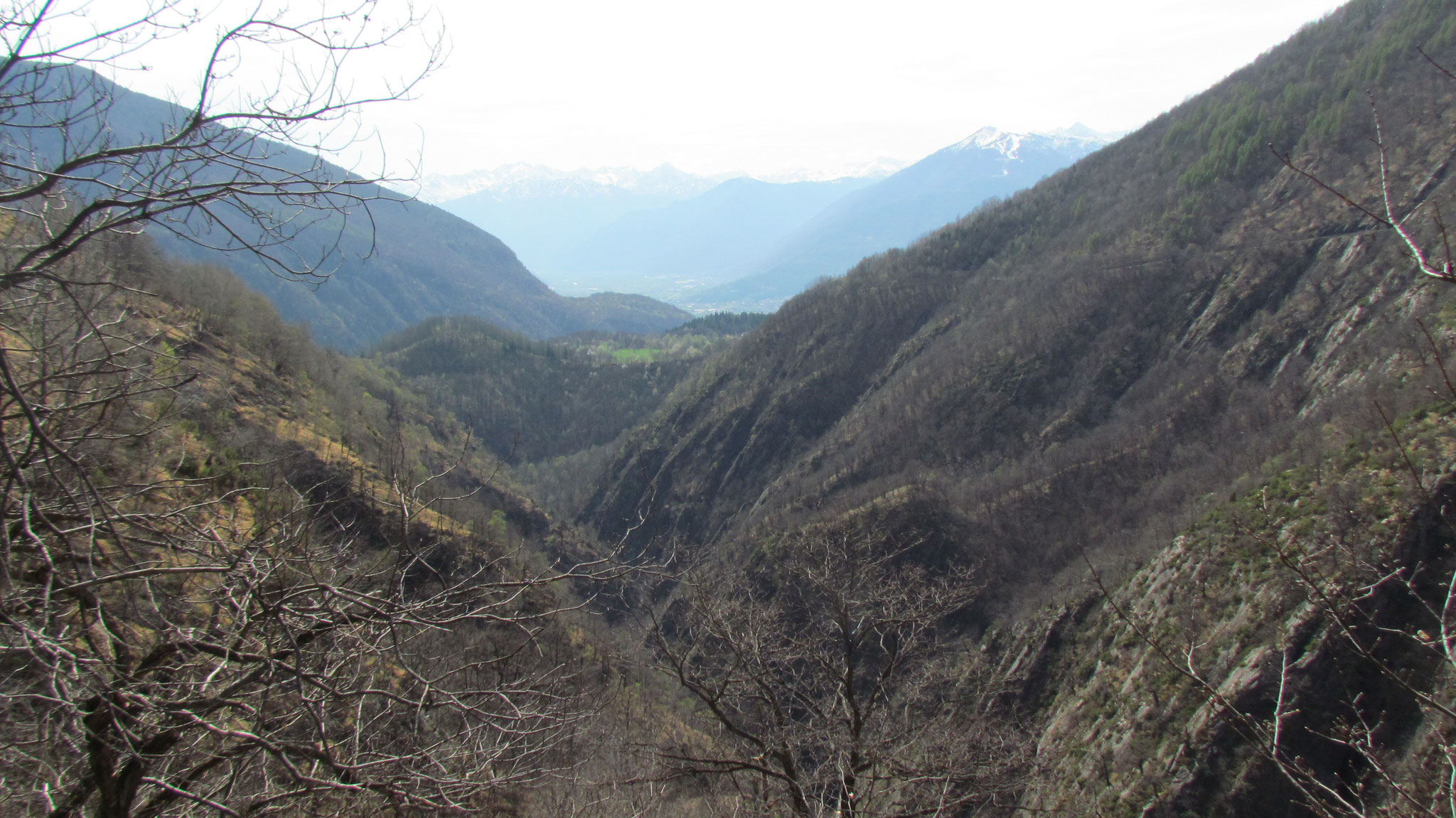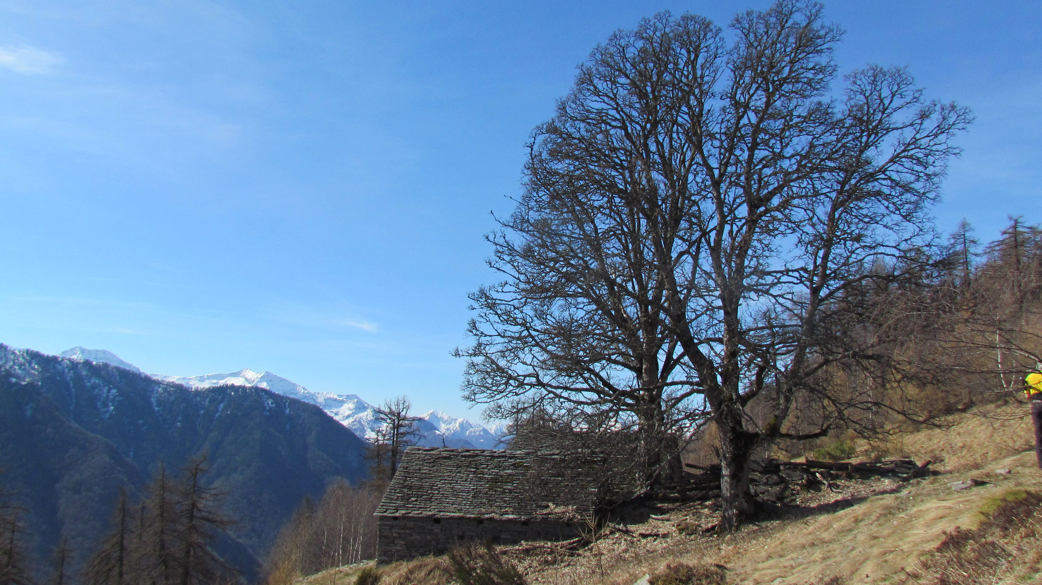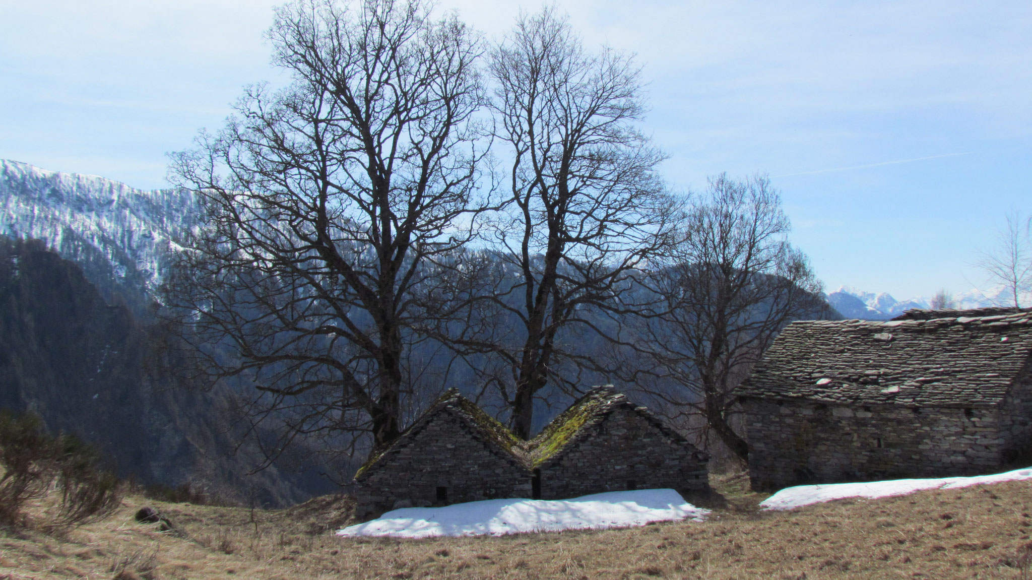 Attraversiamo il paese fino al lavatoio, poi giriamo a destra, usciamo nei prati e raggiungiamo la Cappella di Cimavalle m. 754, sono le 7,50. Prendiamo il sentiero che scende a destra della Cappella nella valle Isorno, perdiamo circa 150 metri di quota fino al ponte del Diavolo m. 600 che raggiungiamo alle 8,05. Risaliamo la sponda opposta e arriviamo alle prime baite di Aulogna alle 8,35. Saliamo fino ad arrivare alle ultime baite a quota 924 e alla casetta dei guardiani di una condotta di acqua. Sono le 8,55. Sosta per la colazione e ripartenza alle 9,10.