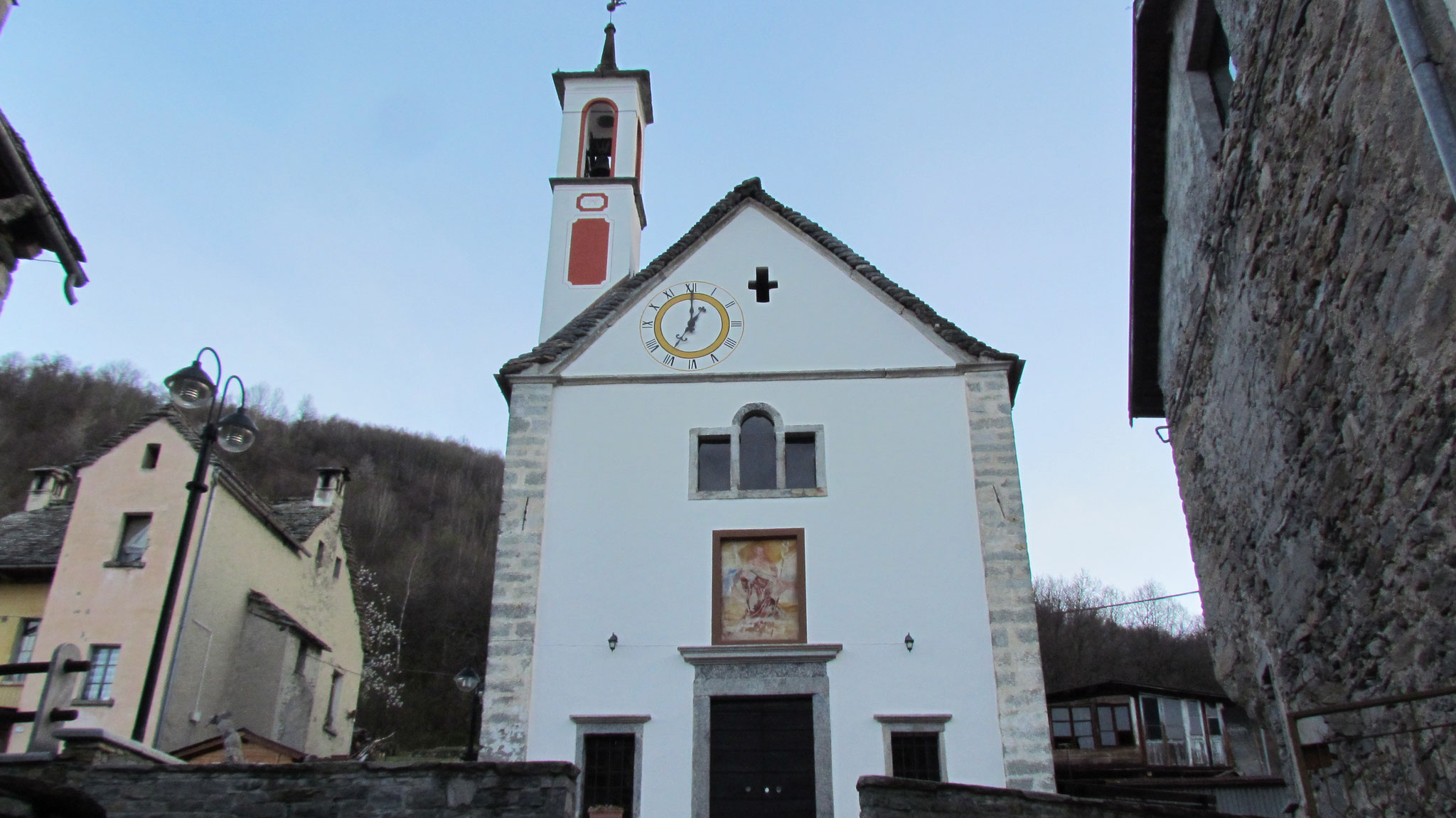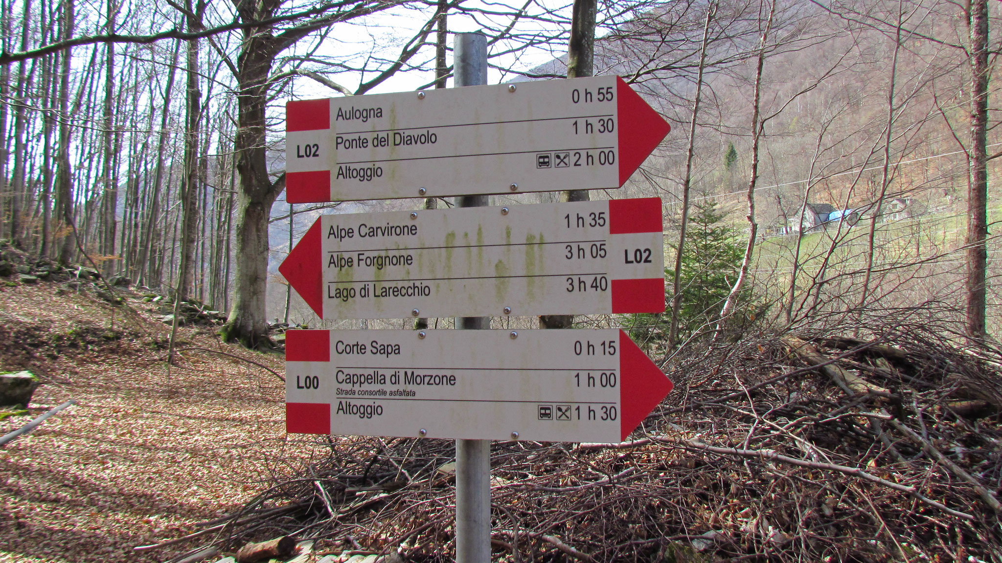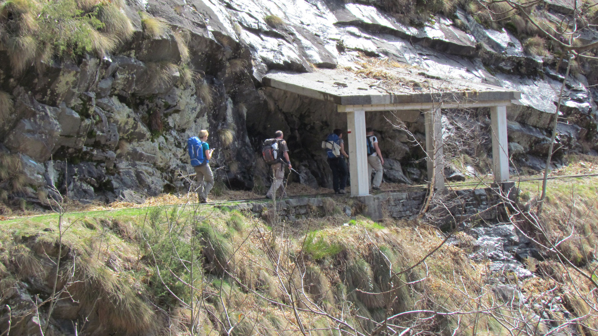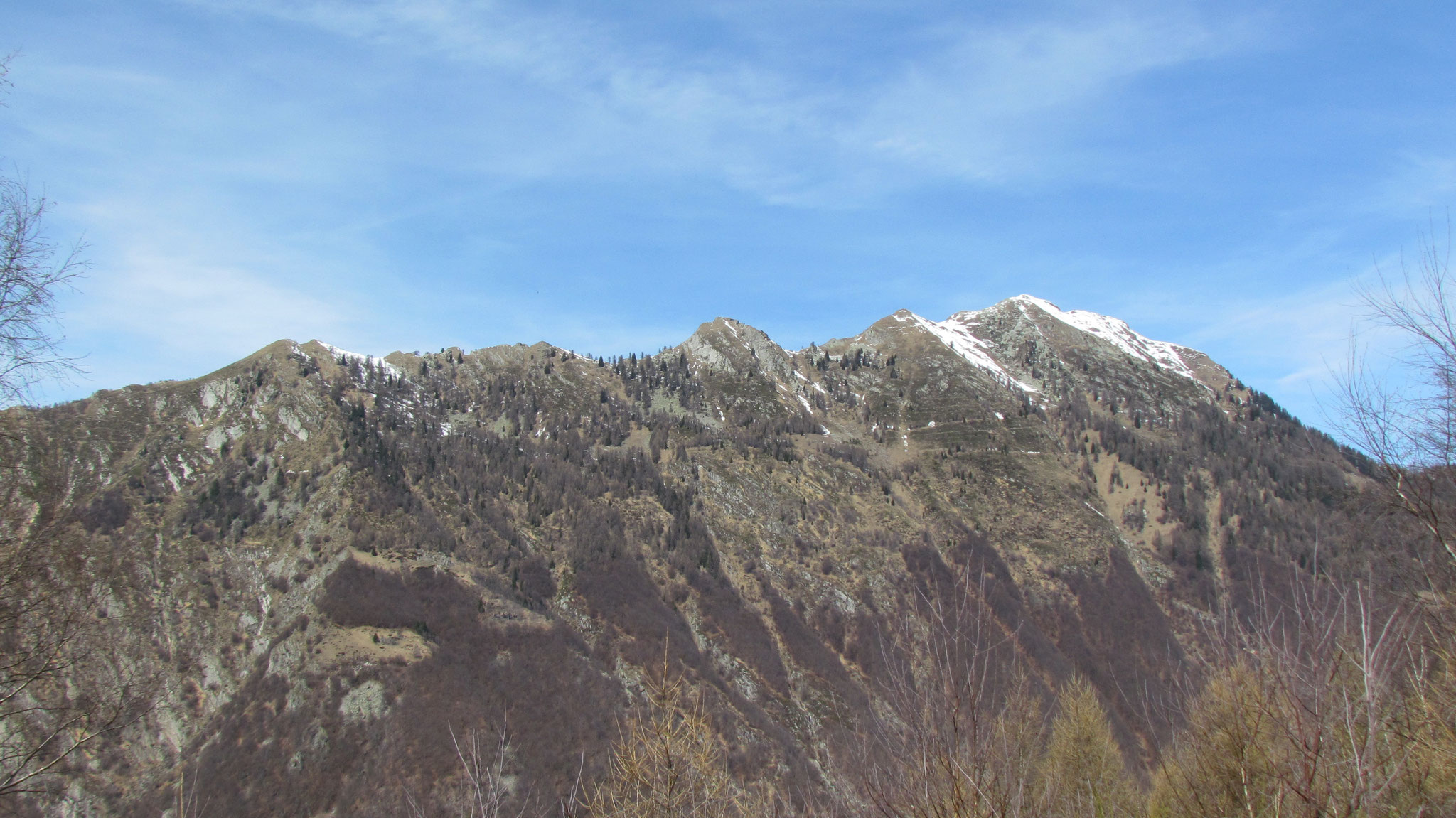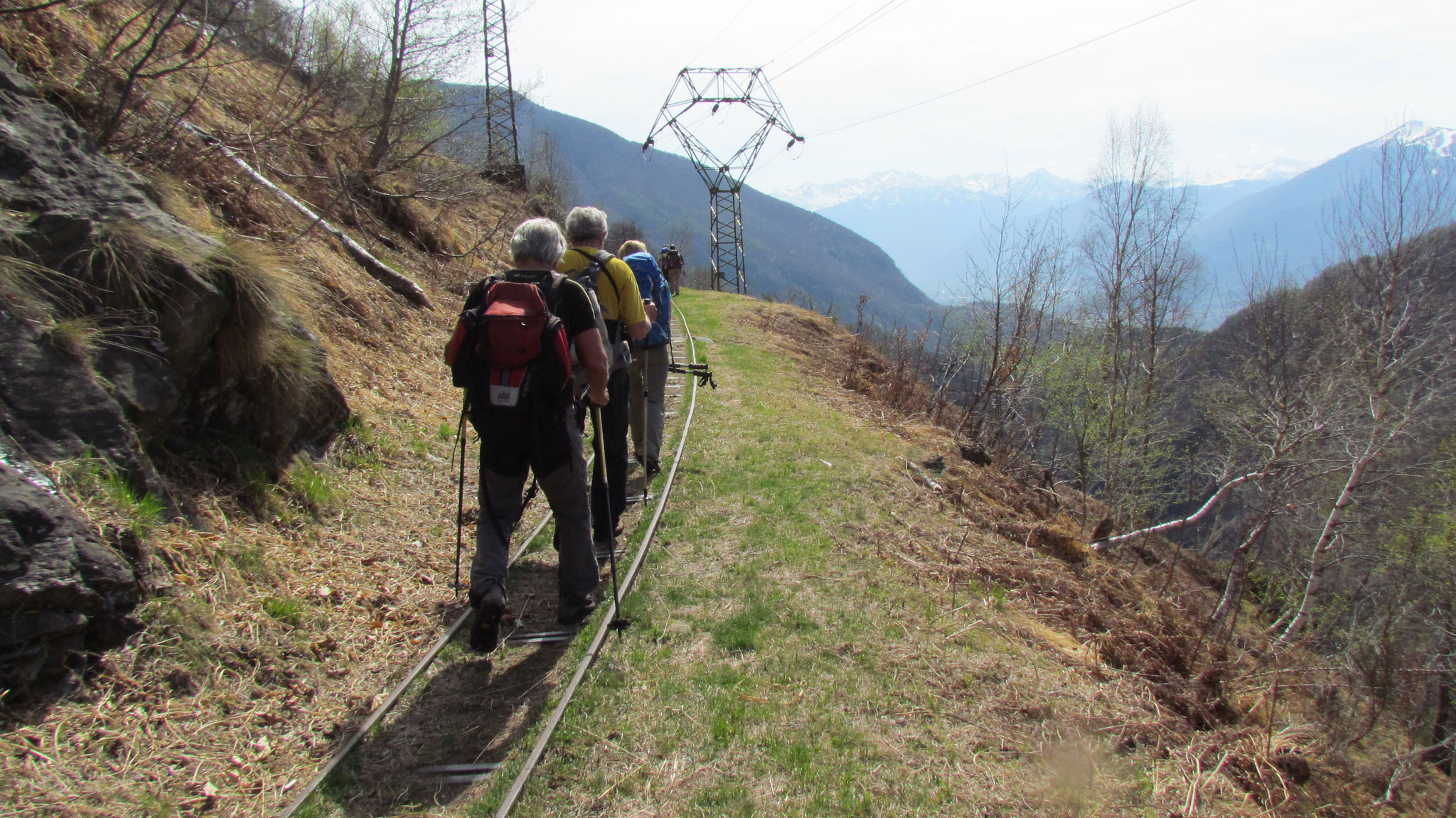 Attraversiamo il paese fino al lavatoio, poi giriamo a destra, usciamo nei prati e raggiungiamo la Cappella di Cimavalle m. 754, sono le 7,50. Prendiamo il sentiero che scende a destra della Cappella nella valle Isorno, perdiamo circa 150 metri di quota fino al ponte del Diavolo m. 600 che raggiungiamo alle 8,05. Risaliamo la sponda opposta e arriviamo alle prime baite di Aulogna alle 8,35. Saliamo fino ad arrivare alle ultime baite a quota 924 e alla casetta dei guardiani di una condotta di acqua. Sono le 8,55. Sosta per la colazione e ripartenza alle 9,10.