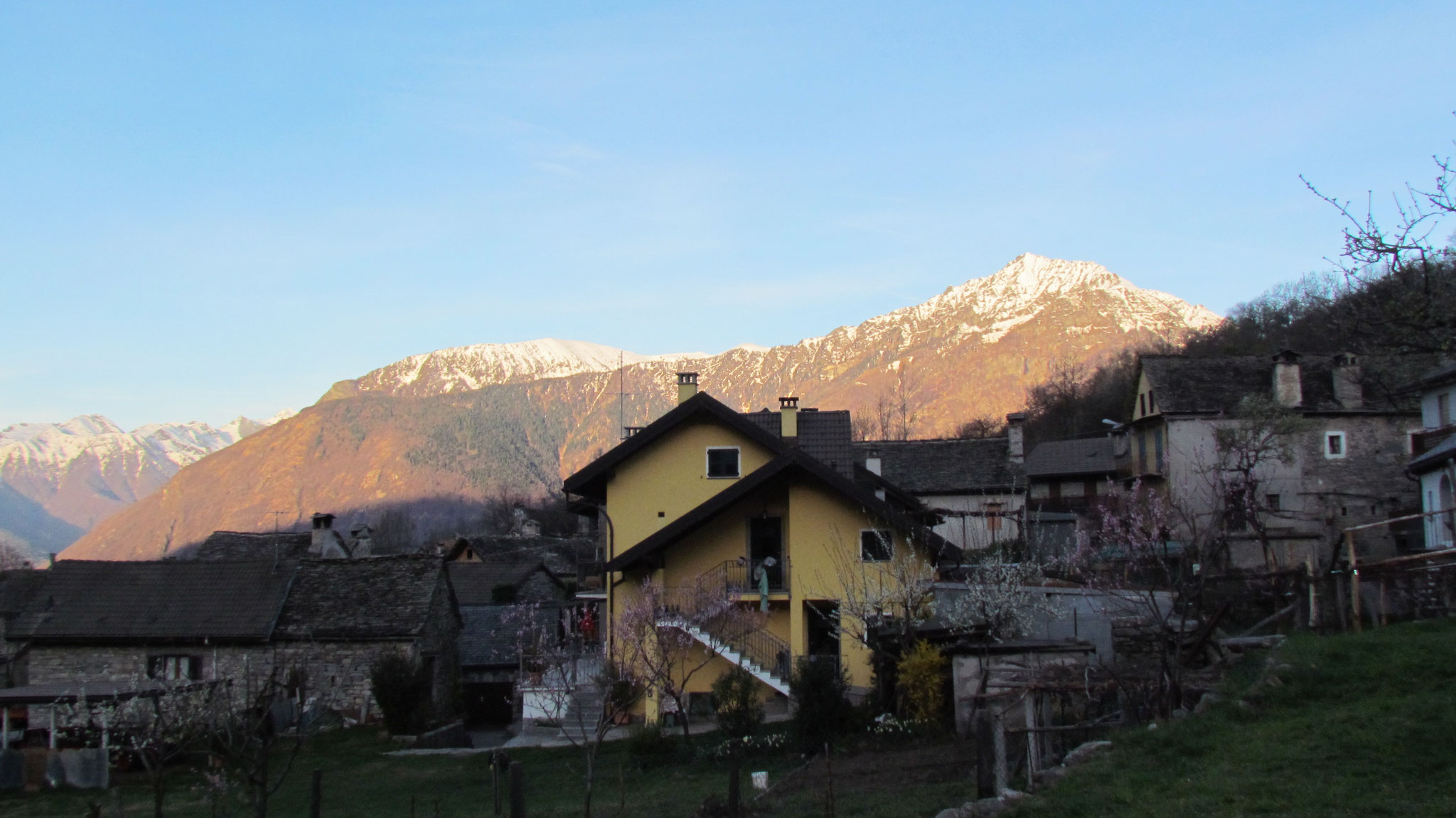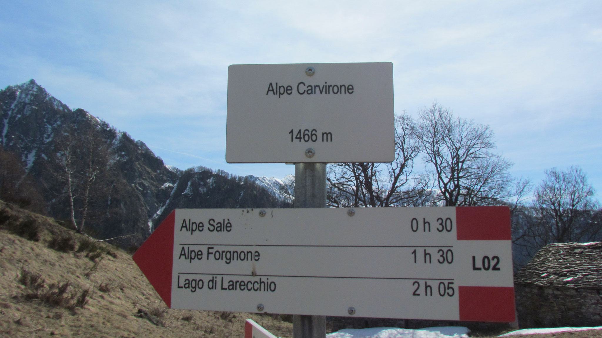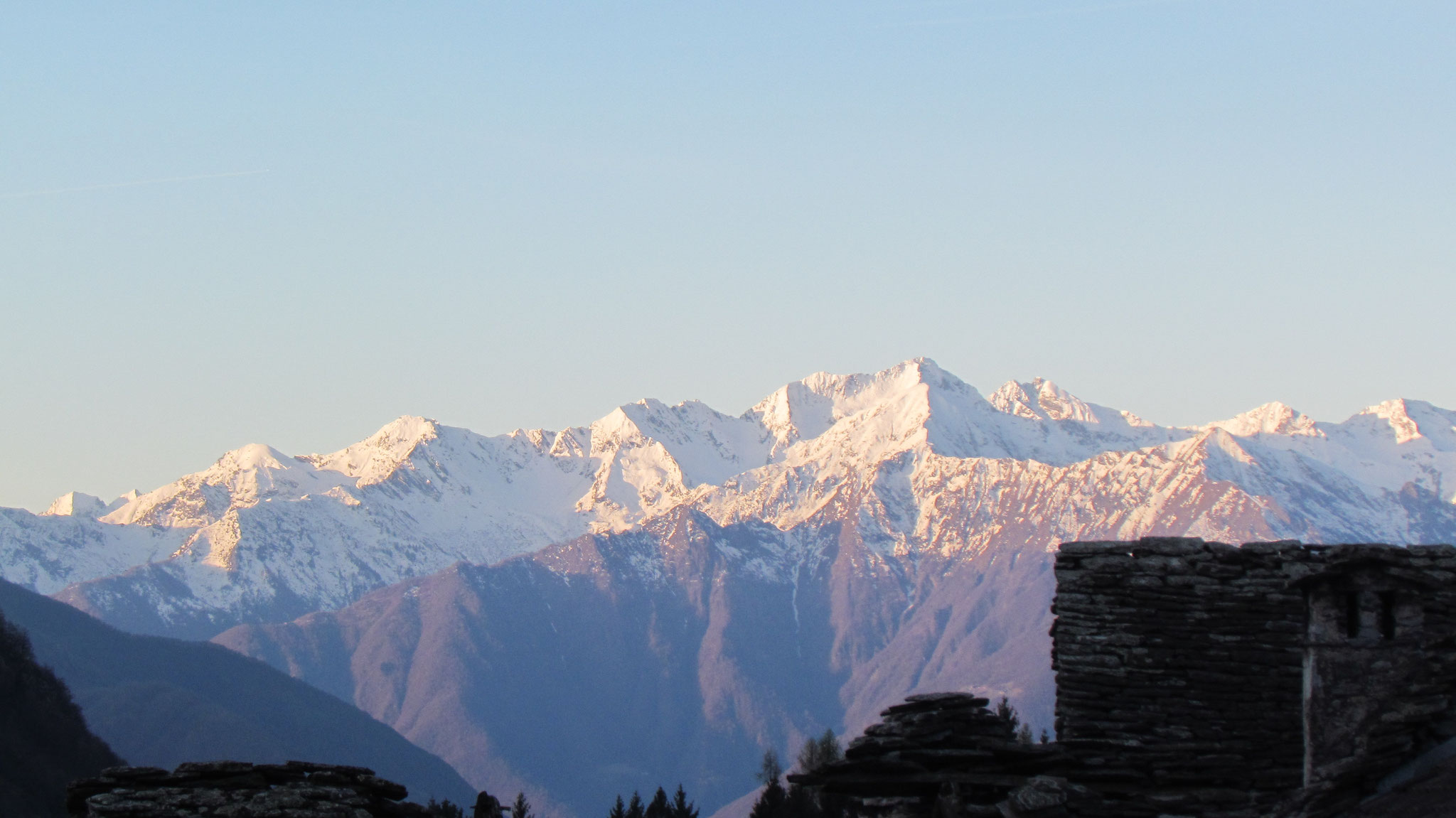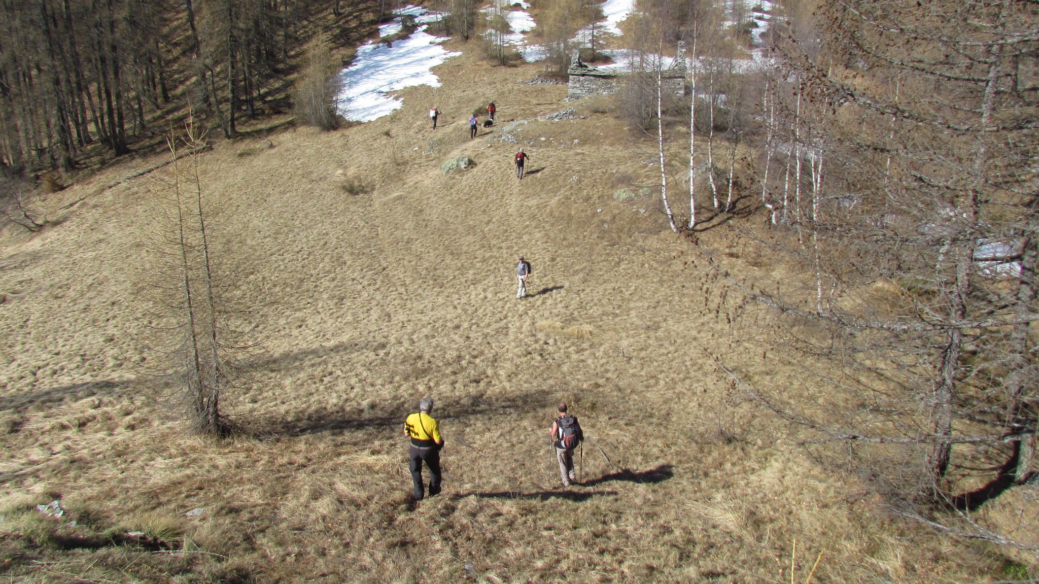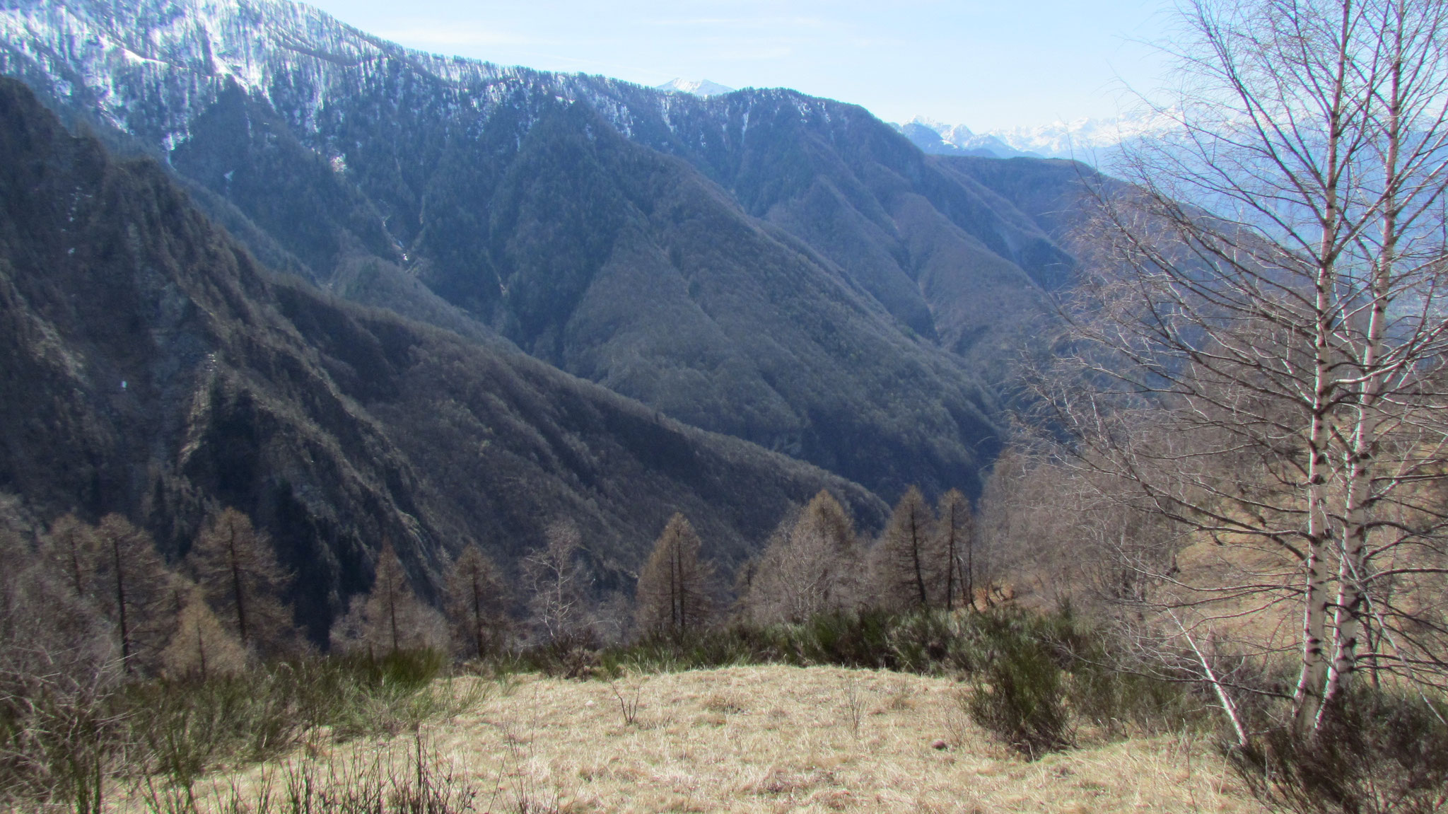 Attraversiamo il paese fino al lavatoio, poi giriamo a destra, usciamo nei prati e raggiungiamo la Cappella di Cimavalle m. 754, sono le 7,50. Prendiamo il sentiero che scende a destra della Cappella nella valle Isorno, perdiamo circa 150 metri di quota fino al ponte del Diavolo m. 600 che raggiungiamo alle 8,05. Risaliamo la sponda opposta e arriviamo alle prime baite di Aulogna alle 8,35. Saliamo fino ad arrivare alle ultime baite a quota 924 e alla casetta dei guardiani di una condotta di acqua. Sono le 8,55. Sosta per la colazione e ripartenza alle 9,10.