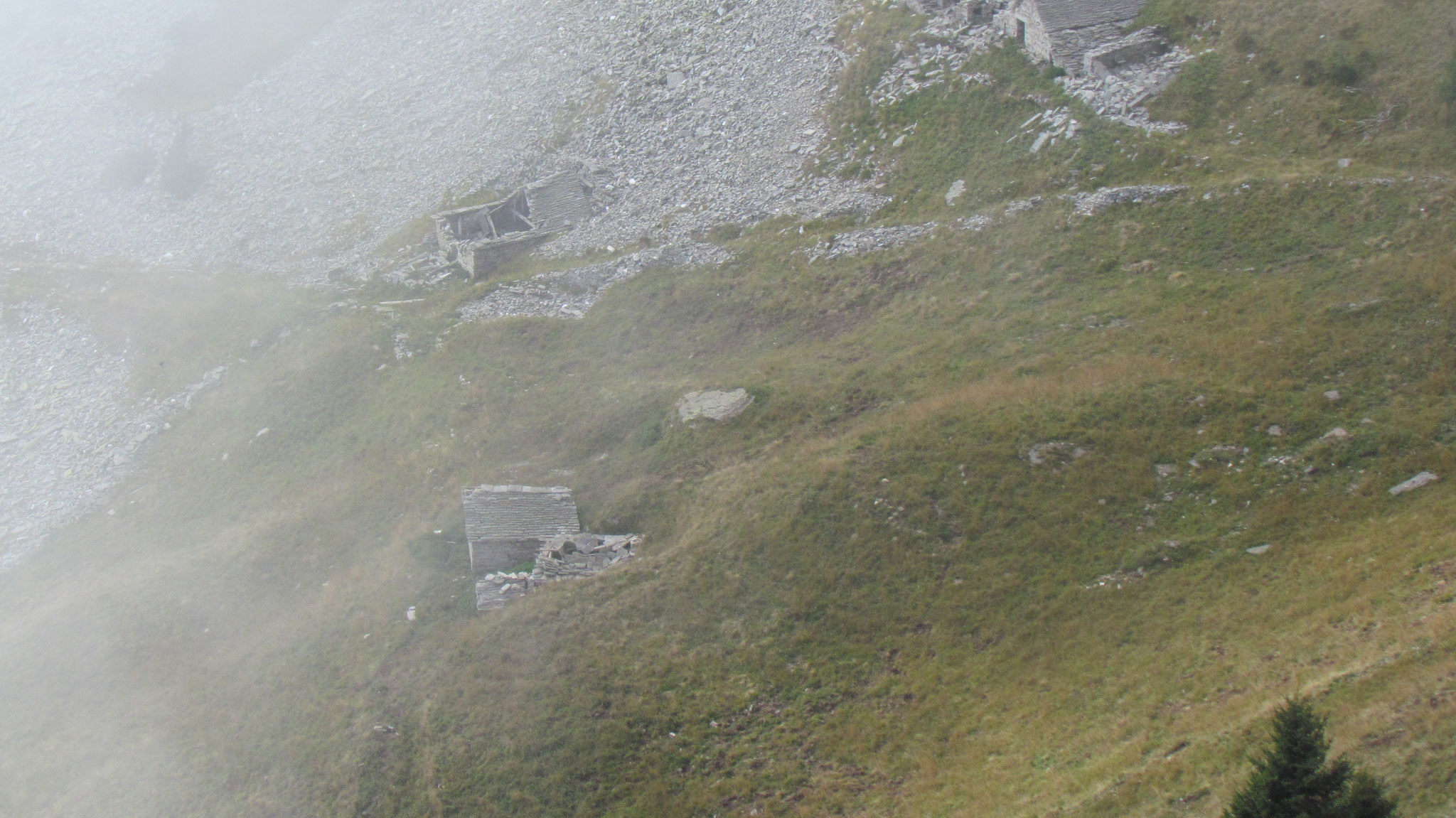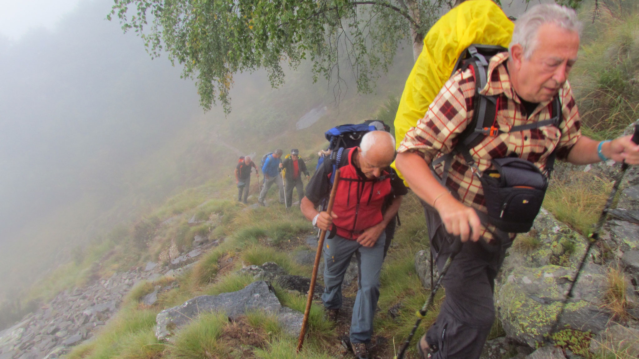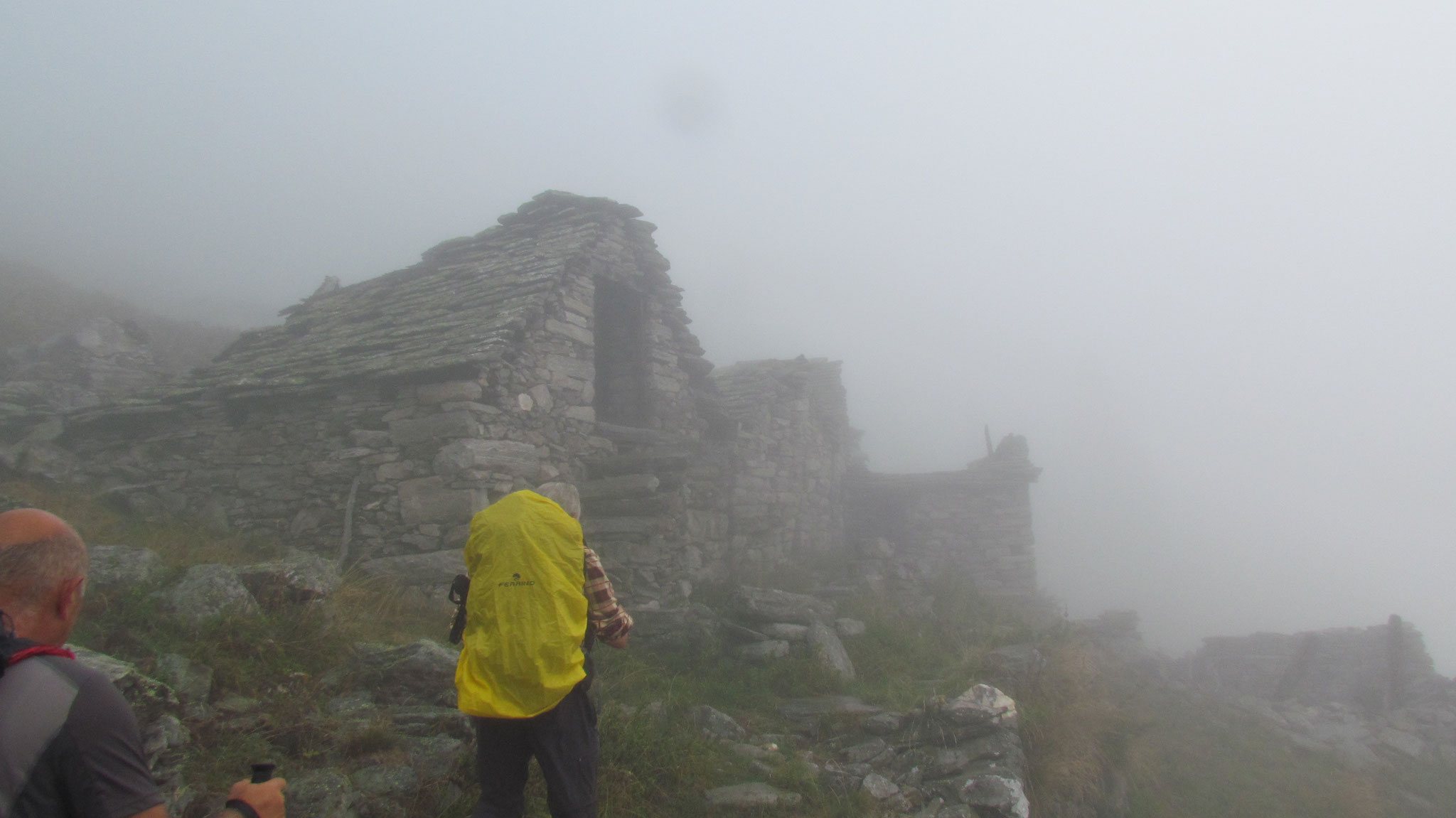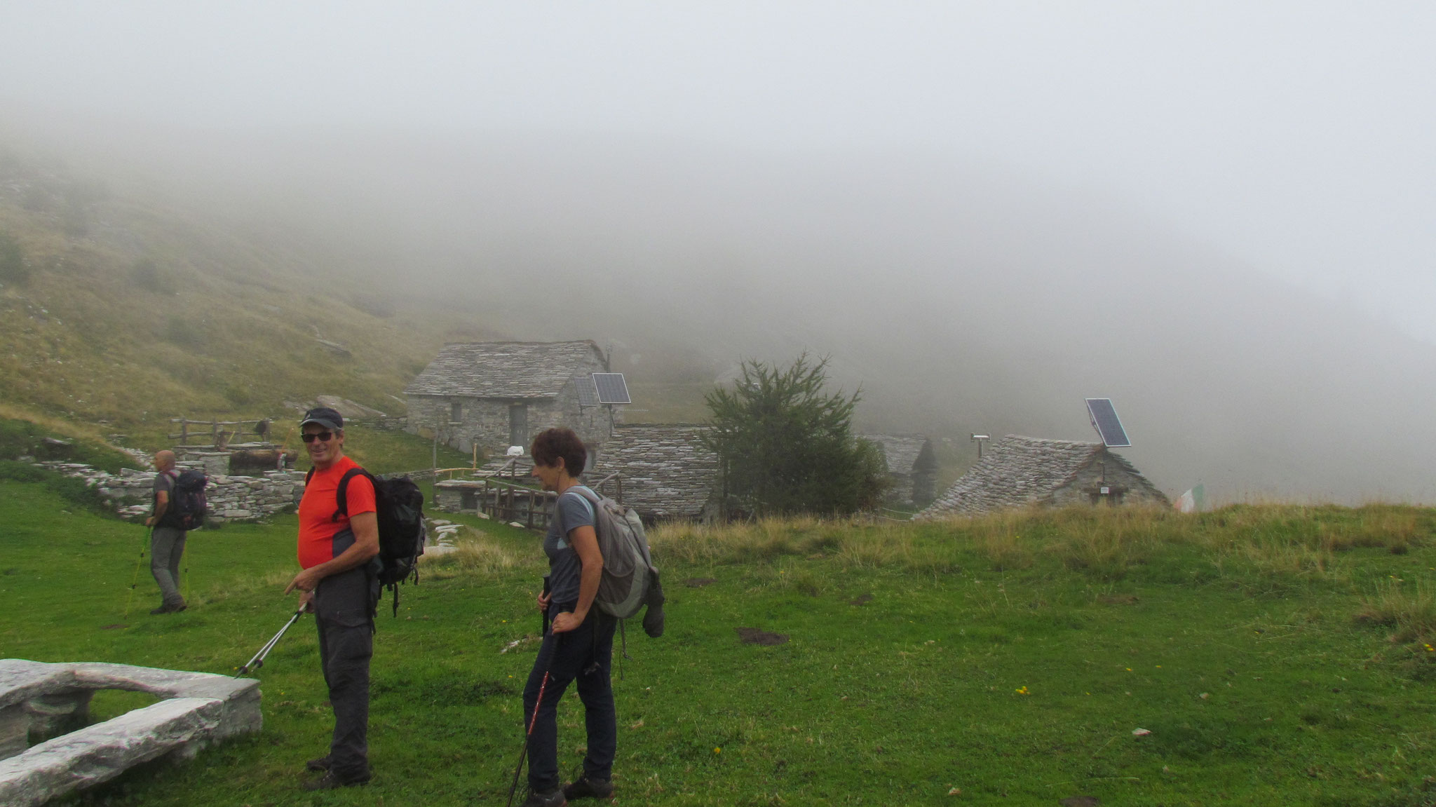 Saliamo gradatamente con lunghi tratti in falsopiano. Superiamo un alpeggio diroccato alle 8,45 e alle 9,50 ci fermiamo per la colazione, siamo sempre nella nebbia. Ripartiamo alle 10,00. Poco dopo arriviamo in cresta, sulla destra la val Isorno, immersa nella nebbia, sulla sinistra la valle Antigorio, con la nebbia in basso ma cielo limpido in alto. Si vedono i 4000 e il Cervandone (vedi fotogallery).