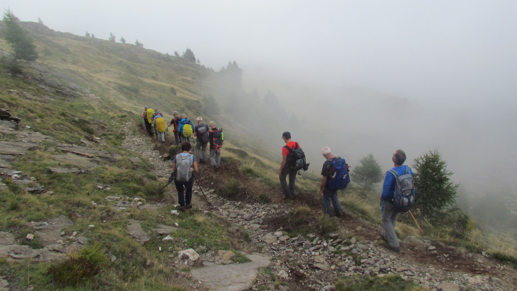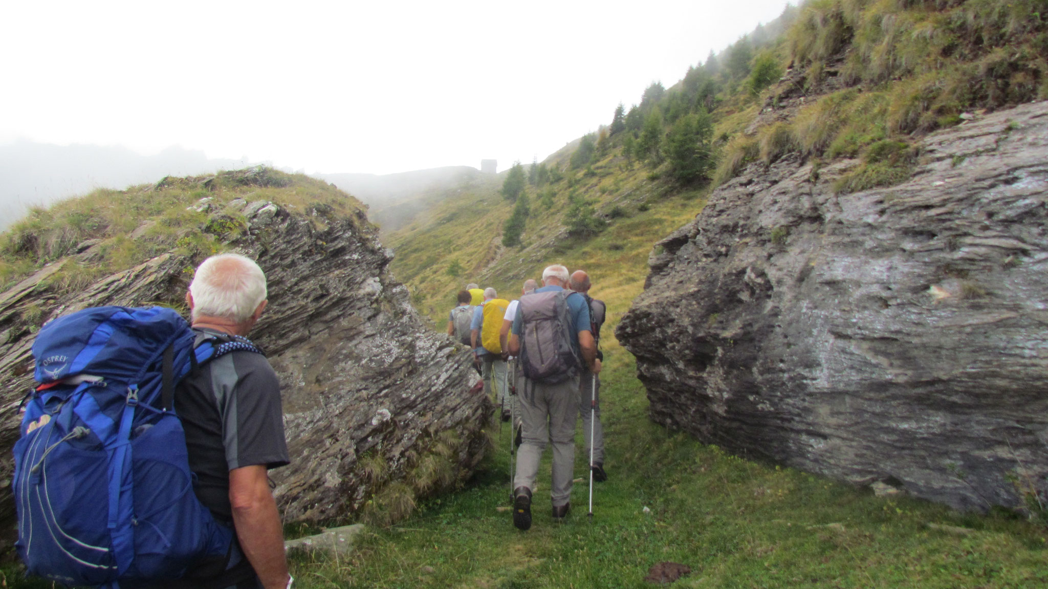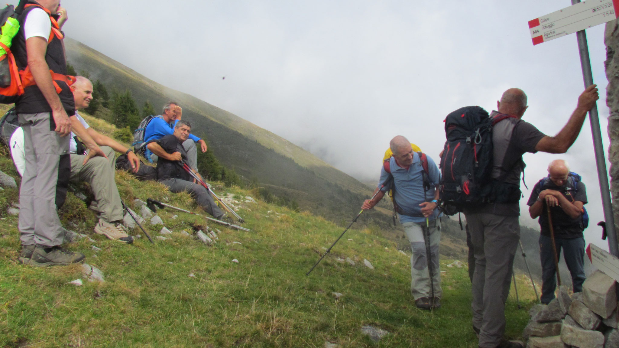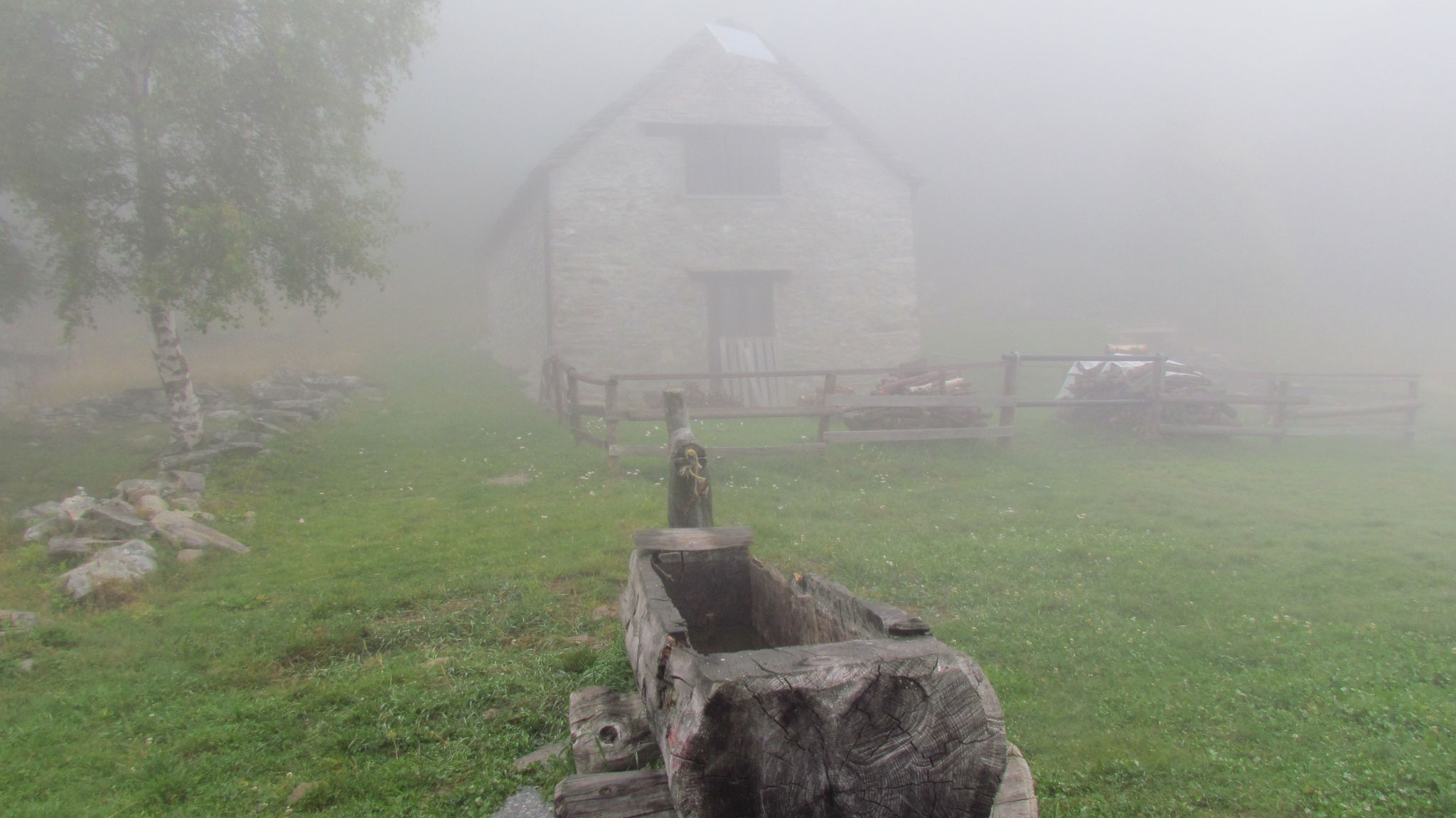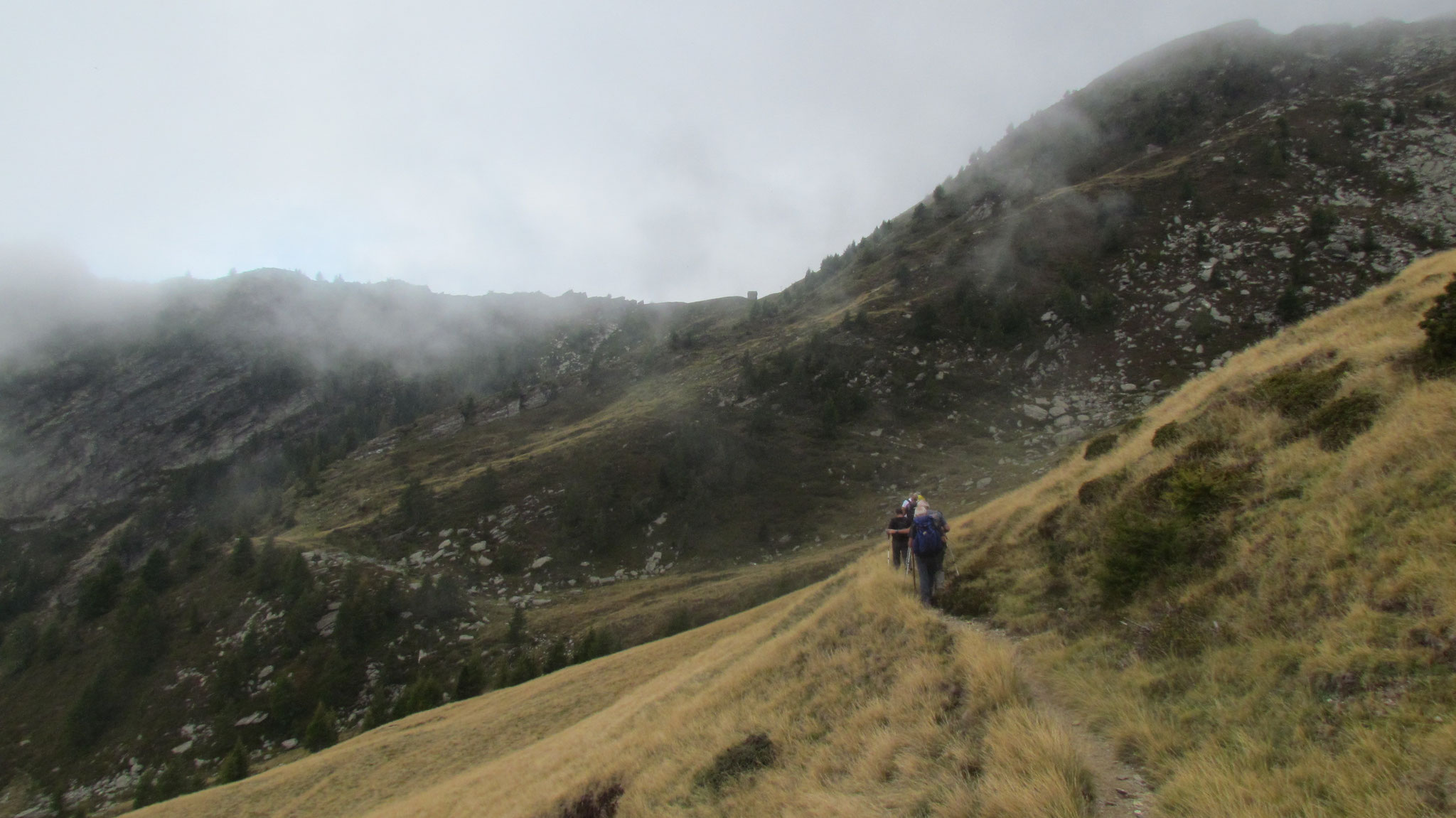 Saliamo gradatamente con lunghi tratti in falsopiano. Superiamo un alpeggio diroccato alle 8,45 e alle 9,50 ci fermiamo per la colazione, siamo sempre nella nebbia. Ripartiamo alle 10,00. Poco dopo arriviamo in cresta, sulla destra la val Isorno, immersa nella nebbia, sulla sinistra la valle Antigorio, con la nebbia in basso ma cielo limpido in alto. Si vedono i 4000 e il Cervandone (vedi fotogallery).