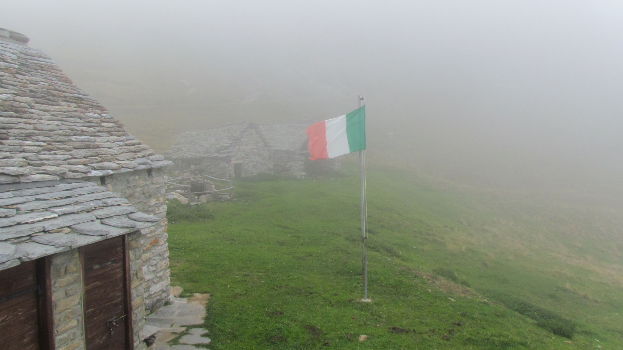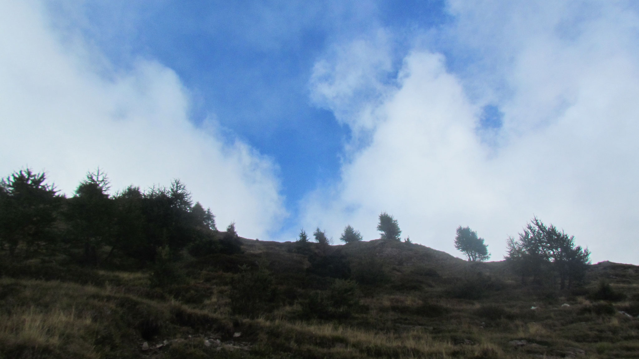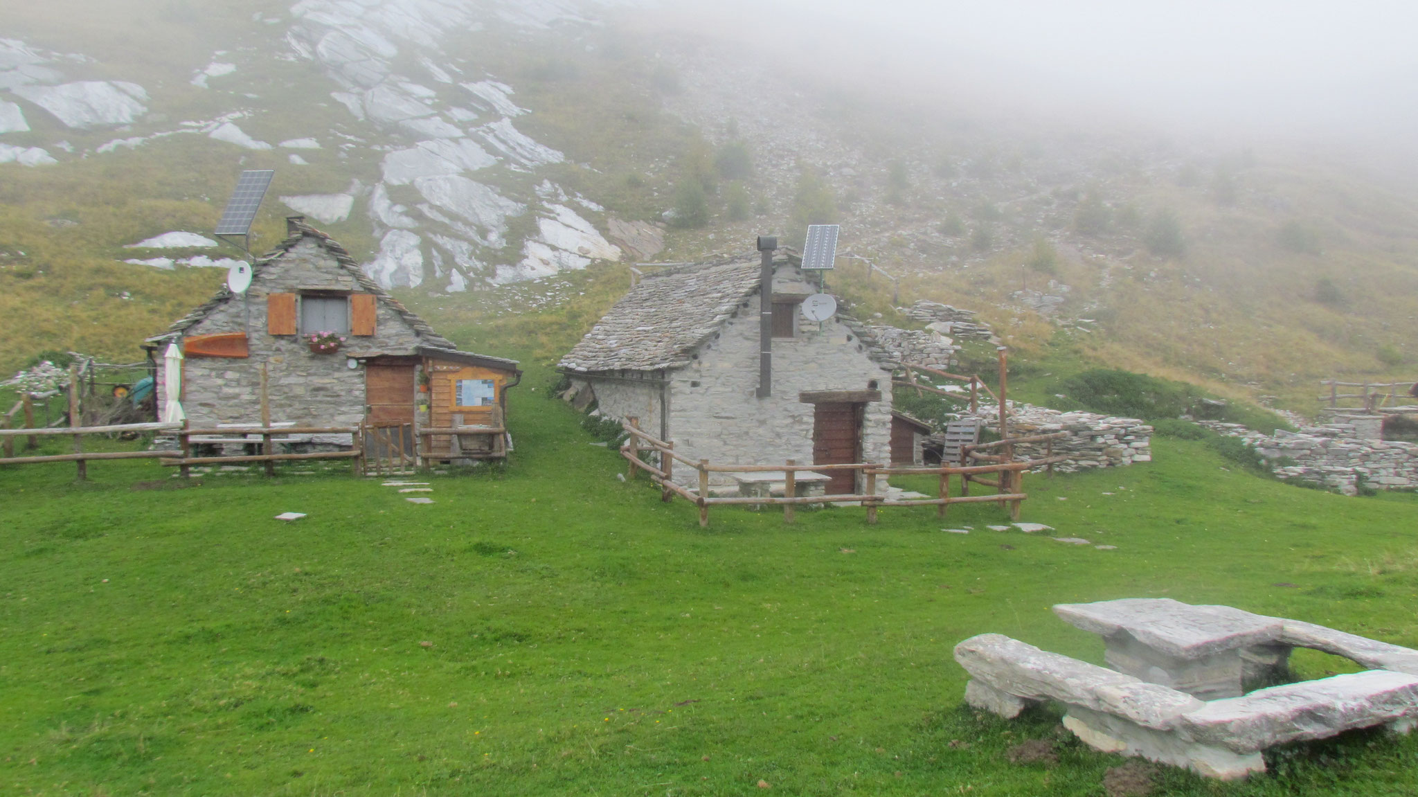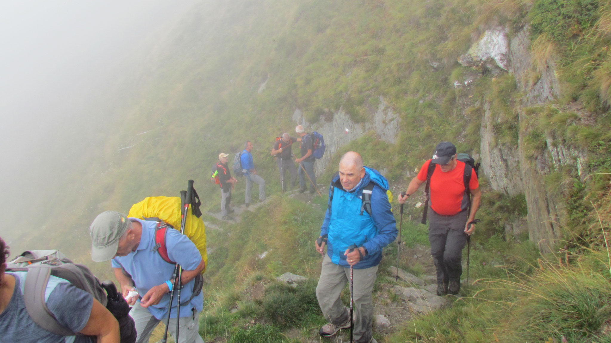 Saliamo gradatamente con lunghi tratti in falsopiano. Superiamo un alpeggio diroccato alle 8,45 e alle 9,50 ci fermiamo per la colazione, siamo sempre nella nebbia. Ripartiamo alle 10,00. Poco dopo arriviamo in cresta, sulla destra la val Isorno, immersa nella nebbia, sulla sinistra la valle Antigorio, con la nebbia in basso ma cielo limpido in alto. Si vedono i 4000 e il Cervandone (vedi fotogallery).