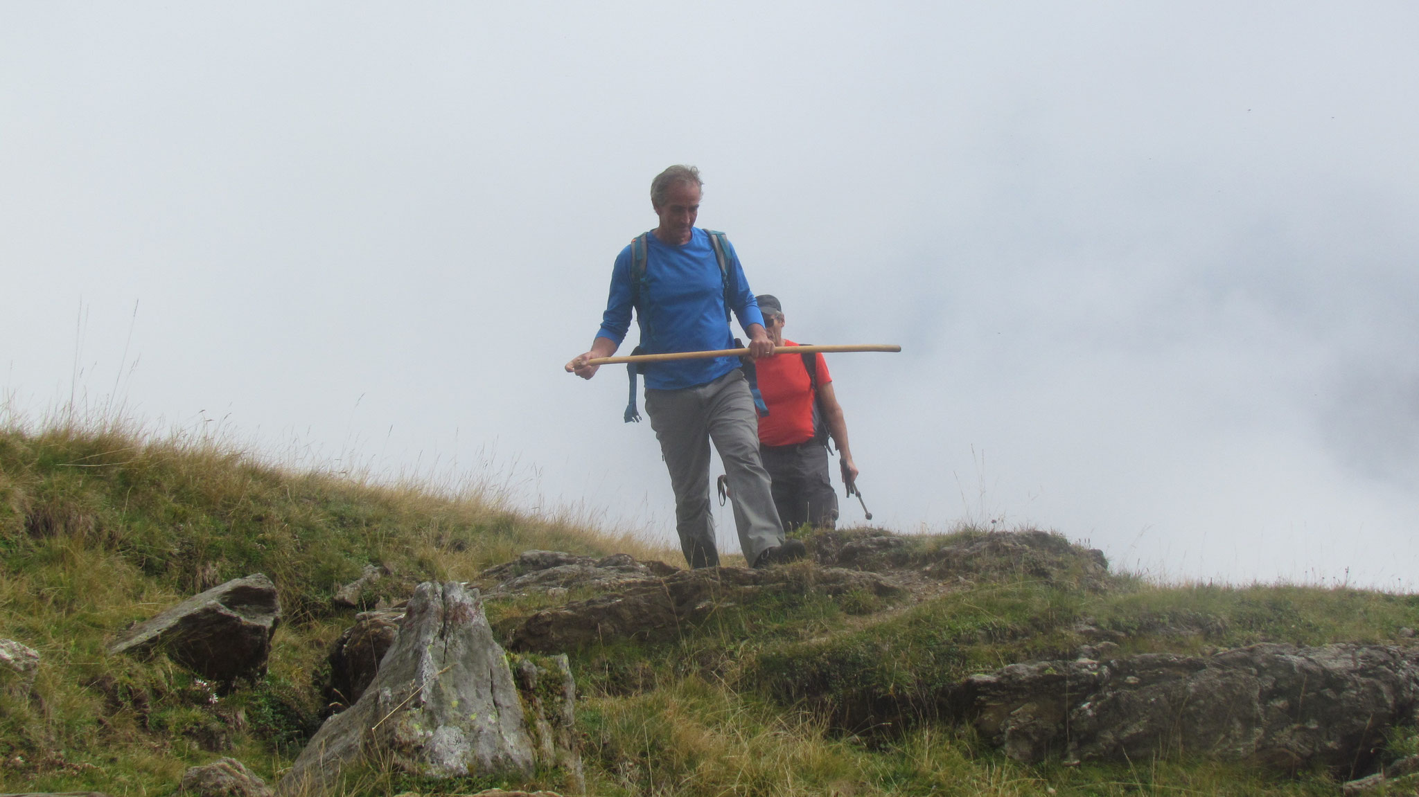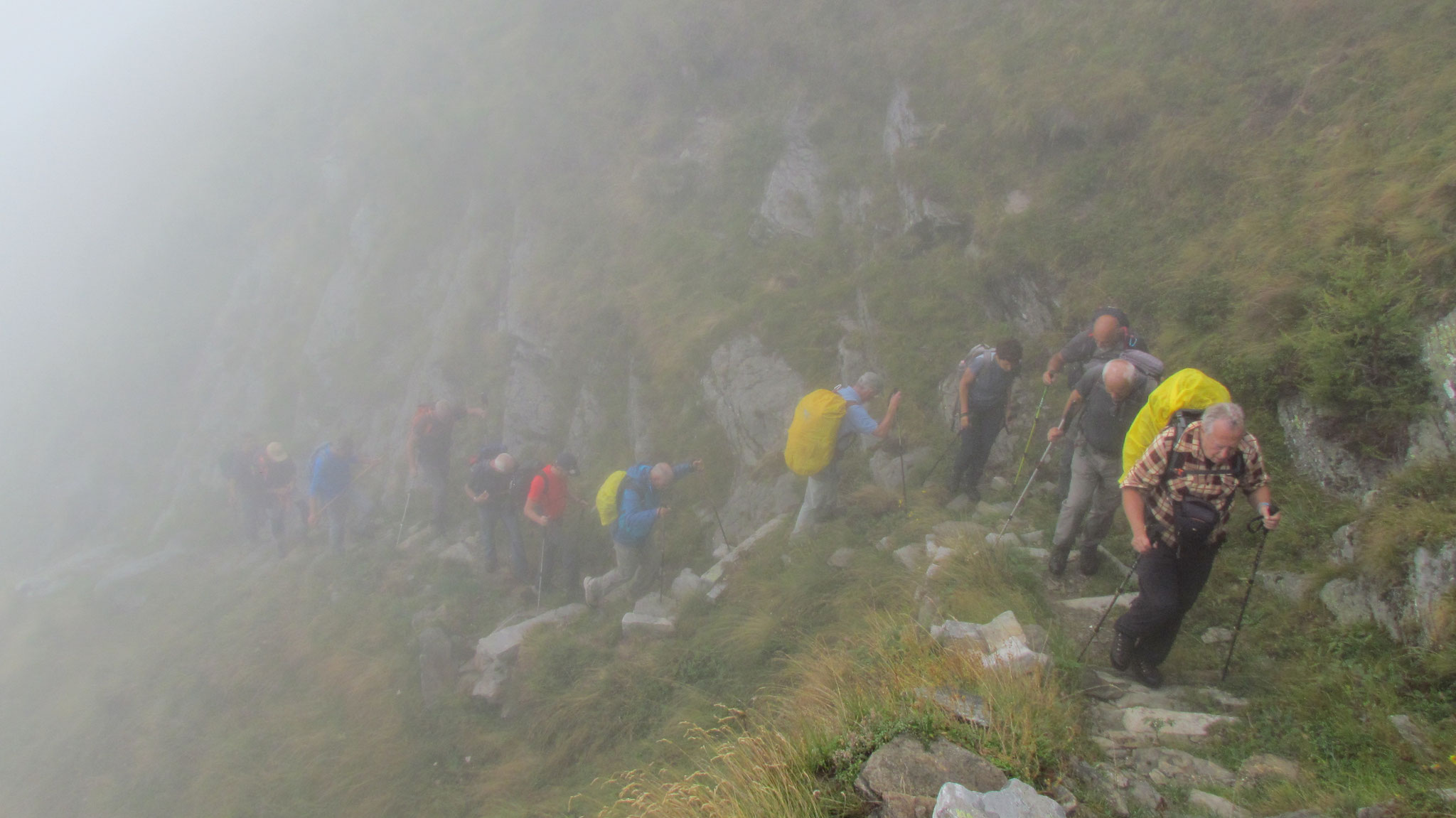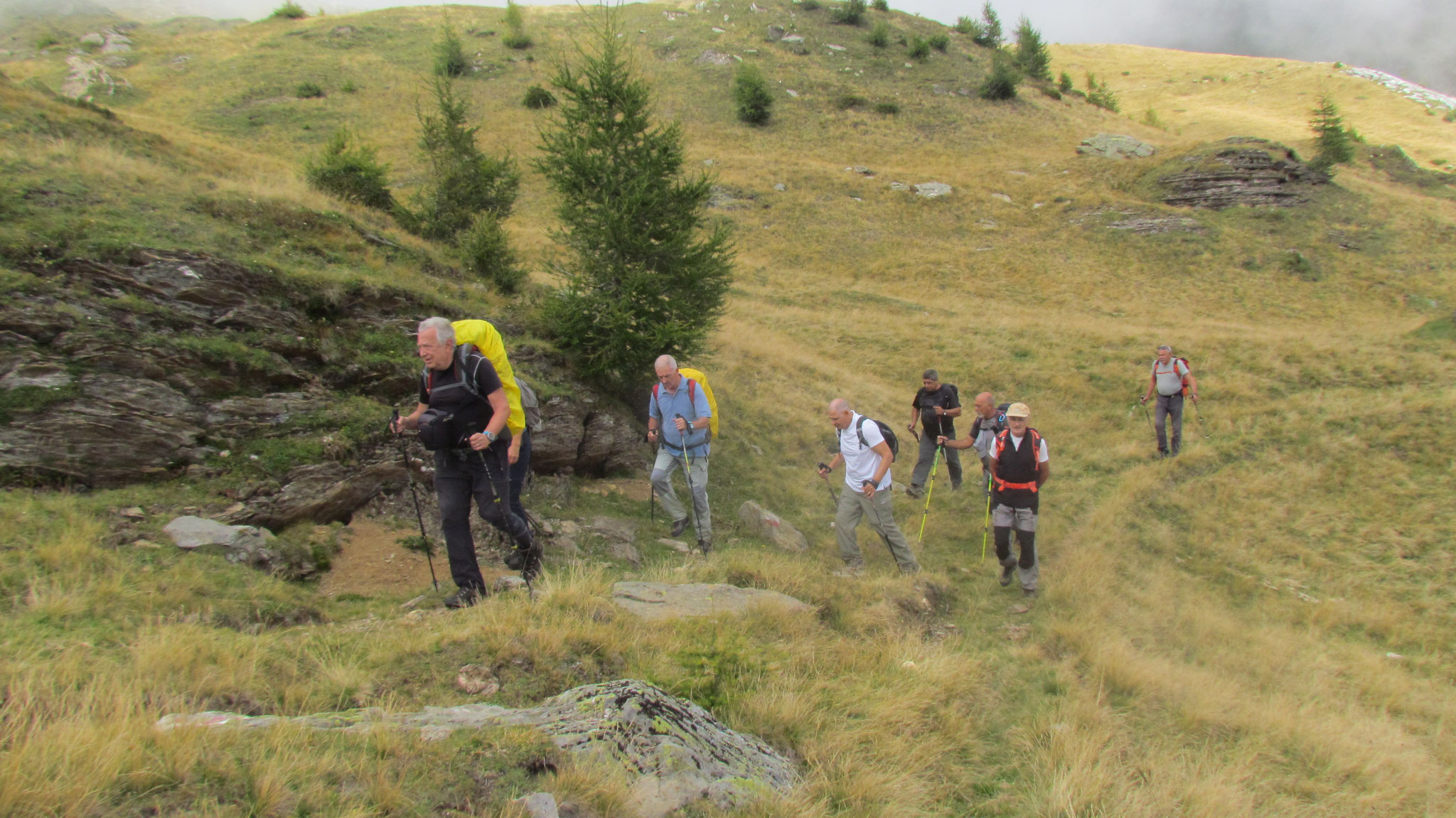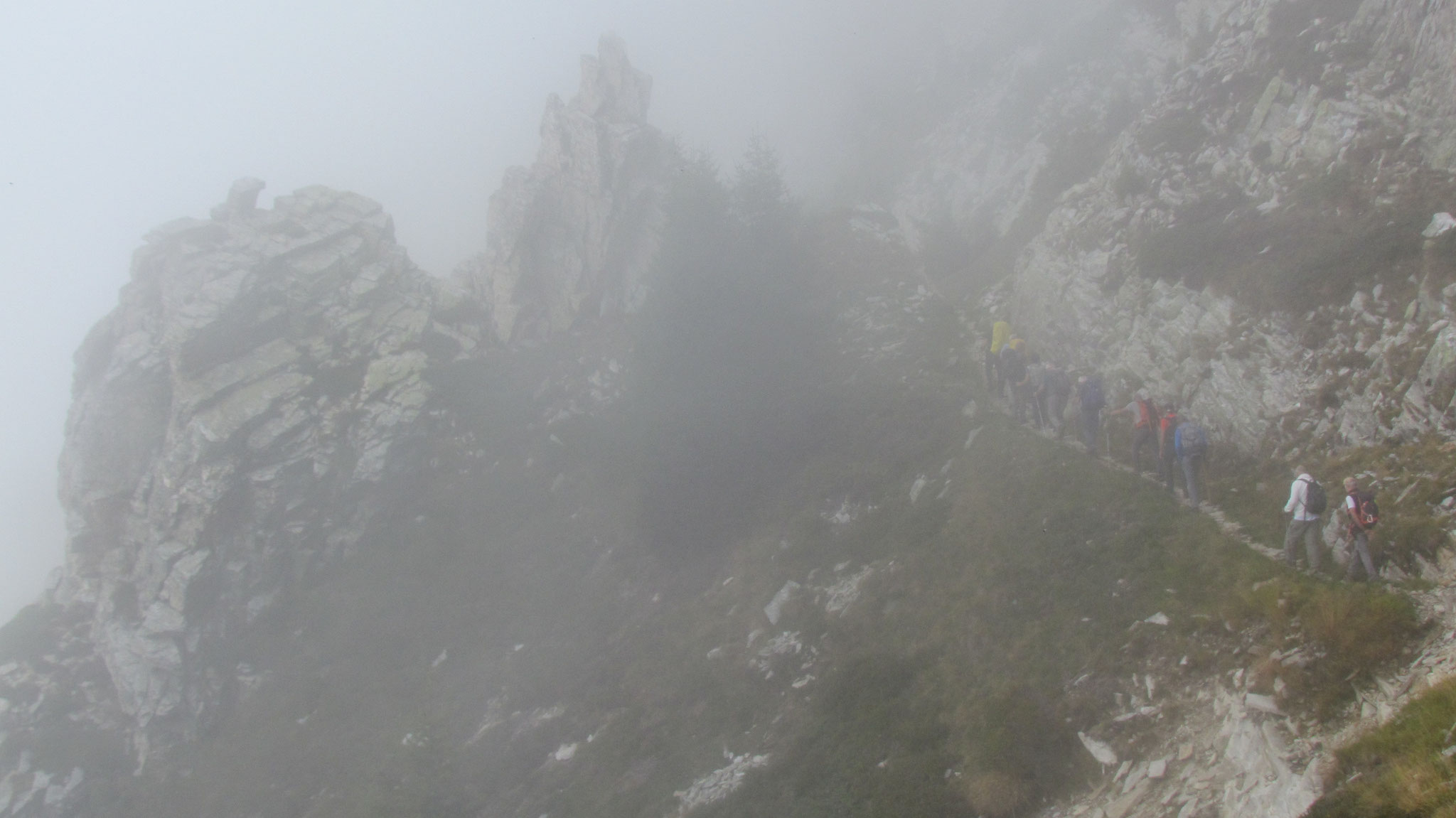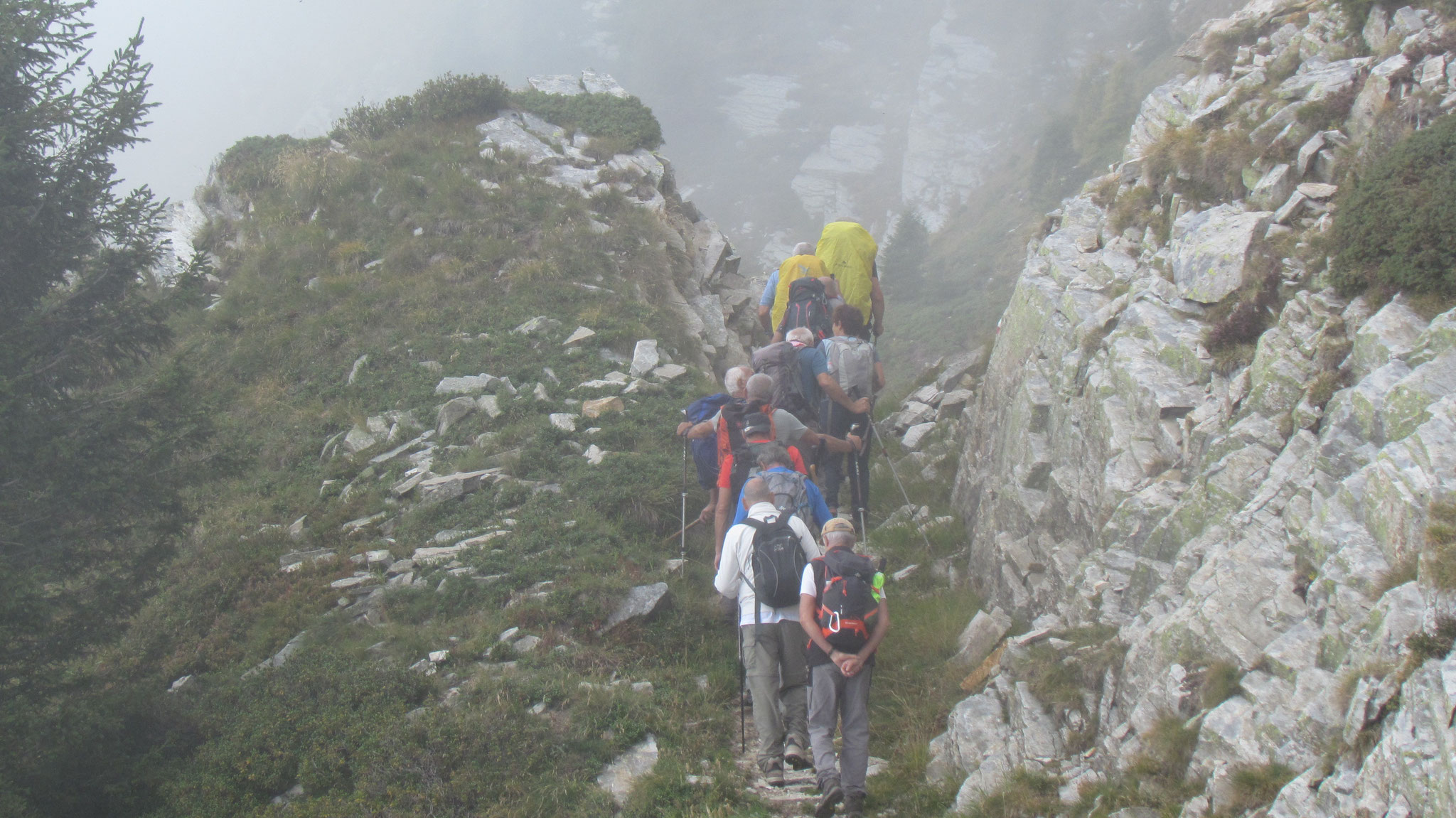 Saliamo gradatamente con lunghi tratti in falsopiano. Superiamo un alpeggio diroccato alle 8,45 e alle 9,50 ci fermiamo per la colazione, siamo sempre nella nebbia. Ripartiamo alle 10,00. Poco dopo arriviamo in cresta, sulla destra la val Isorno, immersa nella nebbia, sulla sinistra la valle Antigorio, con la nebbia in basso ma cielo limpido in alto. Si vedono i 4000 e il Cervandone (vedi fotogallery).