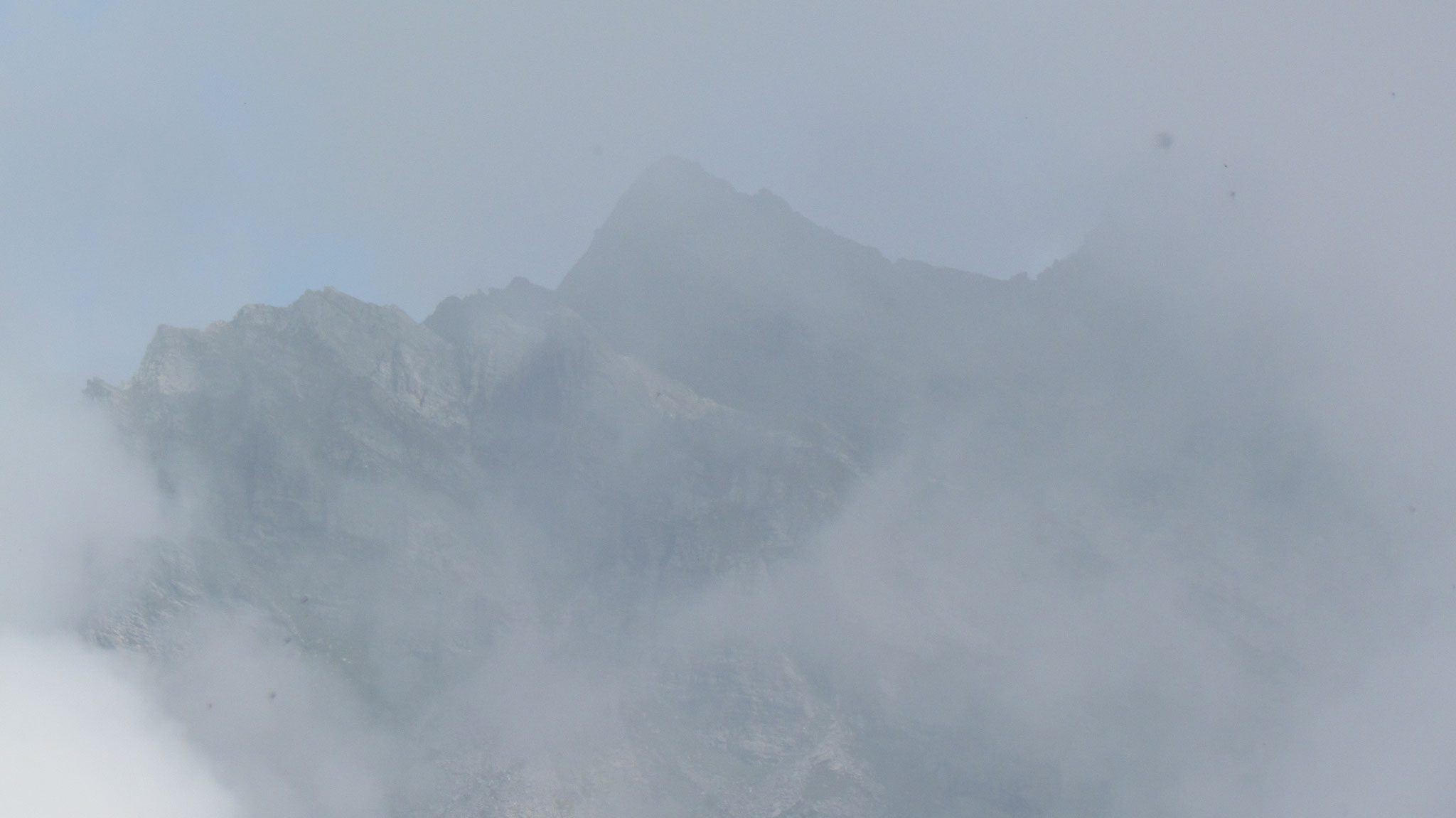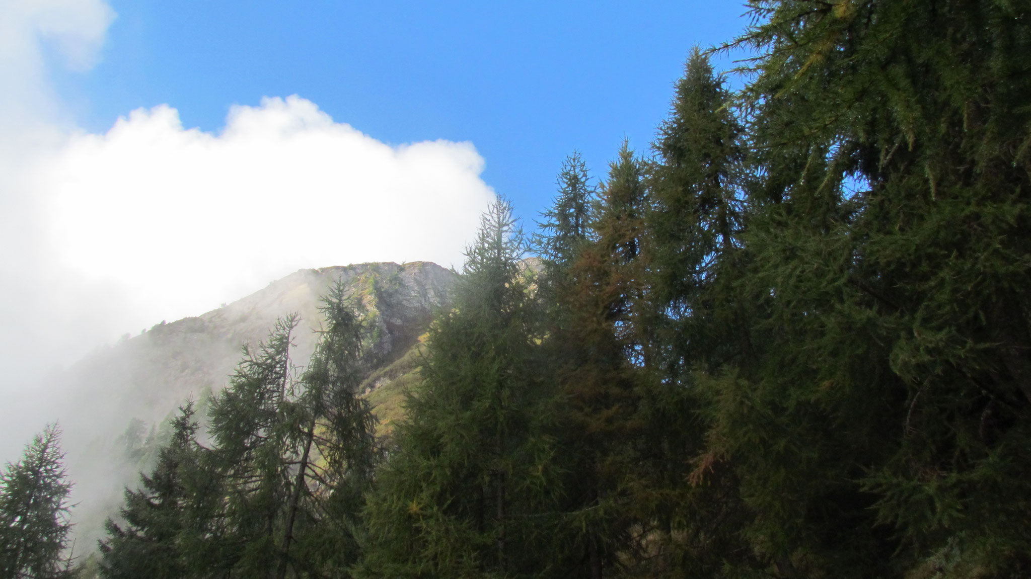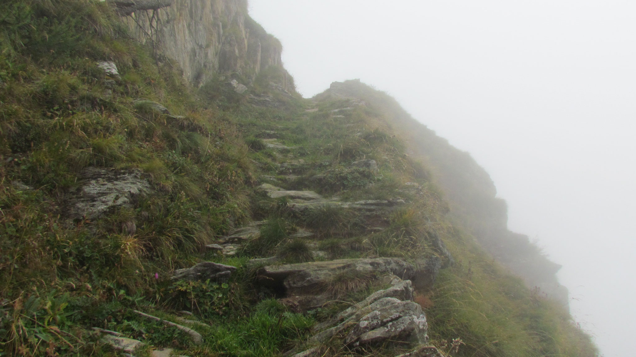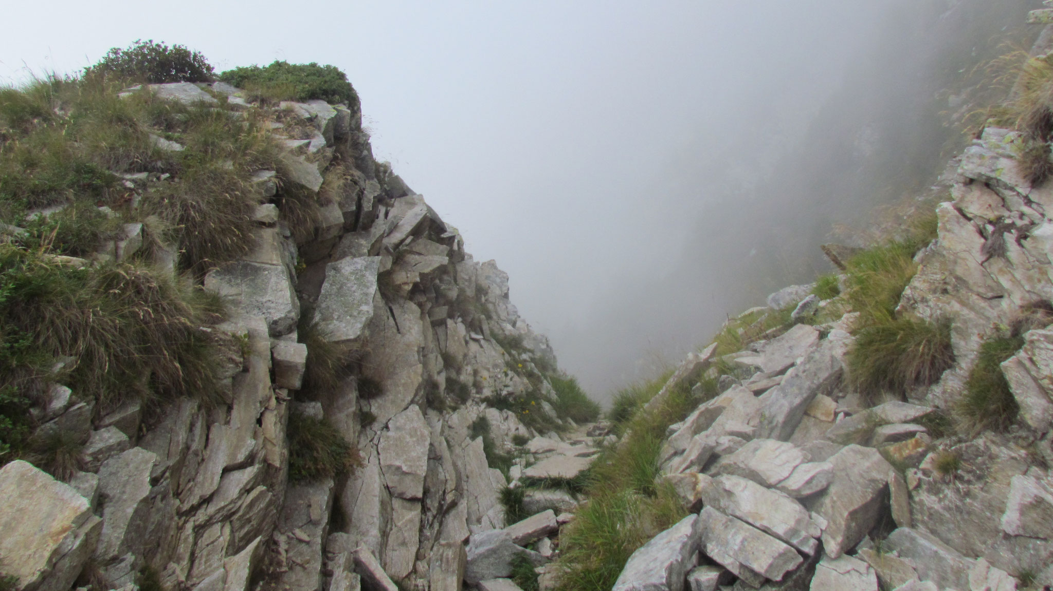 Saliamo gradatamente con lunghi tratti in falsopiano. Superiamo un alpeggio diroccato alle 8,45 e alle 9,50 ci fermiamo per la colazione, siamo sempre nella nebbia. Ripartiamo alle 10,00. Poco dopo arriviamo in cresta, sulla destra la val Isorno, immersa nella nebbia, sulla sinistra la valle Antigorio, con la nebbia in basso ma cielo limpido in alto. Si vedono i 4000 e il Cervandone (vedi fotogallery).