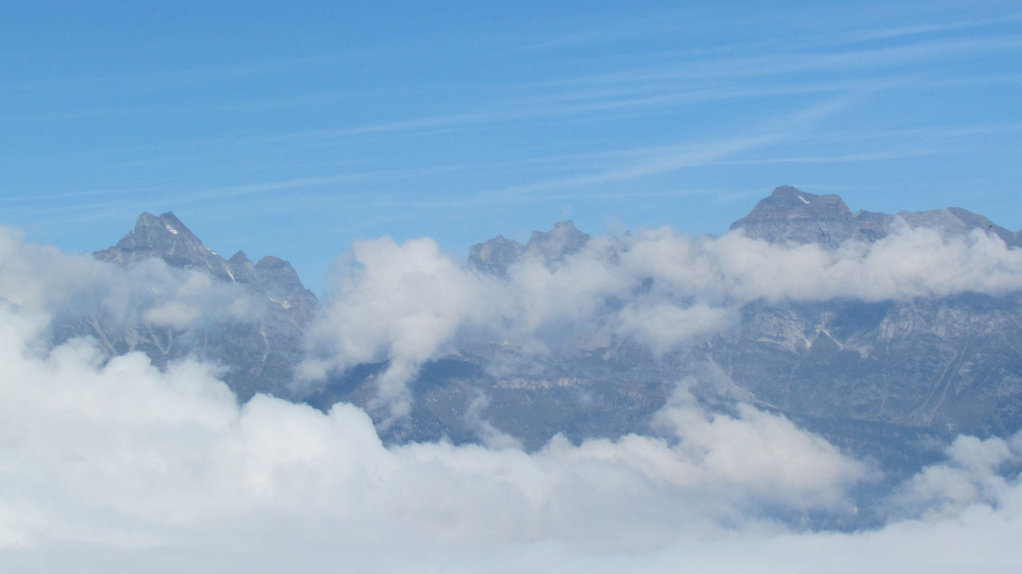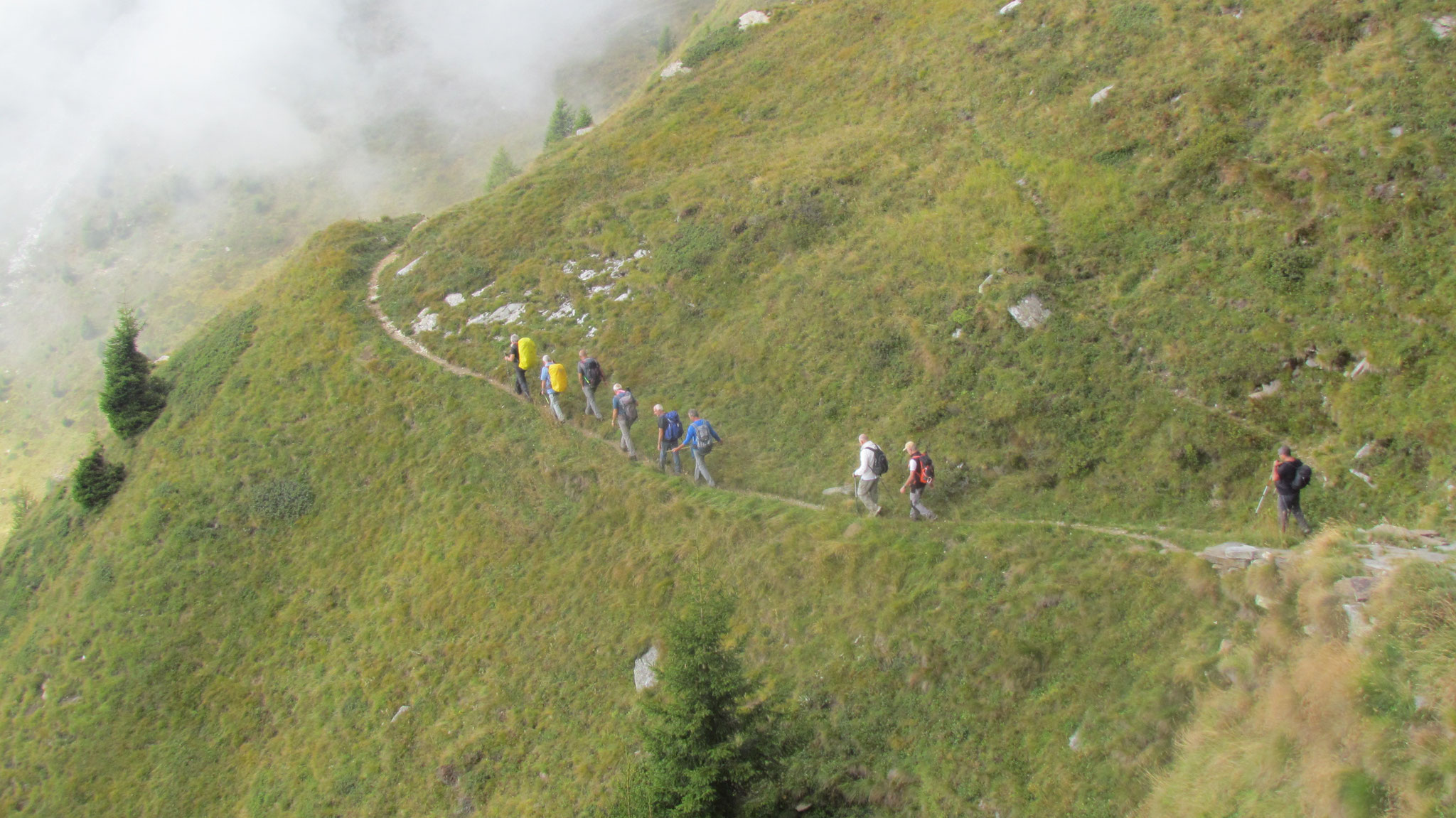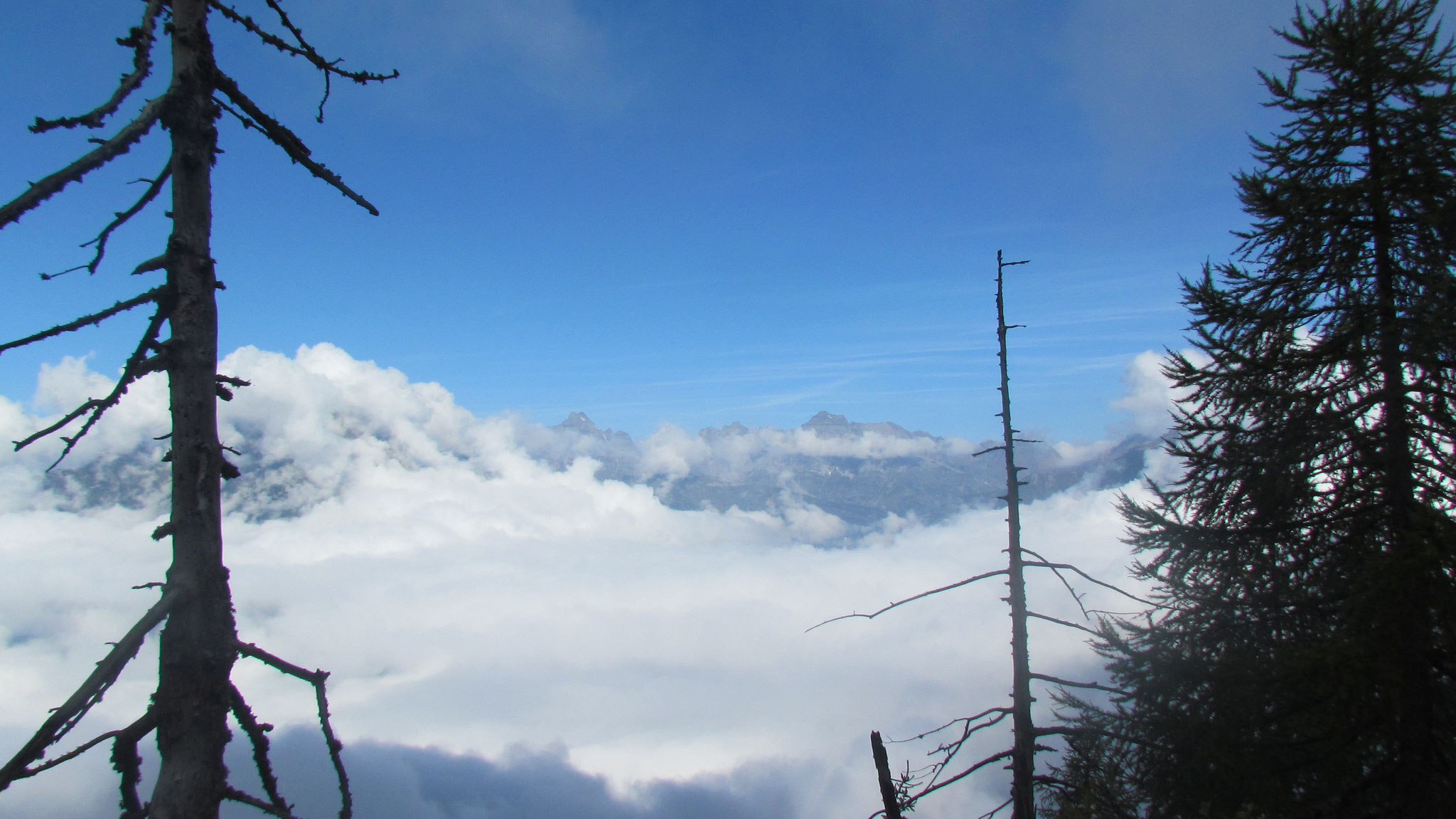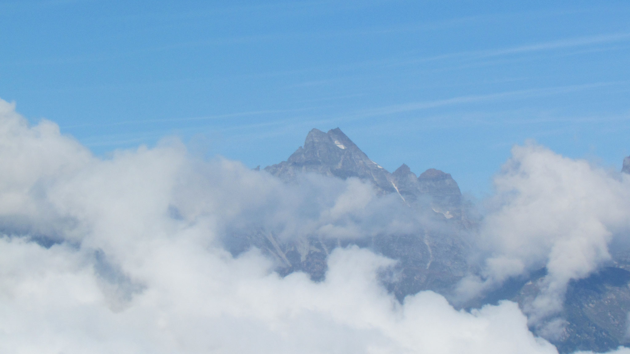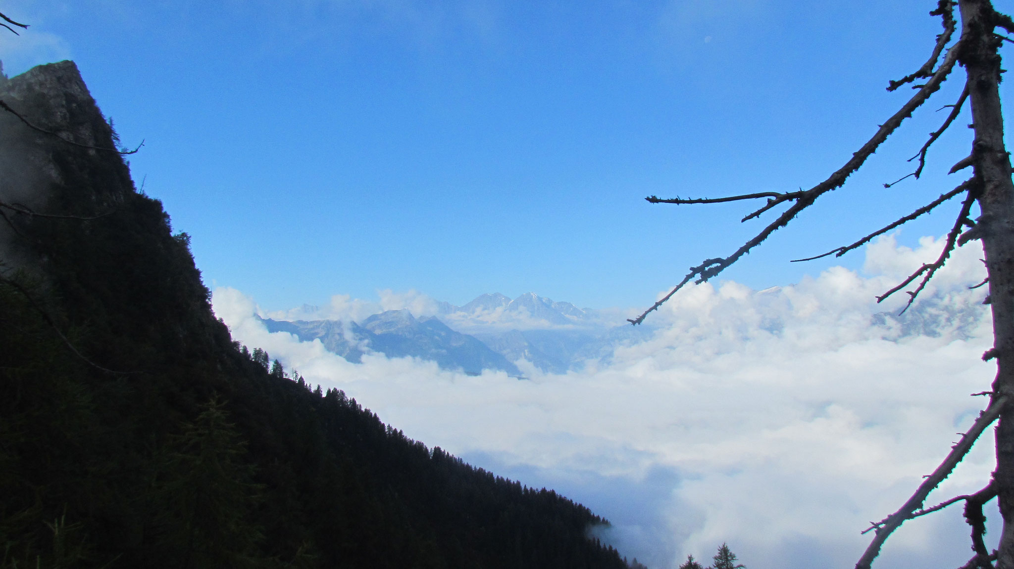 Saliamo gradatamente con lunghi tratti in falsopiano. Superiamo un alpeggio diroccato alle 8,45 e alle 9,50 ci fermiamo per la colazione, siamo sempre nella nebbia. Ripartiamo alle 10,00. Poco dopo arriviamo in cresta, sulla destra la val Isorno, immersa nella nebbia, sulla sinistra la valle Antigorio, con la nebbia in basso ma cielo limpido in alto. Si vedono i 4000 e il Cervandone (vedi fotogallery).