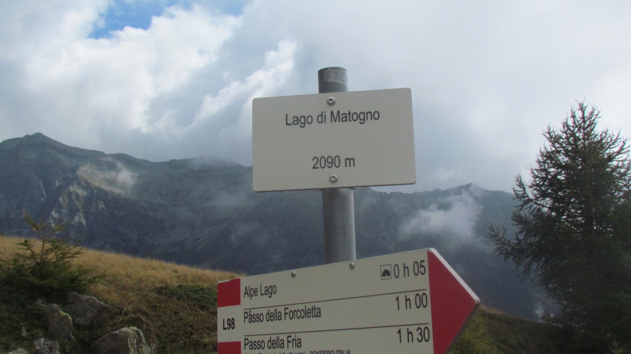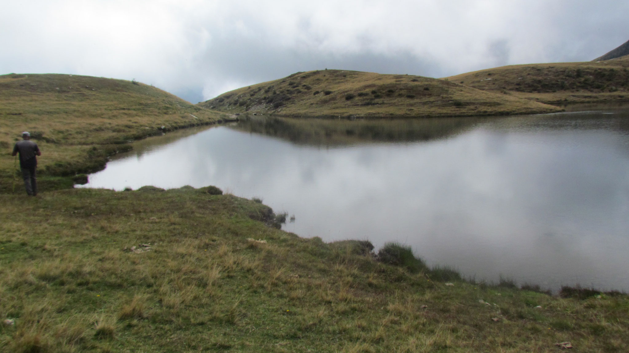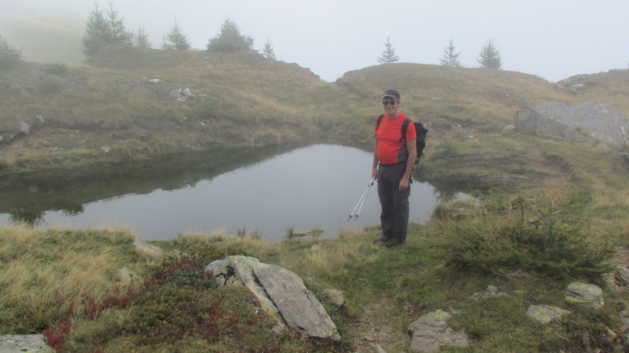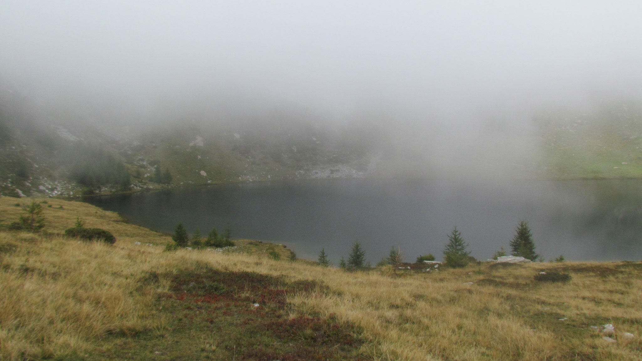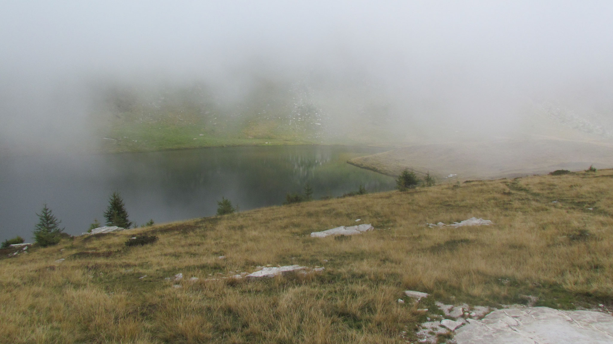 Dopo una breve sosta scendiamo dalla parte opposta e raggiunto l'Alpe Lago m. 2066 alle 11,55 e risaliamo al lago di Matogno m. 2090 dove arriviamo alle 12,00. Sosta per il pranzo. Mentre pranziamo ogni tanto la nebbia si dirada e si vede qualcosa. Durante la sosta faccio il giro del lago.