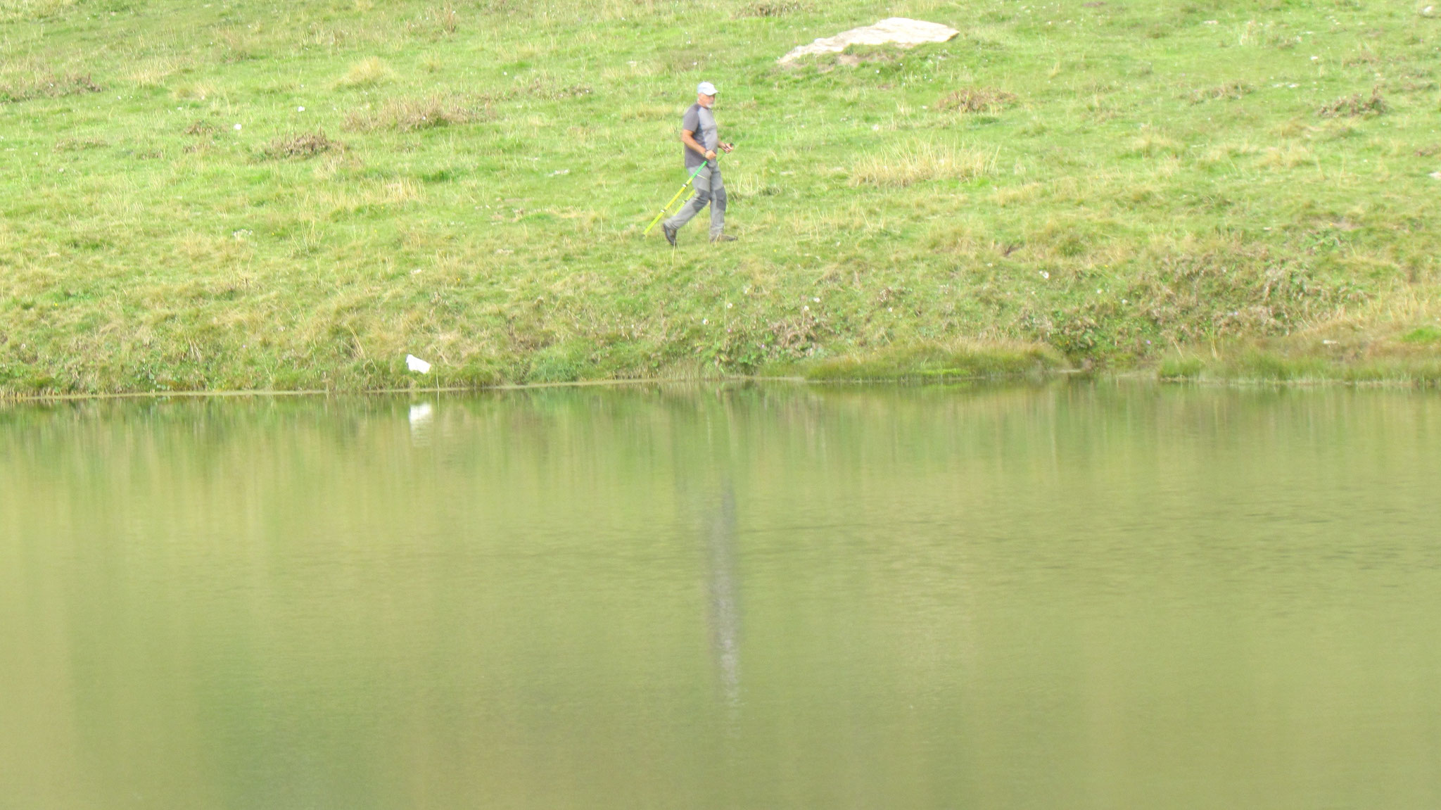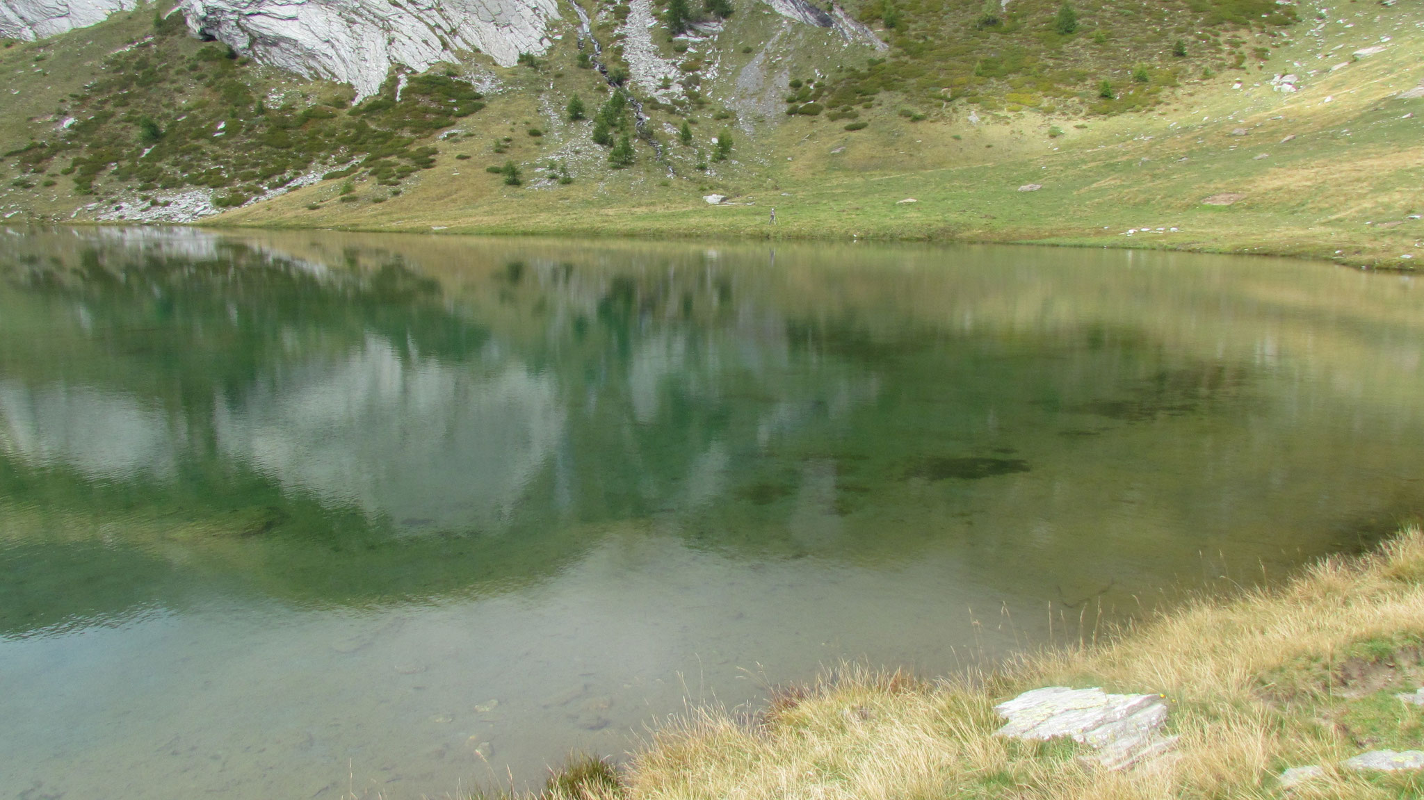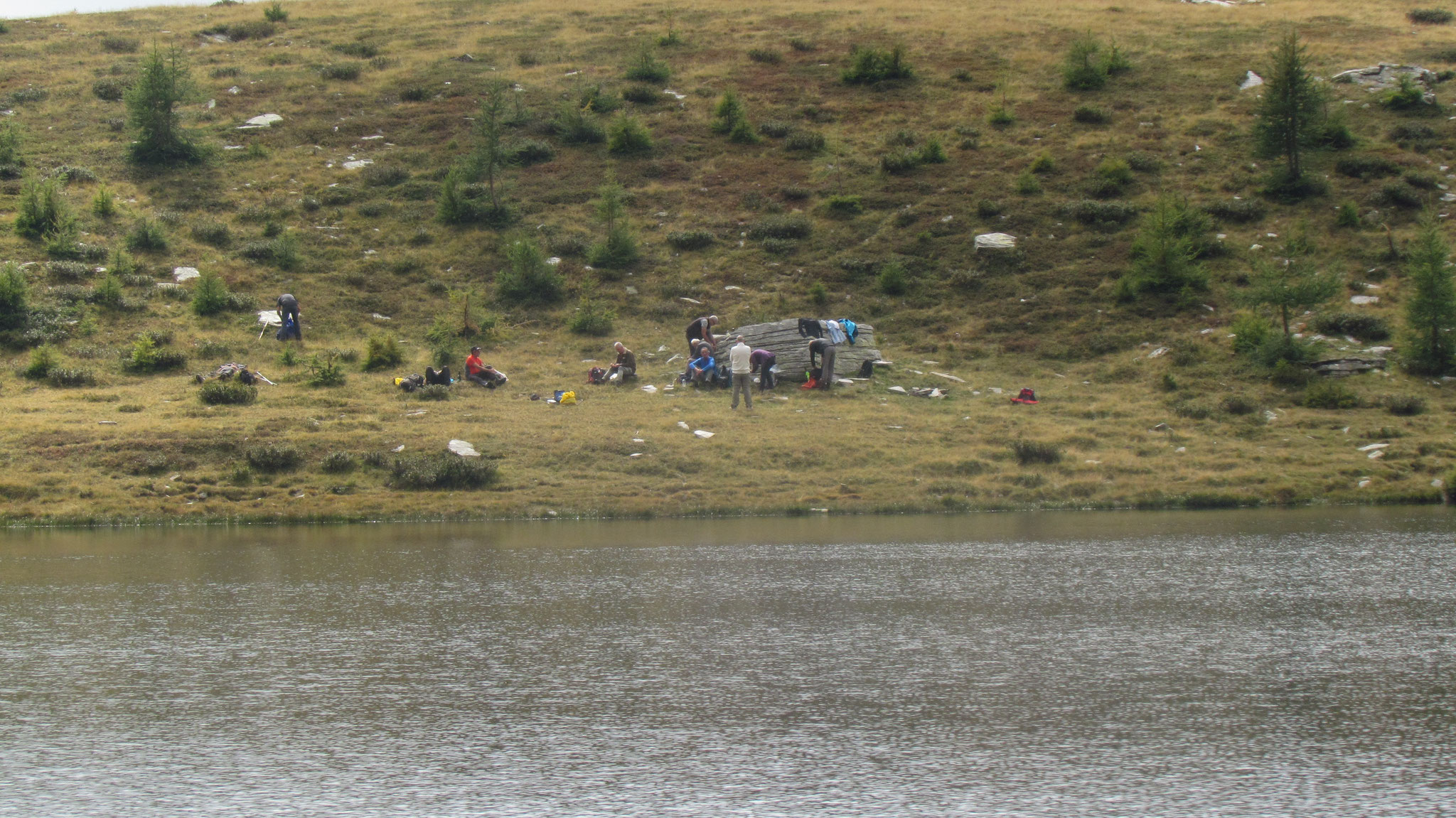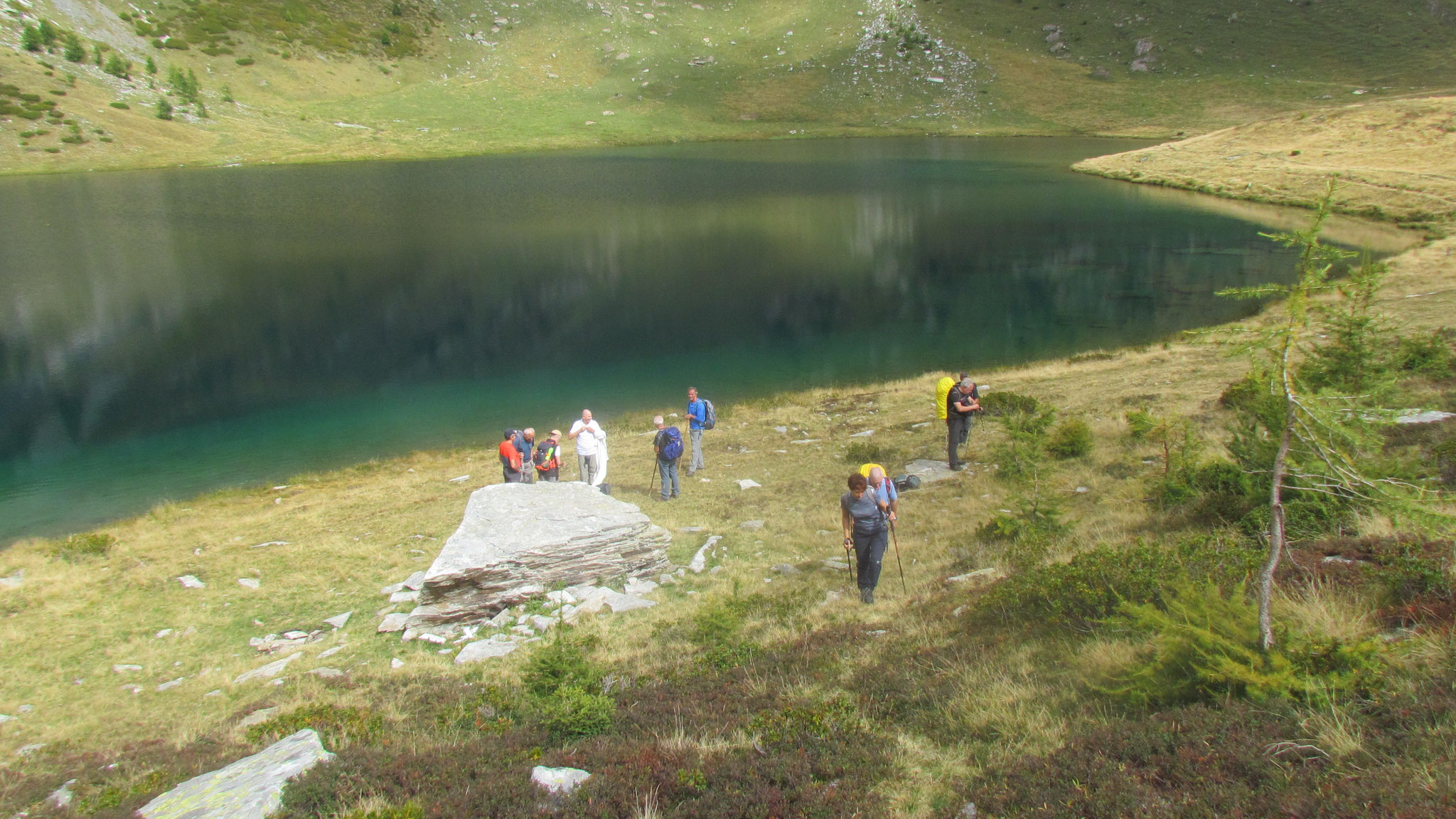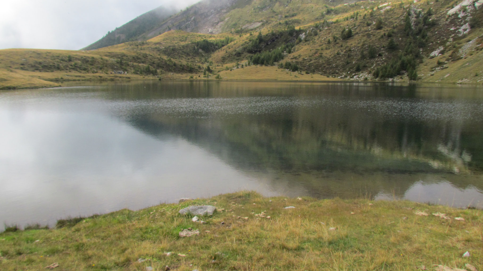 Dopo una breve sosta scendiamo dalla parte opposta e raggiunto l'Alpe Lago m. 2066 alle 11,55 e risaliamo al lago di Matogno m. 2090 dove arriviamo alle 12,00. Sosta per il pranzo. Mentre pranziamo ogni tanto la nebbia si dirada e si vede qualcosa. Durante la sosta faccio il giro del lago.