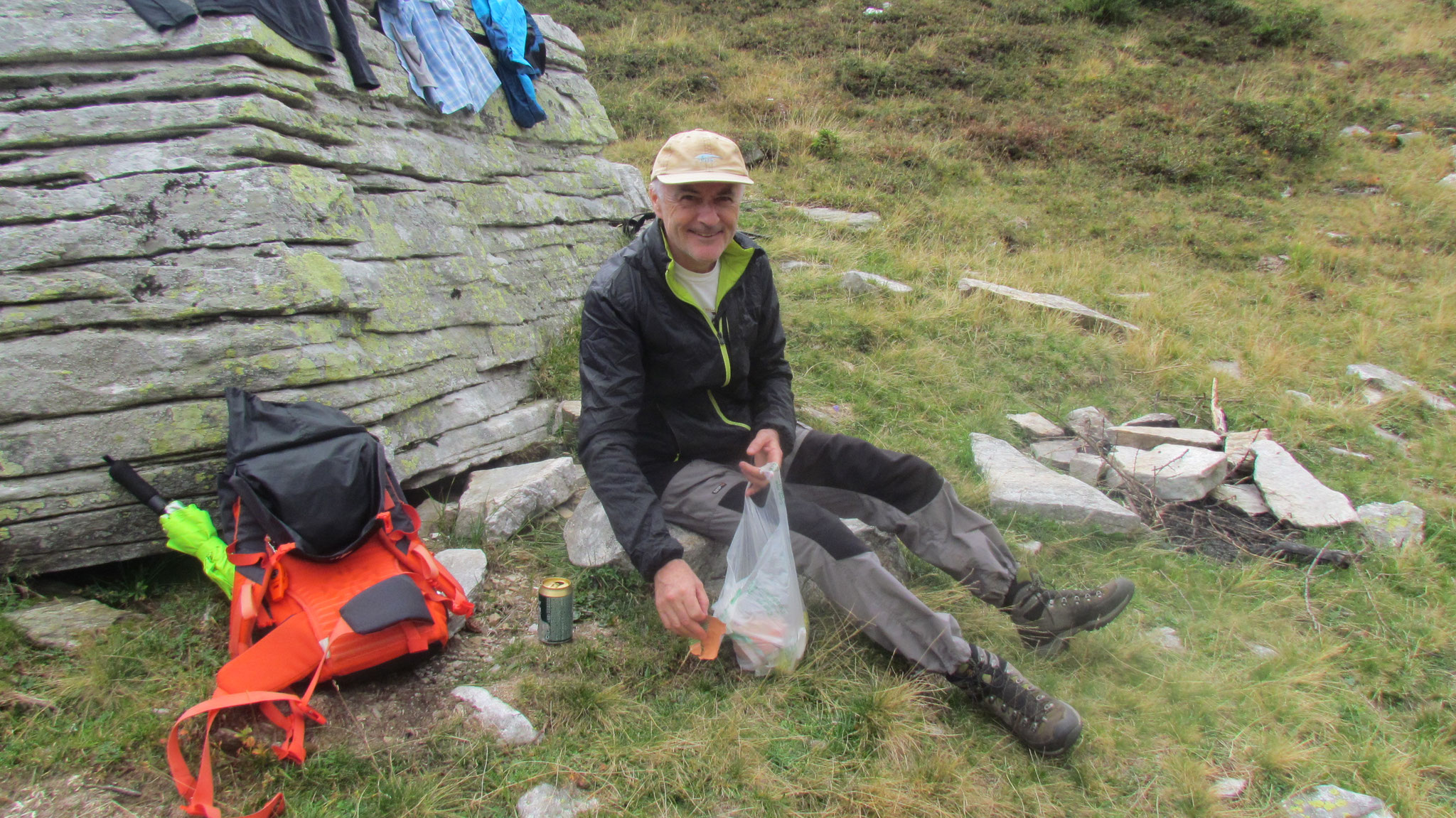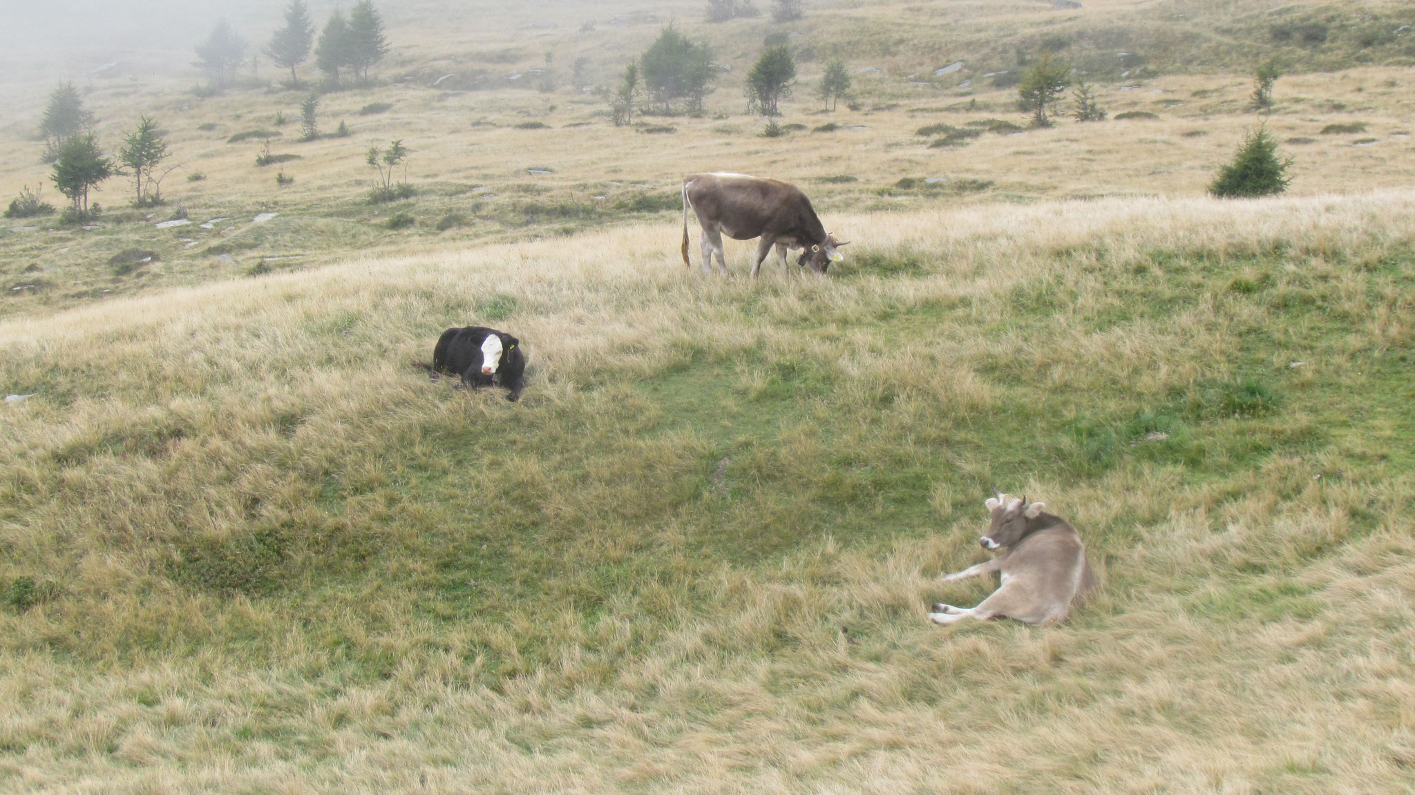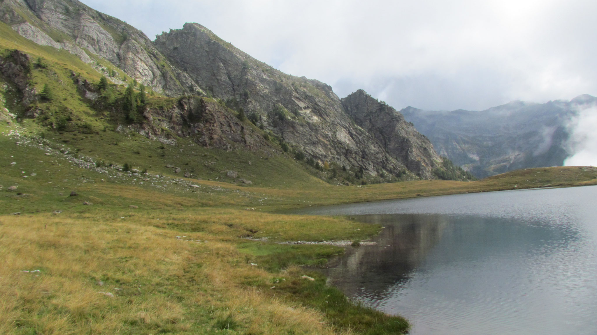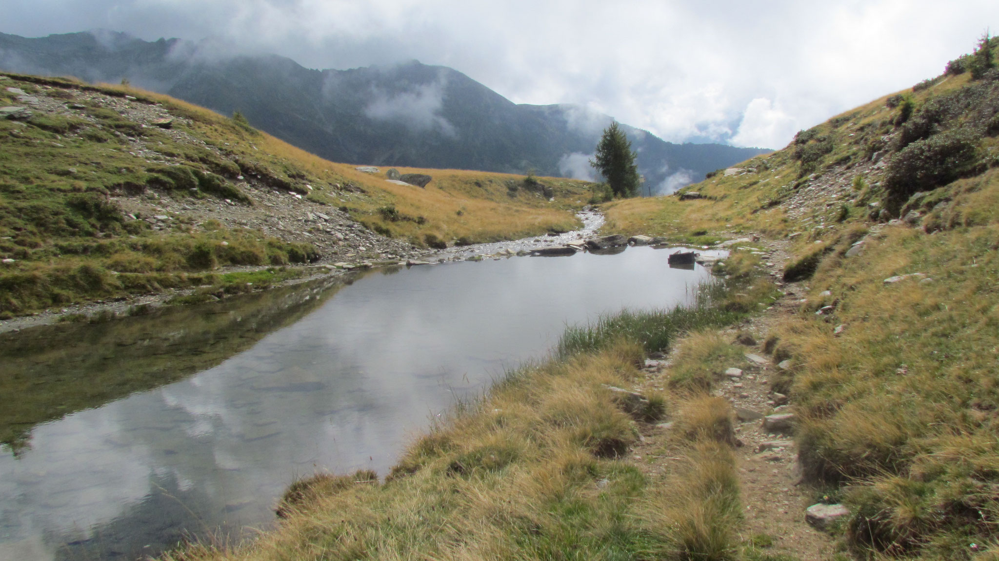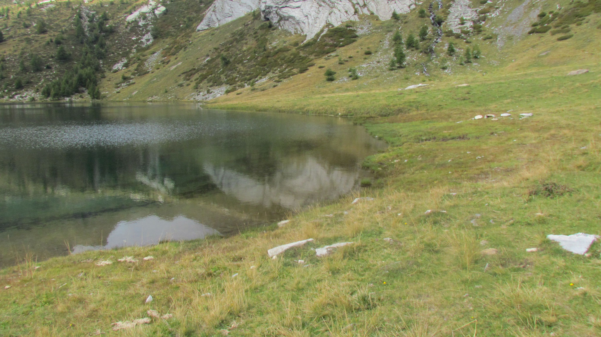 Dopo una breve sosta scendiamo dalla parte opposta e raggiunto l'Alpe Lago m. 2066 alle 11,55 e risaliamo al lago di Matogno m. 2090 dove arriviamo alle 12,00. Sosta per il pranzo. Mentre pranziamo ogni tanto la nebbia si dirada e si vede qualcosa. Durante la sosta faccio il giro del lago.
