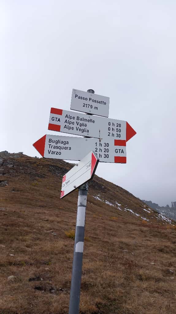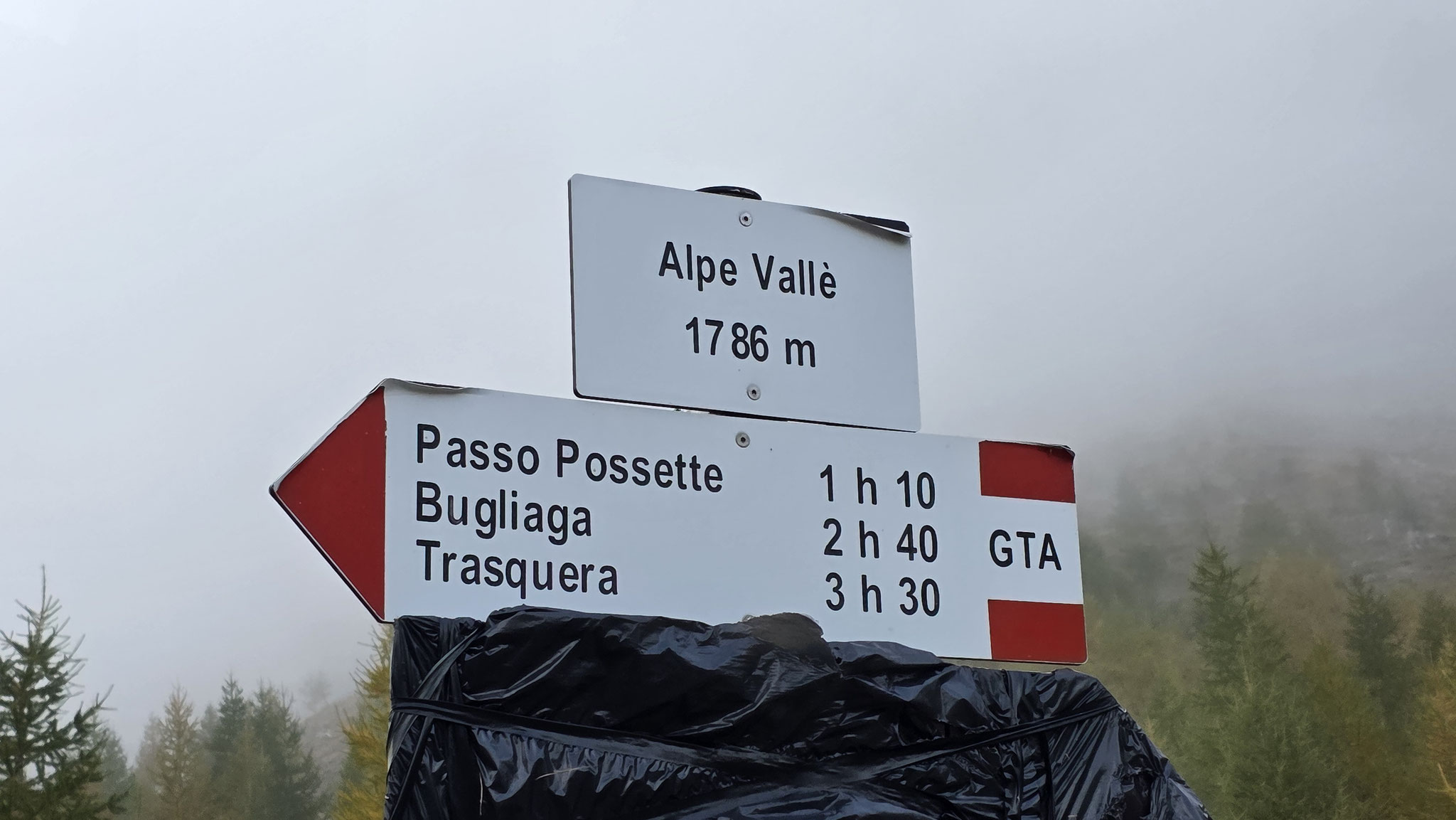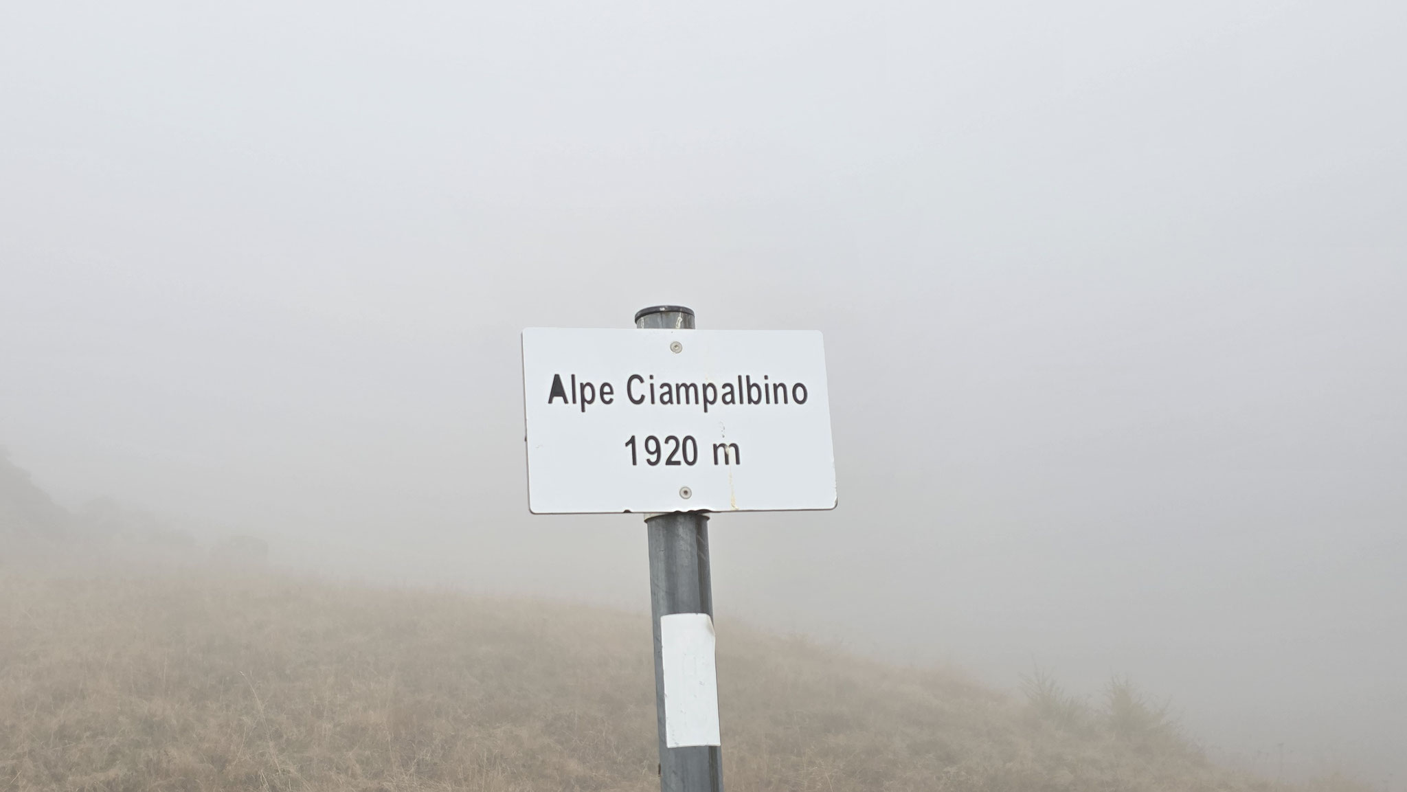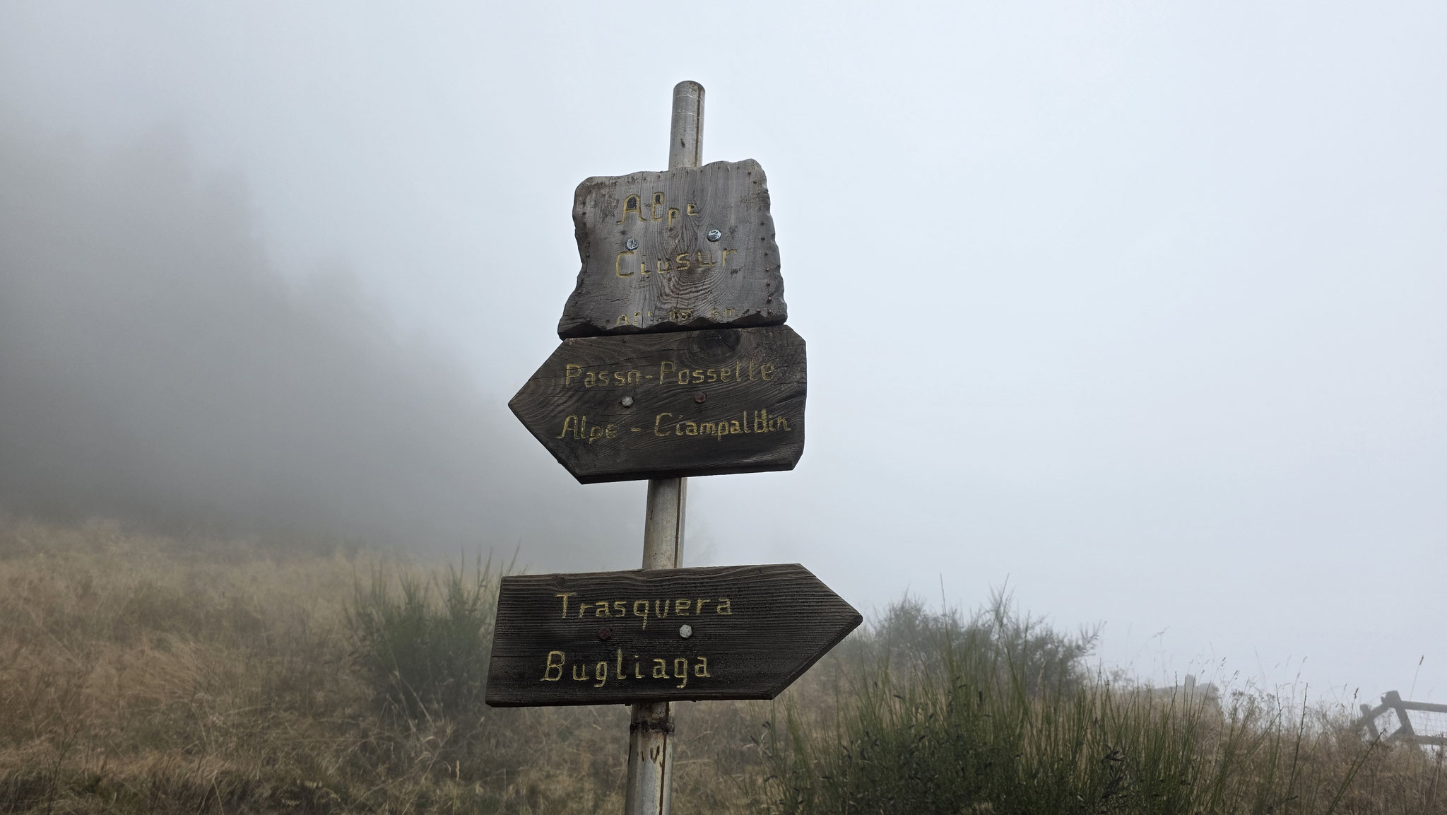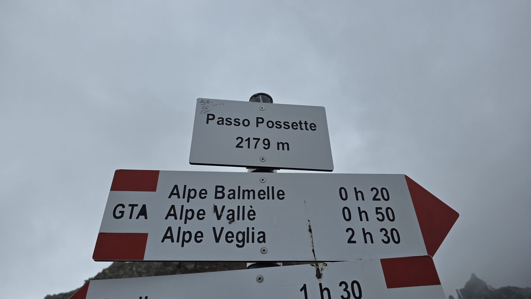 Siamo nella nebbia. Breve sosta e ripartenza alle 11,00. Superiamo l'Alpe Orzalina m. 1696 alle 11,15, l'Alpe Clusur m. 1753 alle 11,30 e arriviamo all'Alpe Ciampalbino m. 1920 alle 11,40. Nuova sosta e ripartenza alle 11,50. Ora il sentiero sale gradatamente fino ad arrivare al Passo Possette m. 2179 alle 12,25. Il tempo èmigliorato e a tratti esce anche il sole. Sosta per raggrupparci. Anna e Luciano decidono di non salire al Teggiolo. Ripartiamo alle 12,50, poco dopo anche Mauro rinuncia.