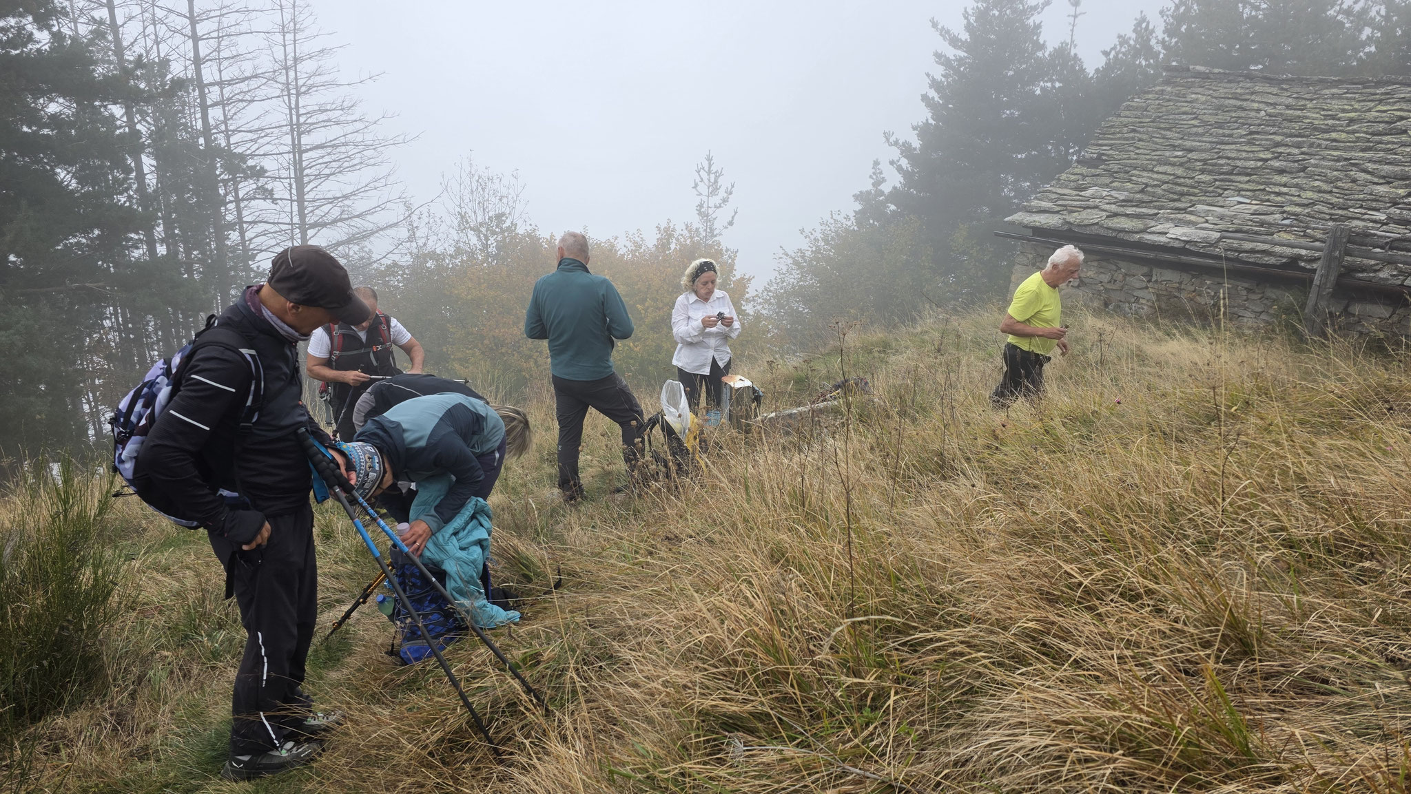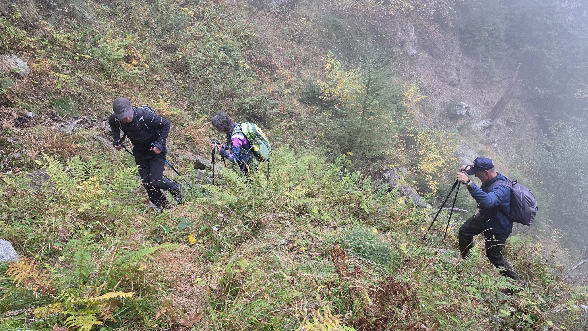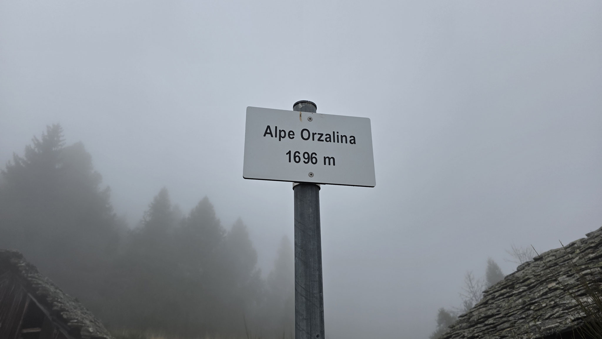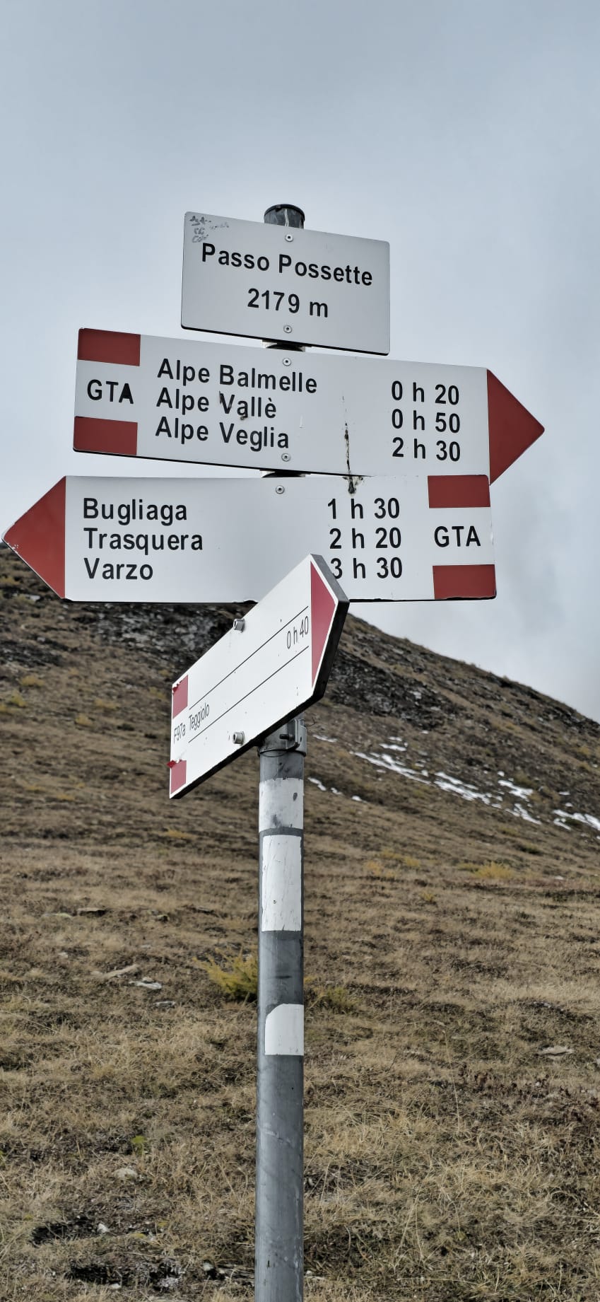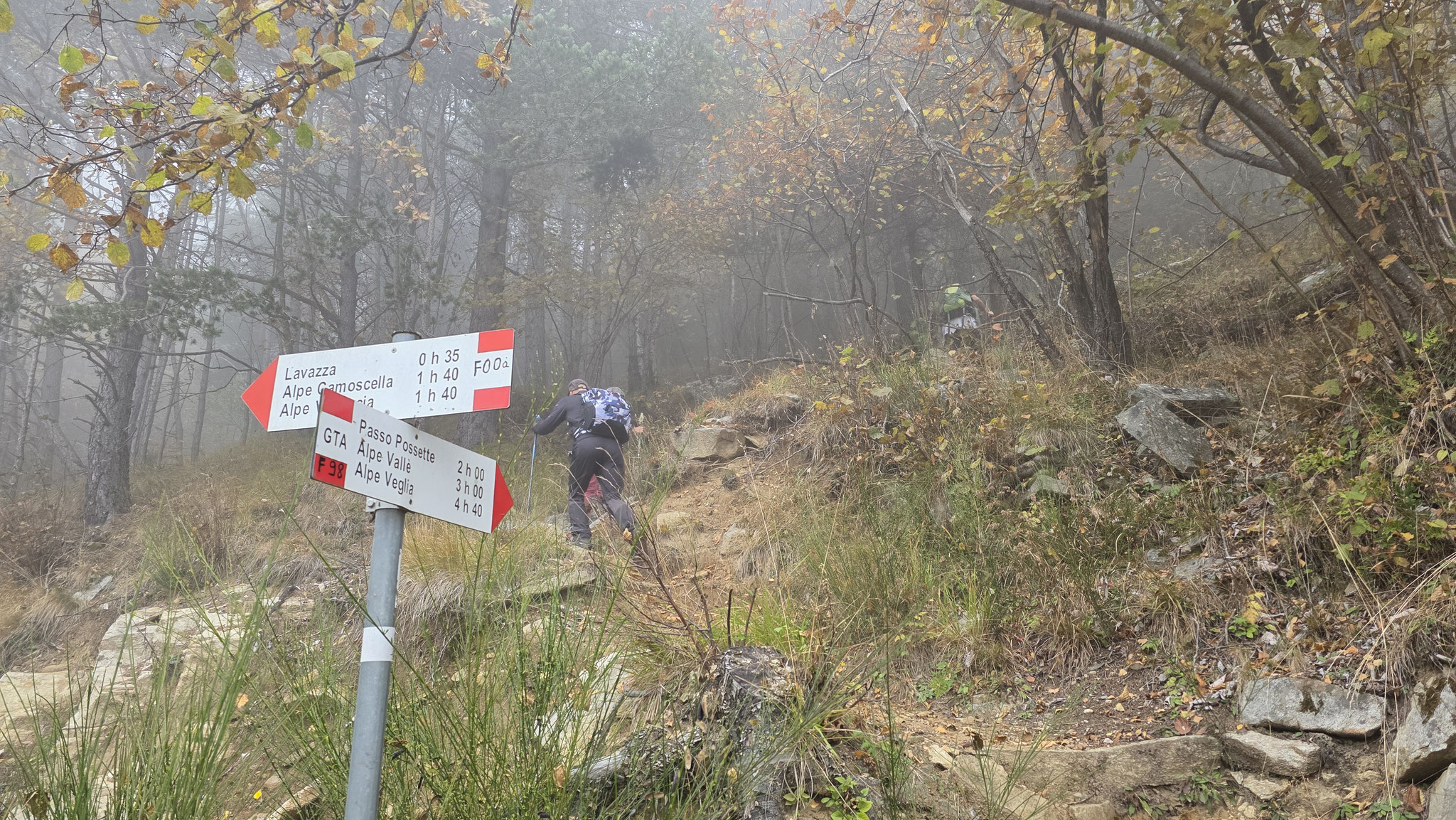 Siamo nella nebbia. Breve sosta e ripartenza alle 11,00. Superiamo l'Alpe Orzalina m. 1696 alle 11,15, l'Alpe Clusur m. 1753 alle 11,30 e arriviamo all'Alpe Ciampalbino m. 1920 alle 11,40. Nuova sosta e ripartenza alle 11,50. Ora il sentiero sale gradatamente fino ad arrivare al Passo Possette m. 2179 alle 12,25. Il tempo èmigliorato e a tratti esce anche il sole. Sosta per raggrupparci. Anna e Luciano decidono di non salire al Teggiolo. Ripartiamo alle 12,50, poco dopo anche Mauro rinuncia.