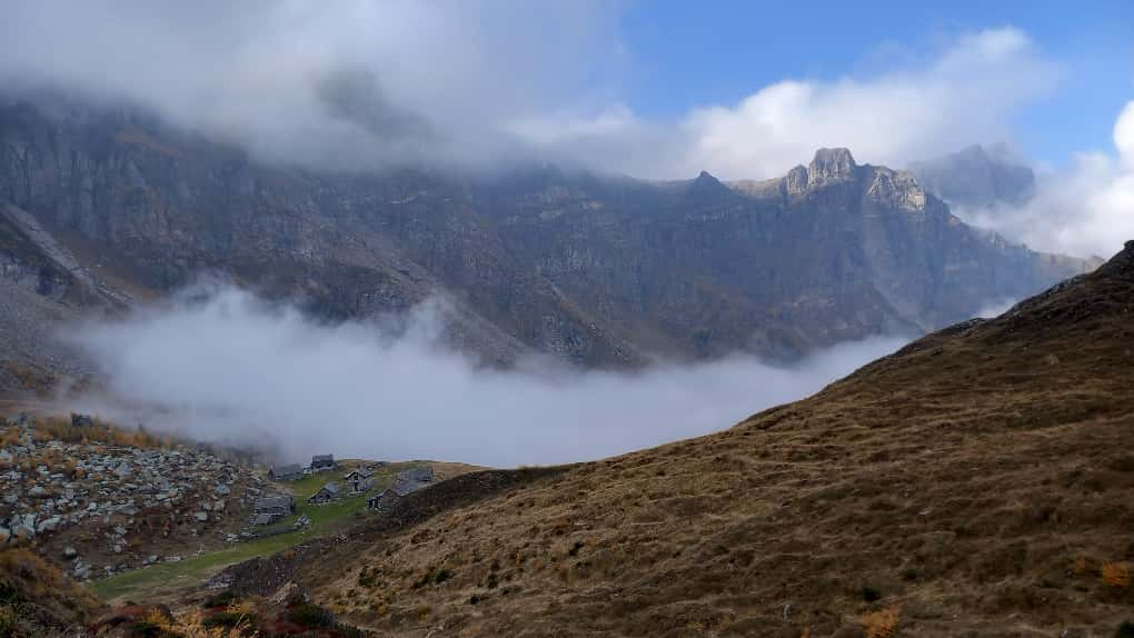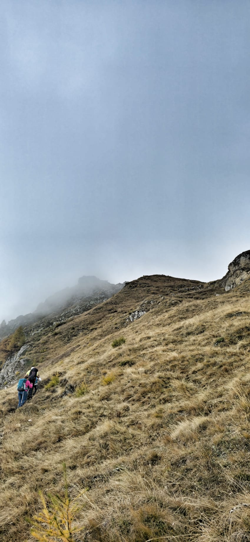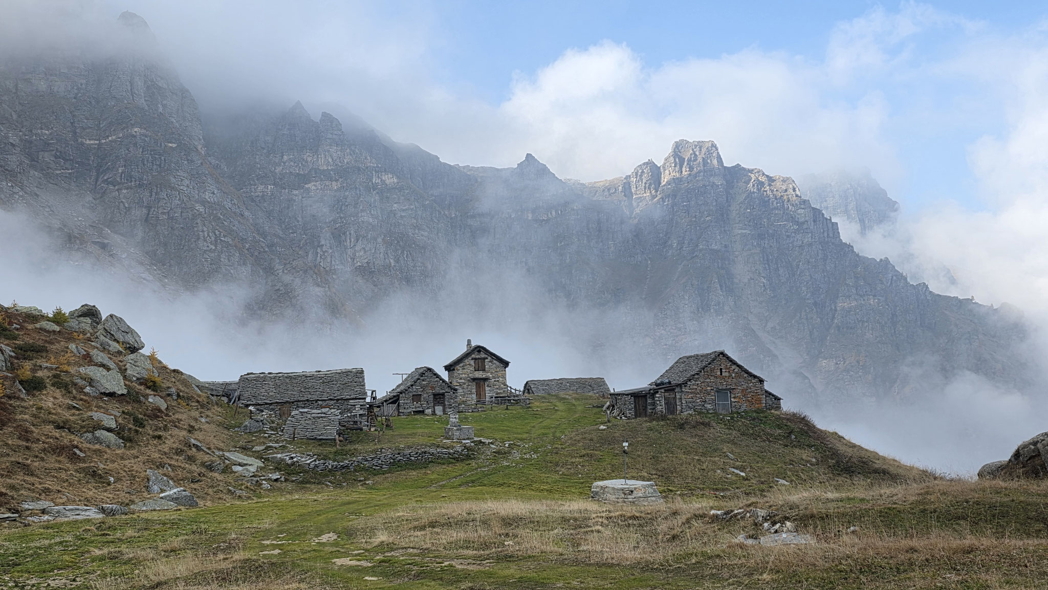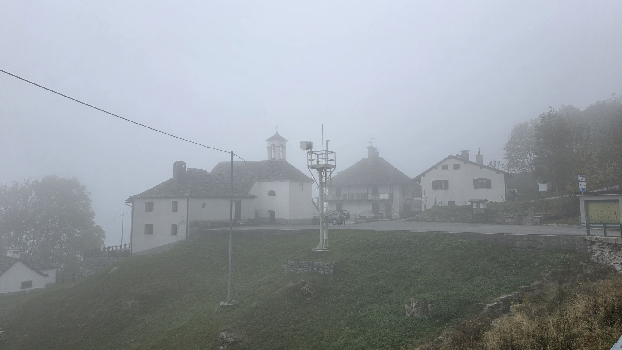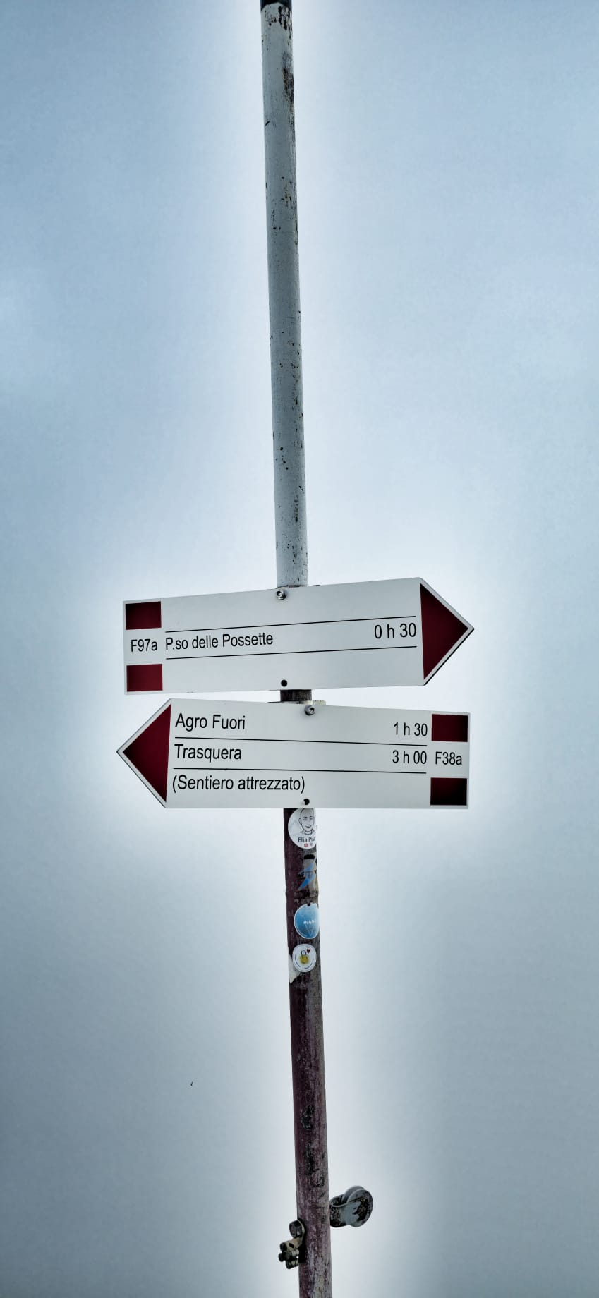 Siamo nella nebbia. Breve sosta e ripartenza alle 11,00. Superiamo l'Alpe Orzalina m. 1696 alle 11,15, l'Alpe Clusur m. 1753 alle 11,30 e arriviamo all'Alpe Ciampalbino m. 1920 alle 11,40. Nuova sosta e ripartenza alle 11,50. Ora il sentiero sale gradatamente fino ad arrivare al Passo Possette m. 2179 alle 12,25. Il tempo èmigliorato e a tratti esce anche il sole. Sosta per raggrupparci. Anna e Luciano decidono di non salire al Teggiolo. Ripartiamo alle 12,50, poco dopo anche Mauro rinuncia.