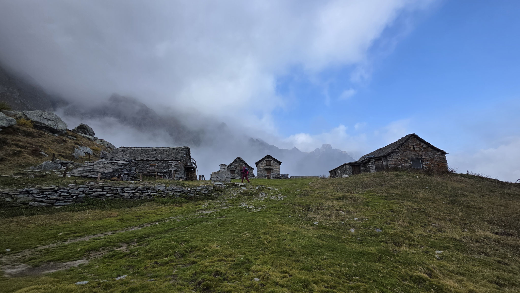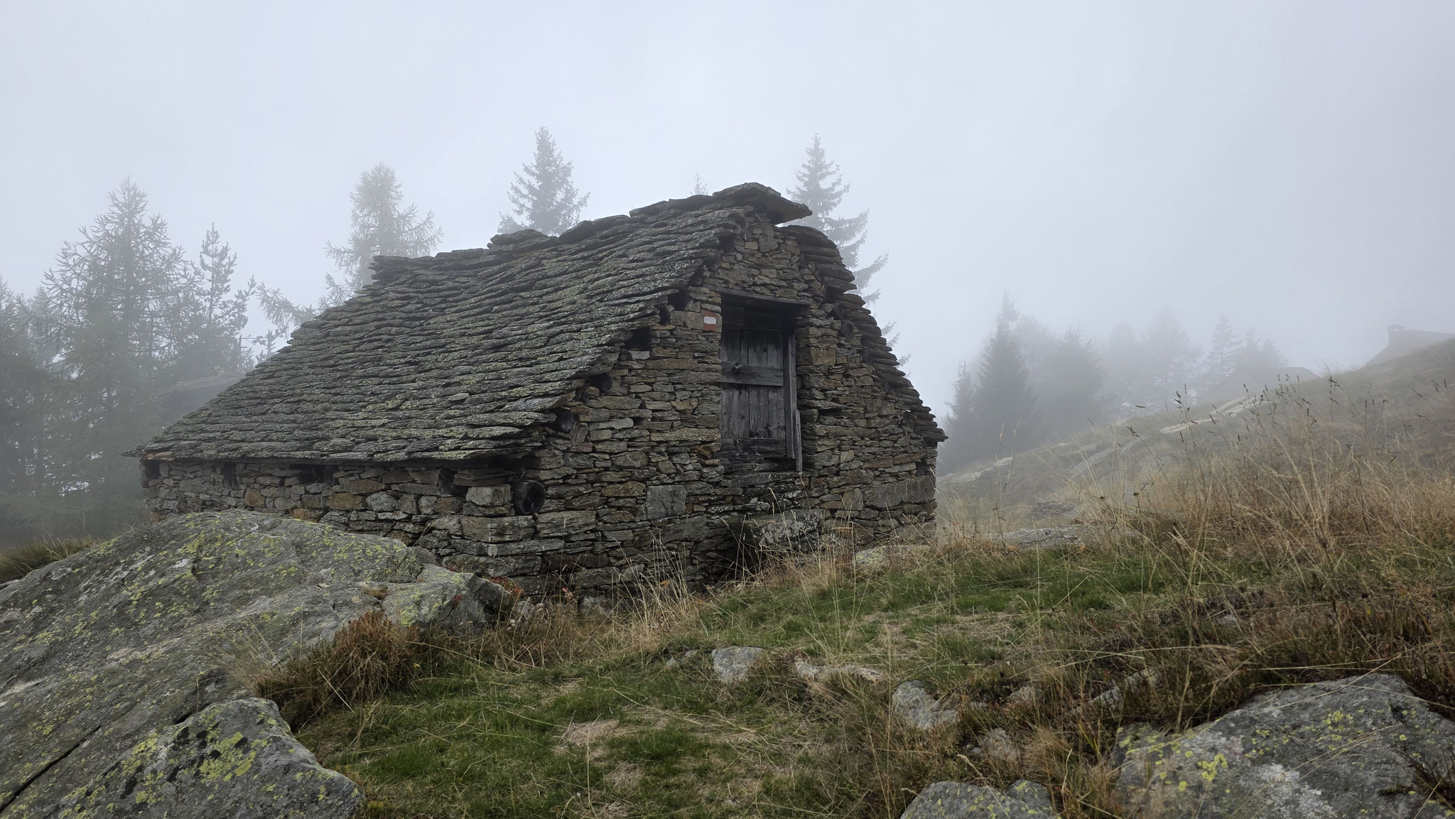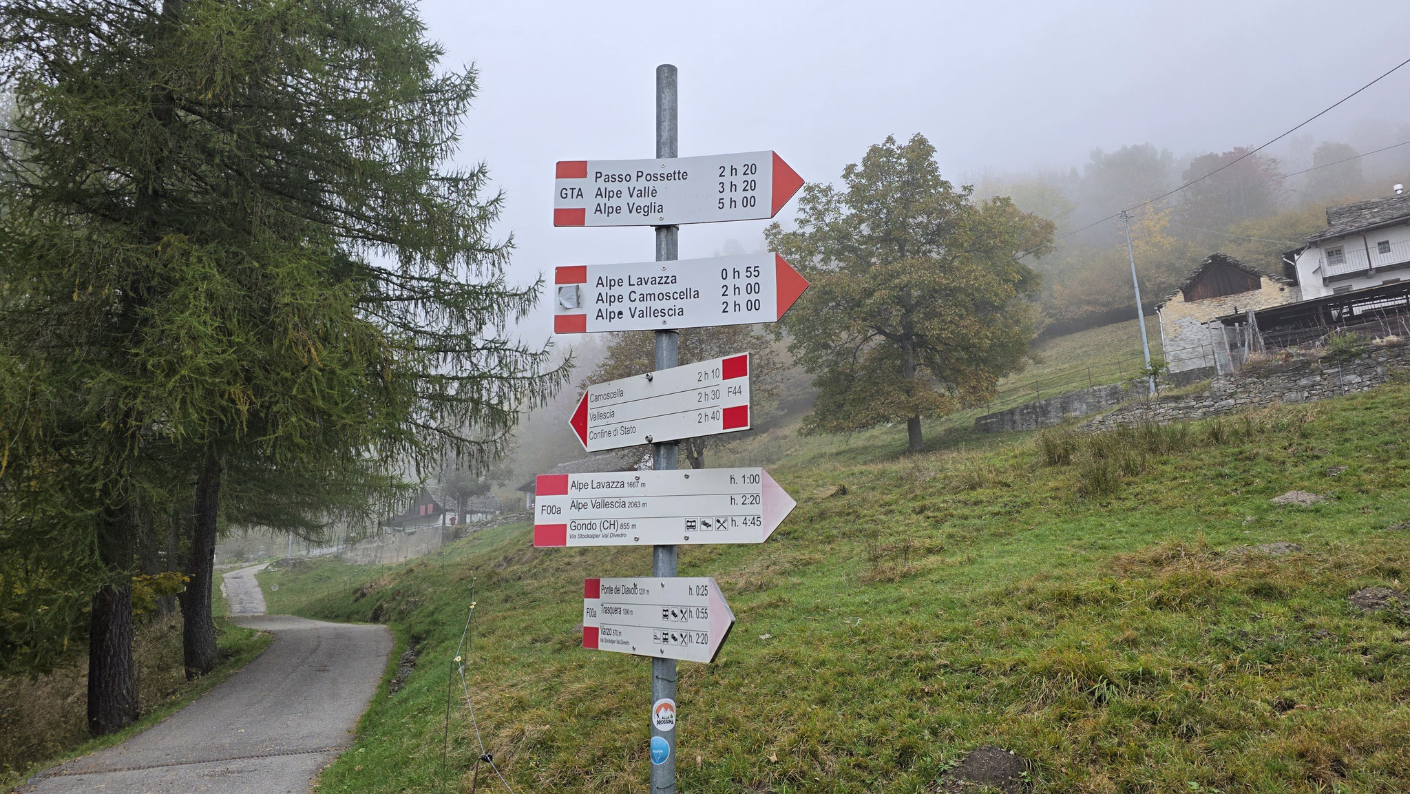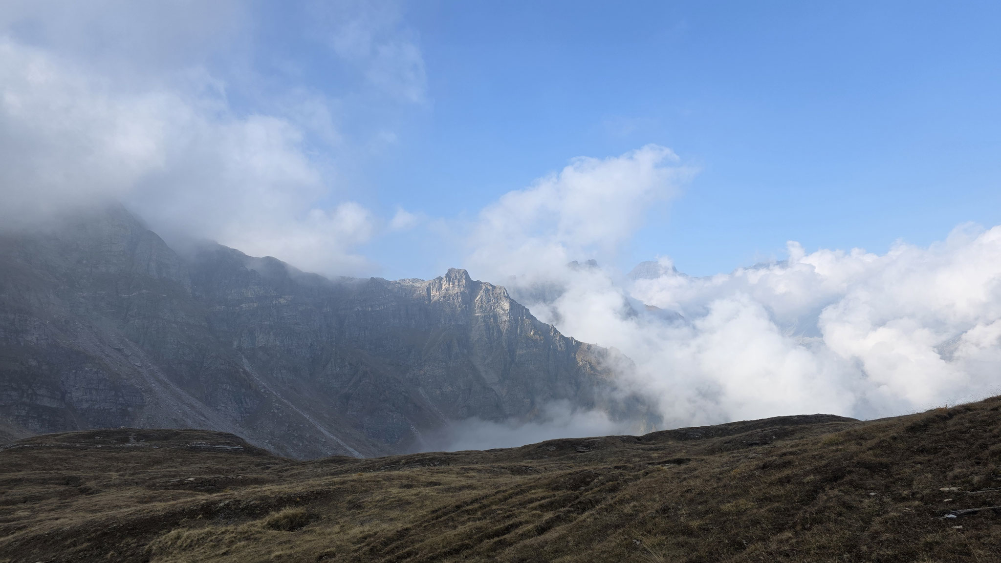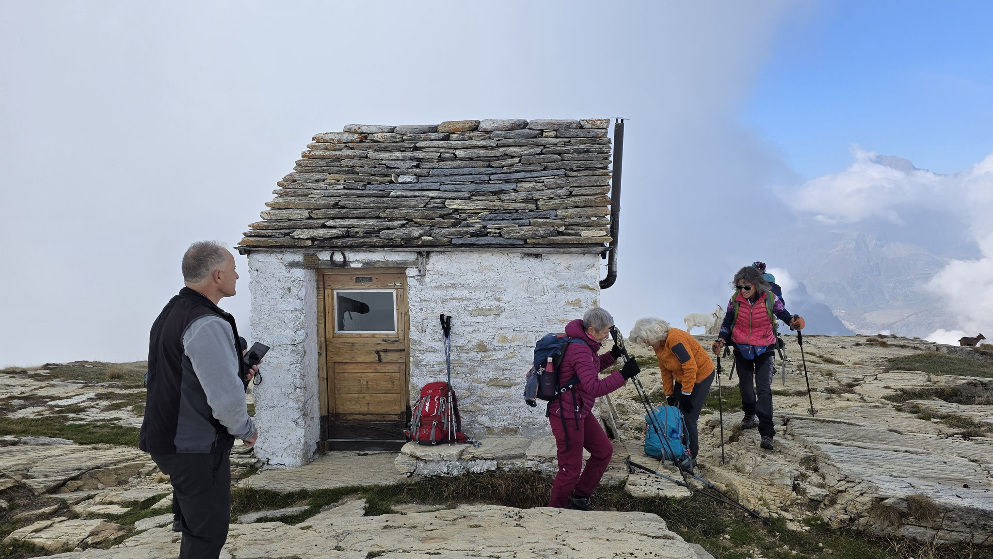 Siamo nella nebbia. Breve sosta e ripartenza alle 11,00. Superiamo l'Alpe Orzalina m. 1696 alle 11,15, l'Alpe Clusur m. 1753 alle 11,30 e arriviamo all'Alpe Ciampalbino m. 1920 alle 11,40. Nuova sosta e ripartenza alle 11,50. Ora il sentiero sale gradatamente fino ad arrivare al Passo Possette m. 2179 alle 12,25. Il tempo èmigliorato e a tratti esce anche il sole. Sosta per raggrupparci. Anna e Luciano decidono di non salire al Teggiolo. Ripartiamo alle 12,50, poco dopo anche Mauro rinuncia.