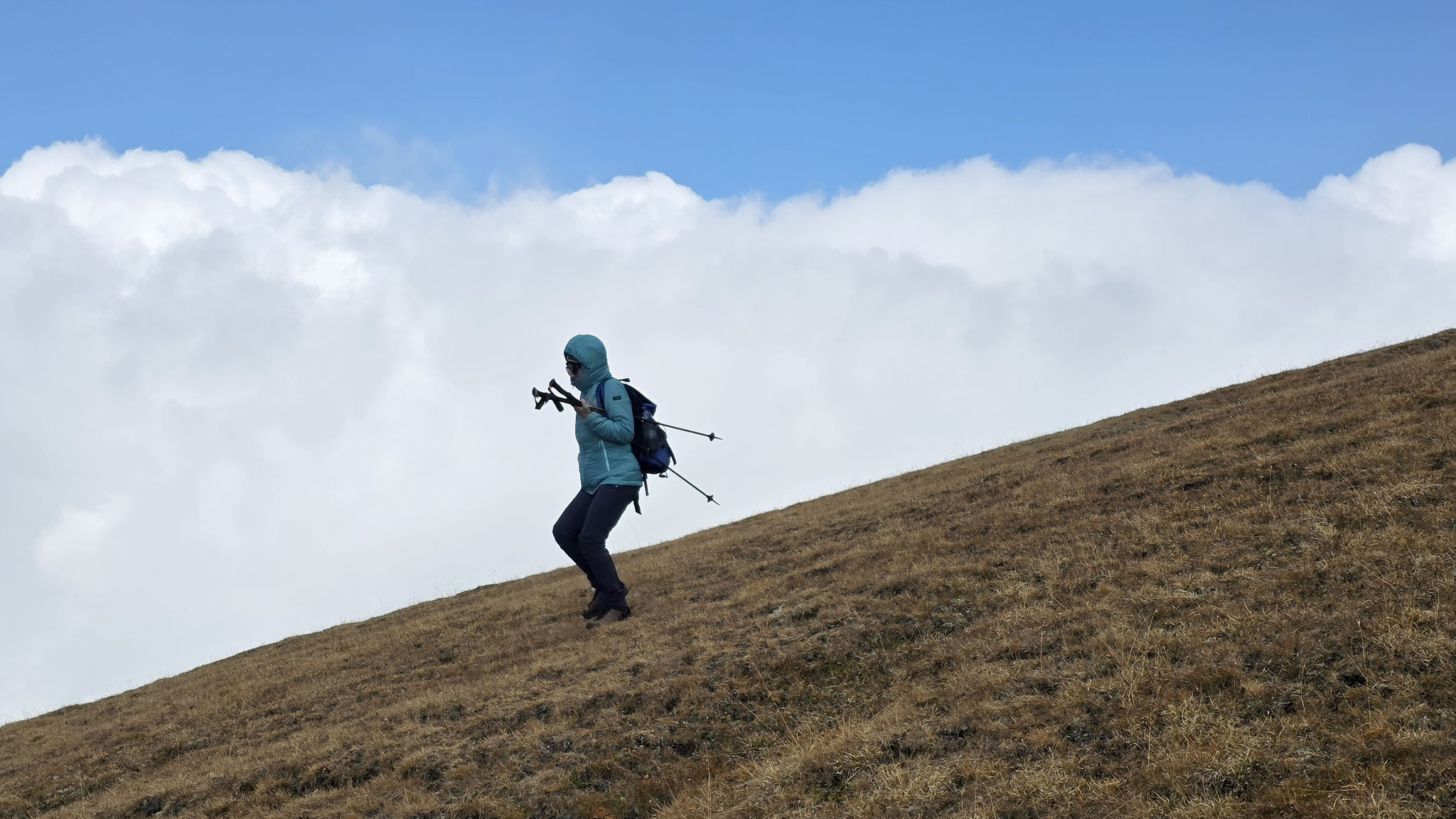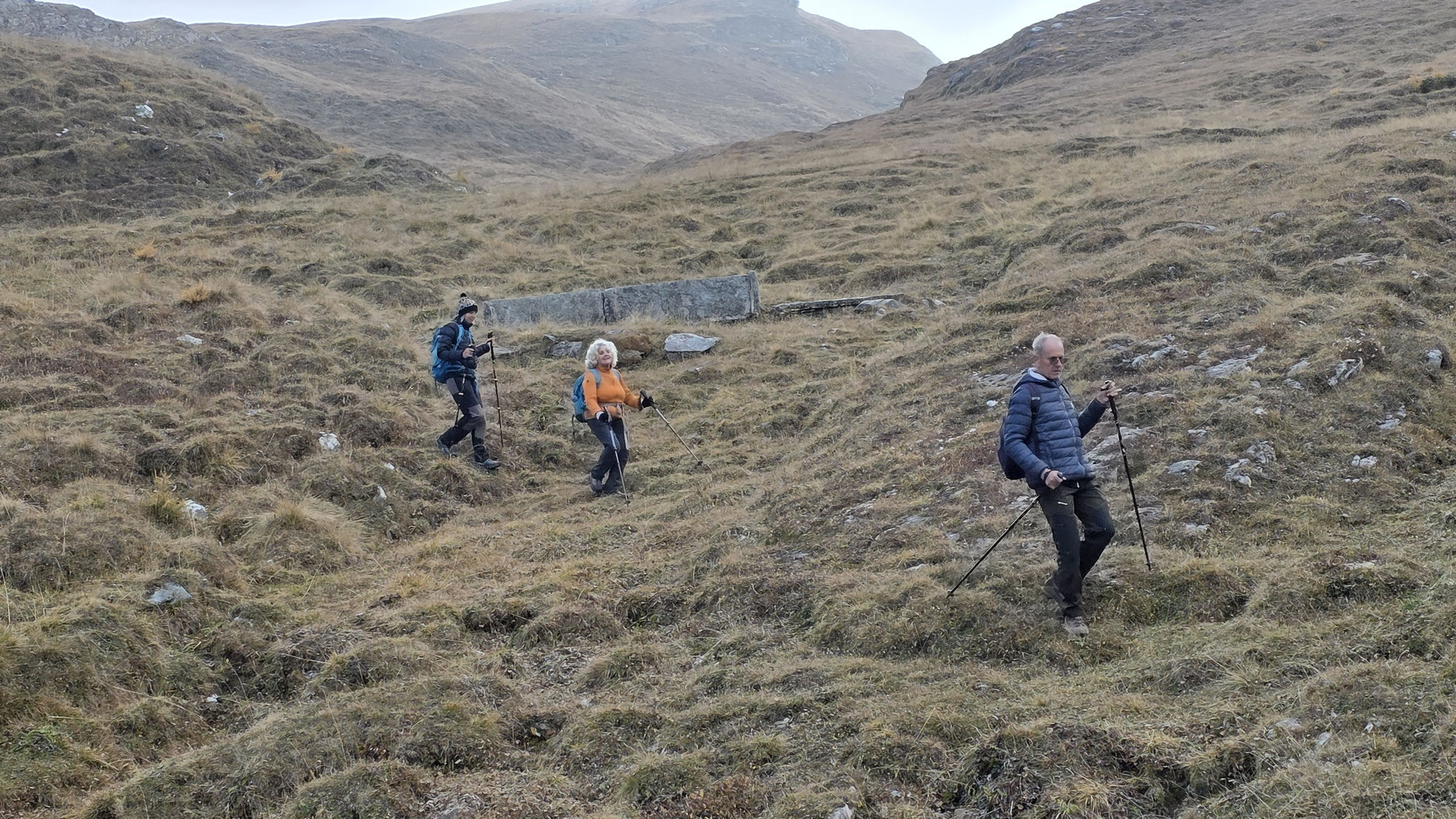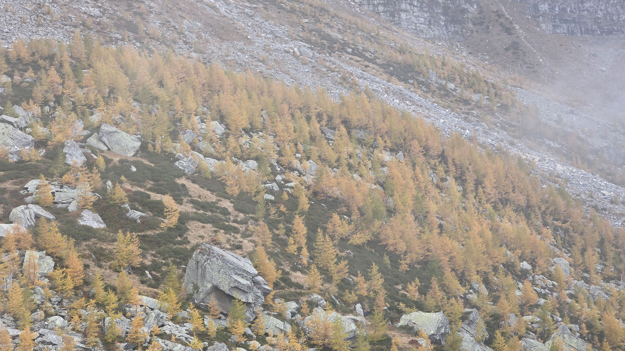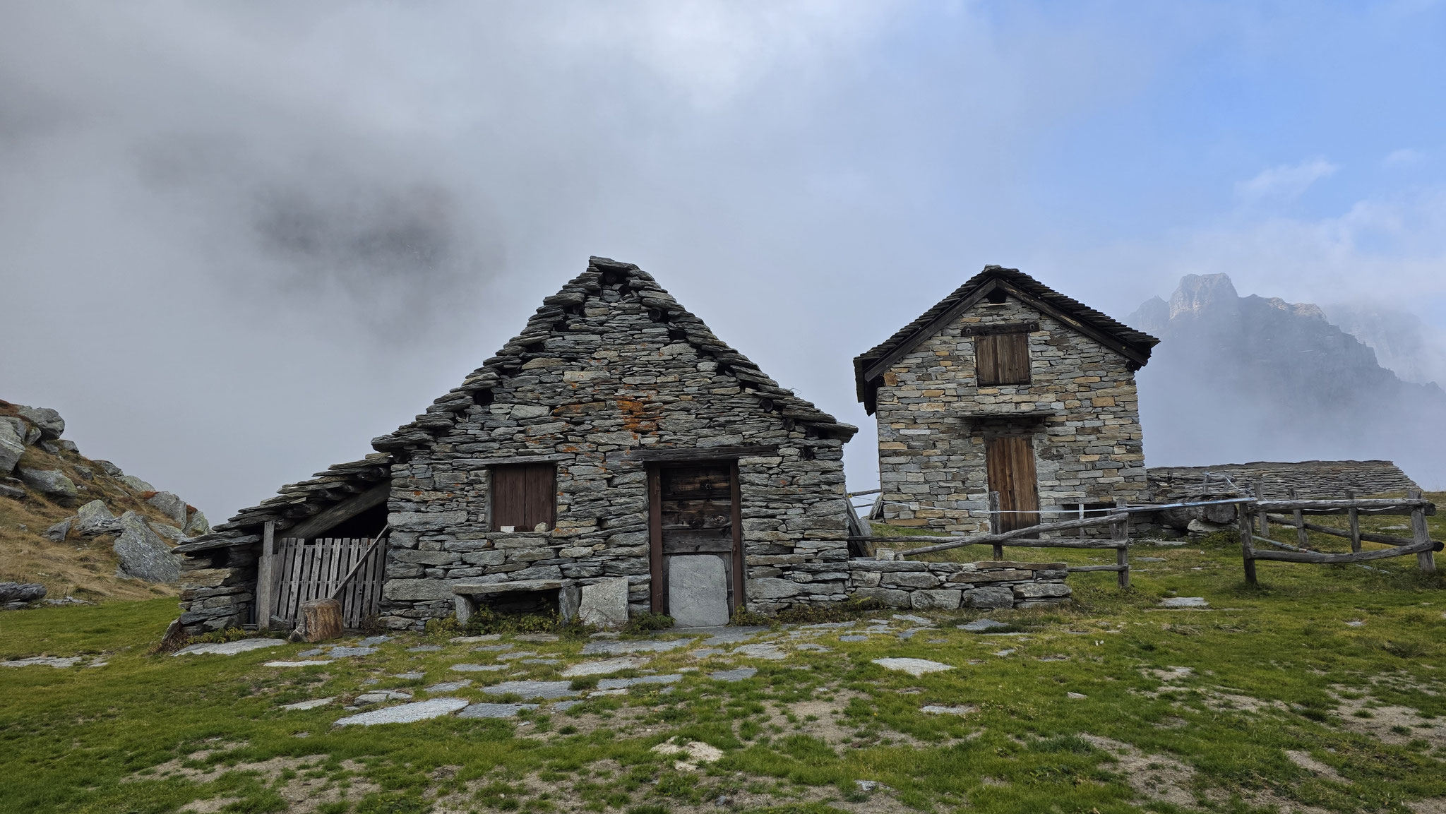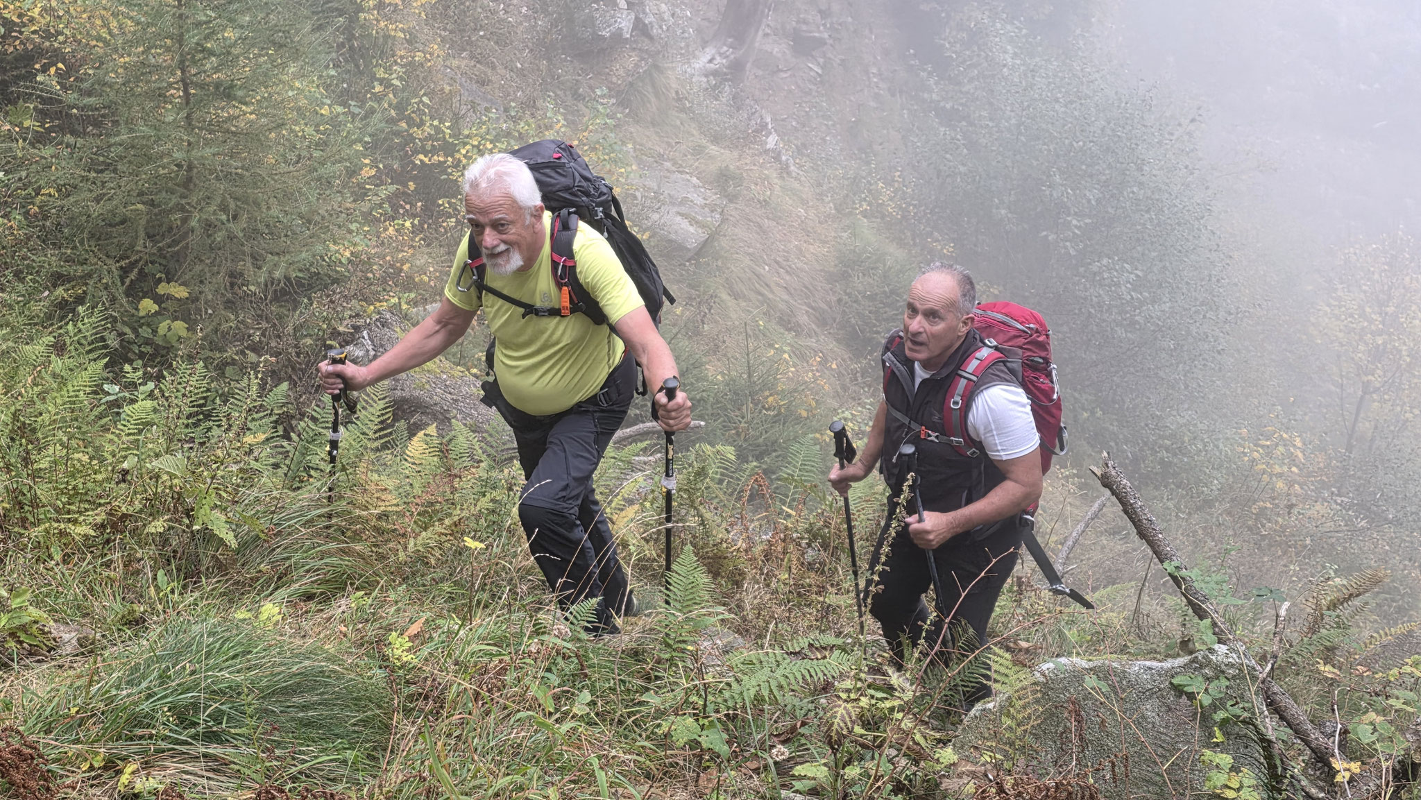 Siamo nella nebbia. Breve sosta e ripartenza alle 11,00. Superiamo l'Alpe Orzalina m. 1696 alle 11,15, l'Alpe Clusur m. 1753 alle 11,30 e arriviamo all'Alpe Ciampalbino m. 1920 alle 11,40. Nuova sosta e ripartenza alle 11,50. Ora il sentiero sale gradatamente fino ad arrivare al Passo Possette m. 2179 alle 12,25. Il tempo èmigliorato e a tratti esce anche il sole. Sosta per raggrupparci. Anna e Luciano decidono di non salire al Teggiolo. Ripartiamo alle 12,50, poco dopo anche Mauro rinuncia.