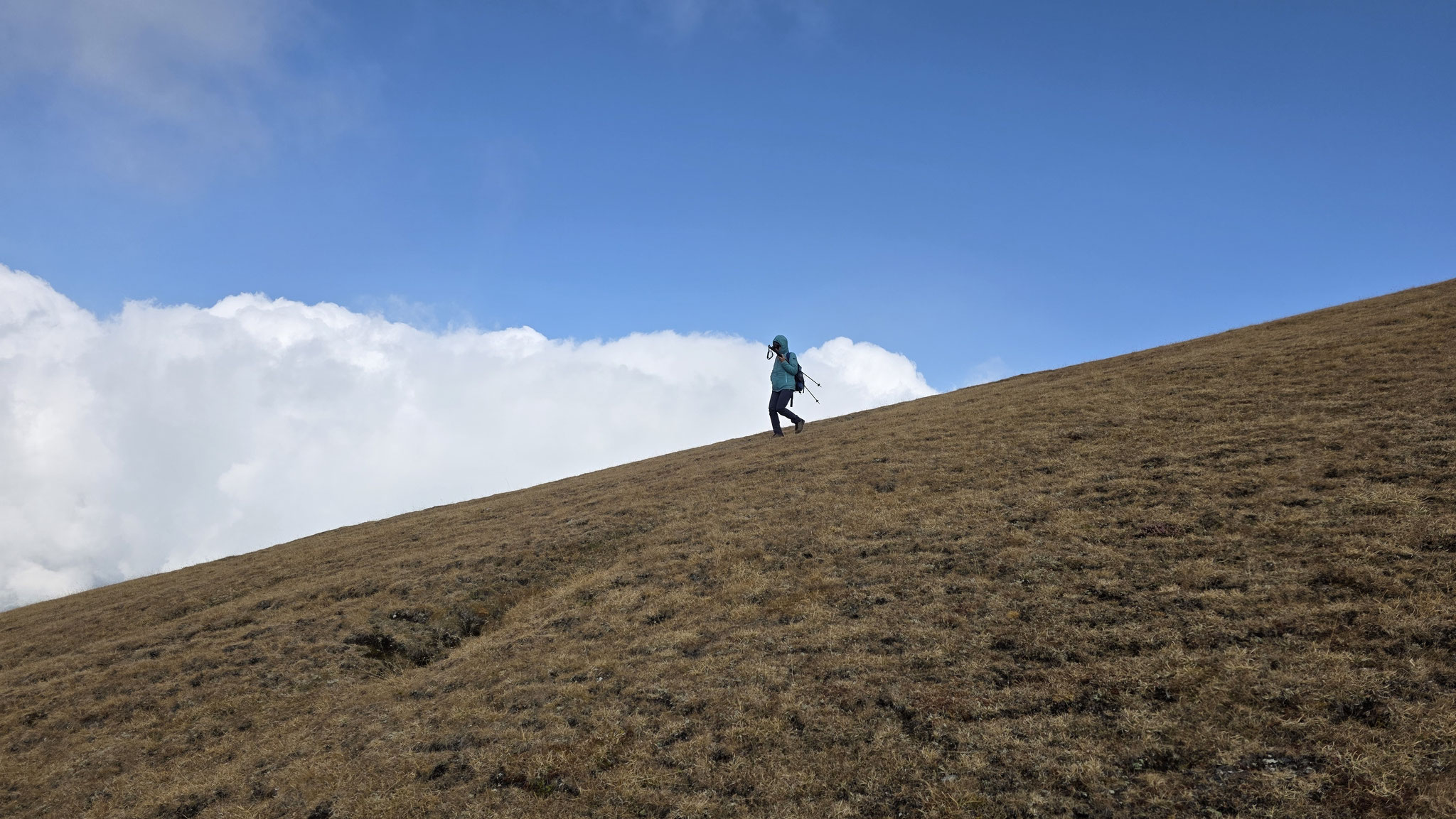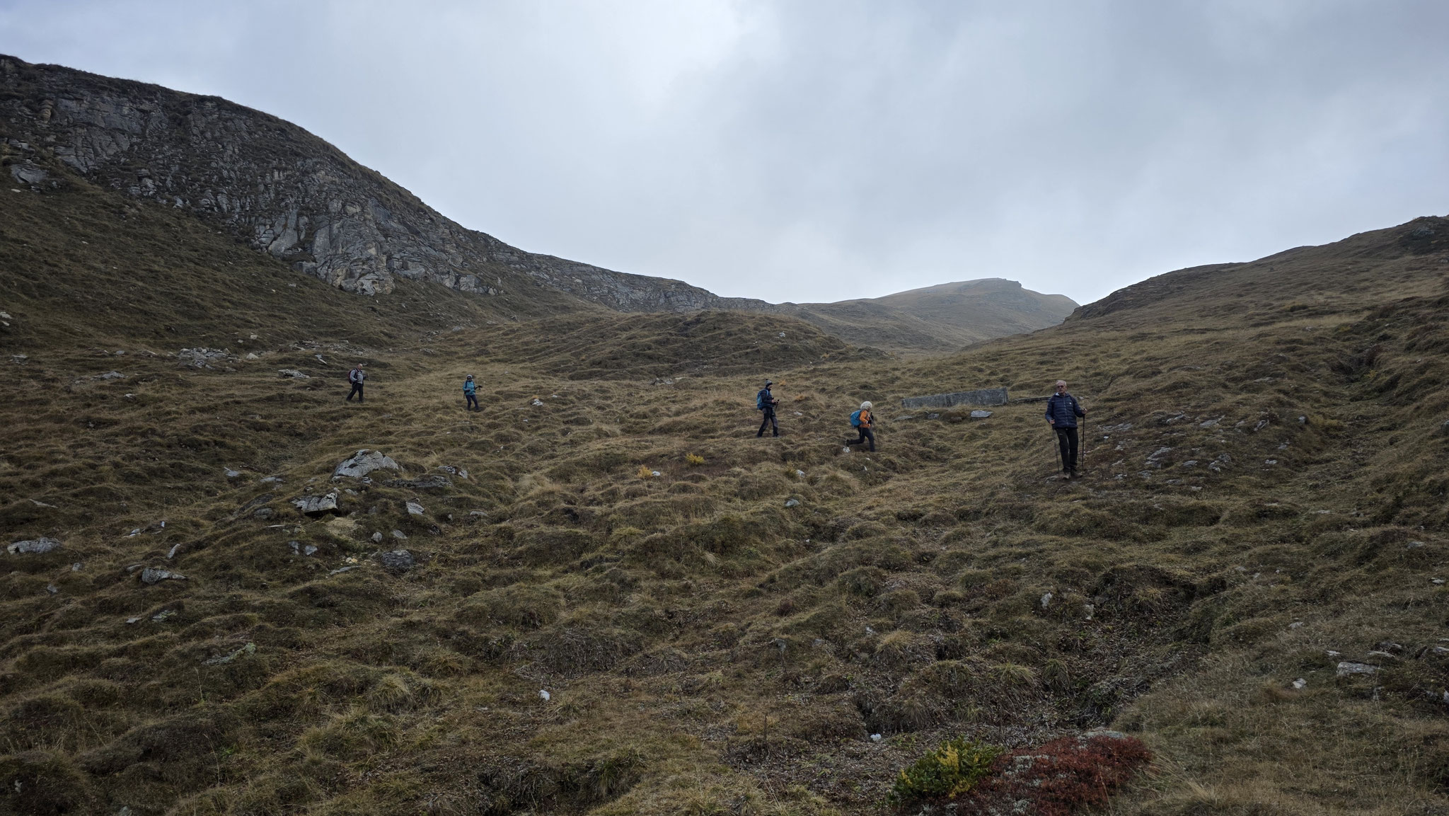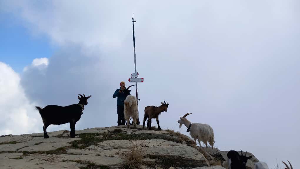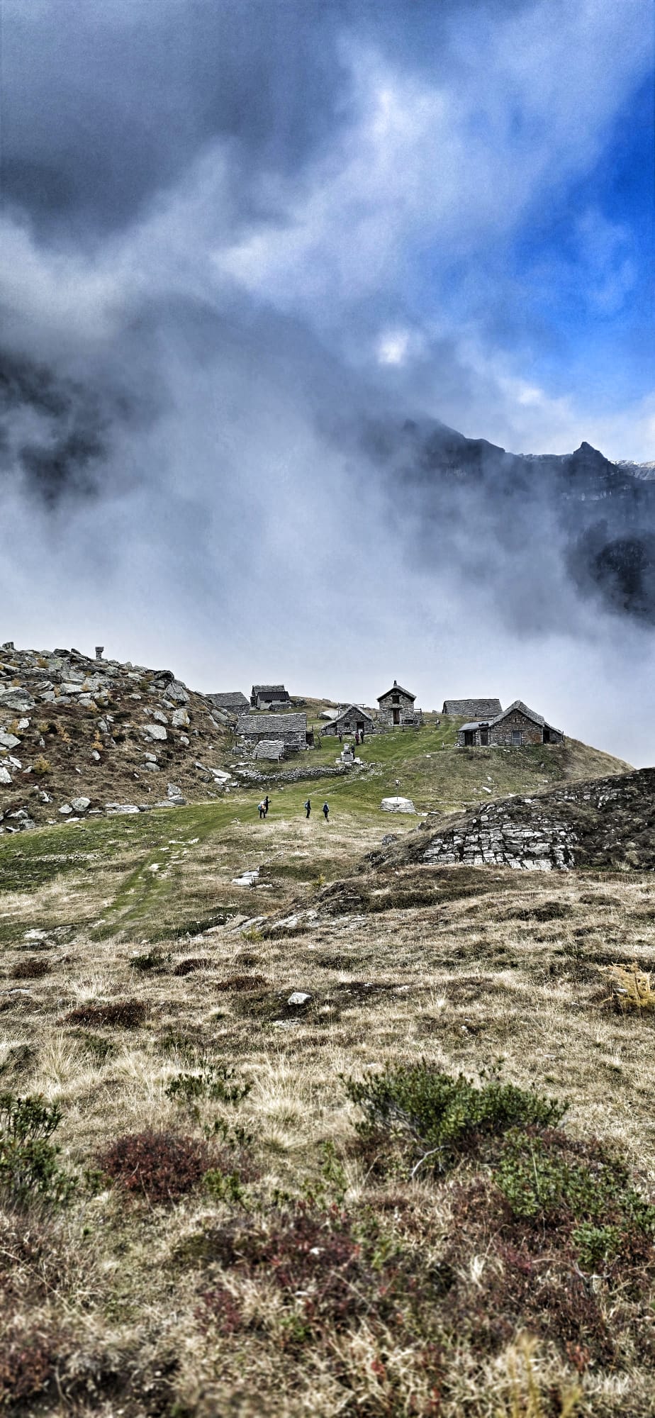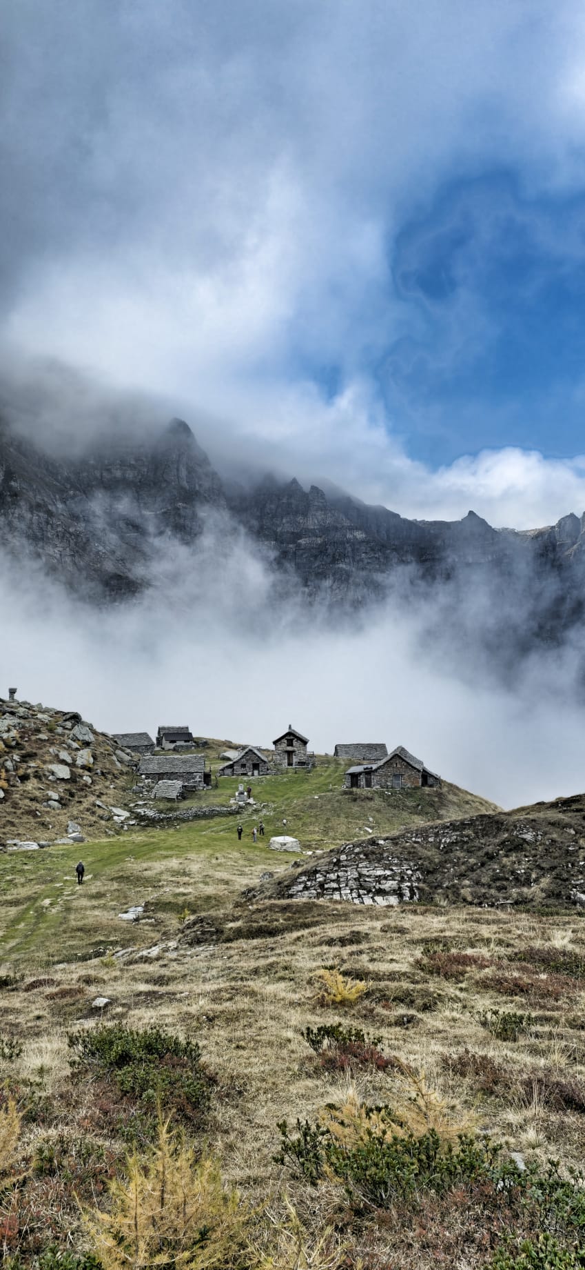 Siamo nella nebbia. Breve sosta e ripartenza alle 11,00. Superiamo l'Alpe Orzalina m. 1696 alle 11,15, l'Alpe Clusur m. 1753 alle 11,30 e arriviamo all'Alpe Ciampalbino m. 1920 alle 11,40. Nuova sosta e ripartenza alle 11,50. Ora il sentiero sale gradatamente fino ad arrivare al Passo Possette m. 2179 alle 12,25. Il tempo èmigliorato e a tratti esce anche il sole. Sosta per raggrupparci. Anna e Luciano decidono di non salire al Teggiolo. Ripartiamo alle 12,50, poco dopo anche Mauro rinuncia.