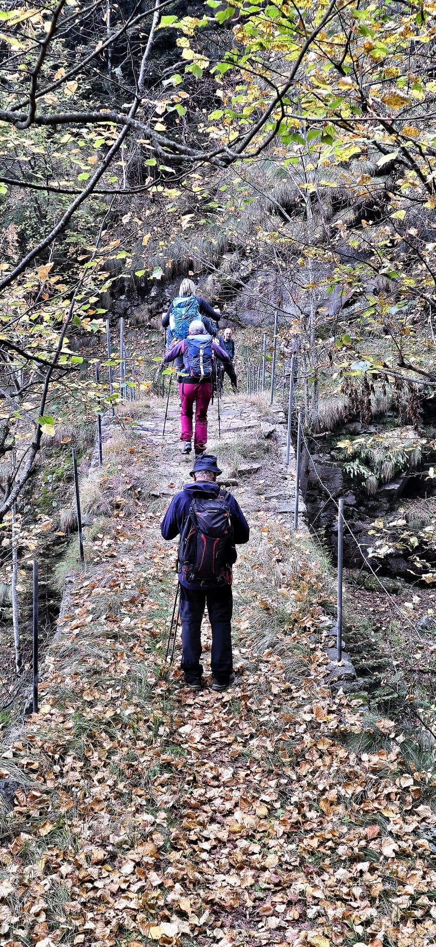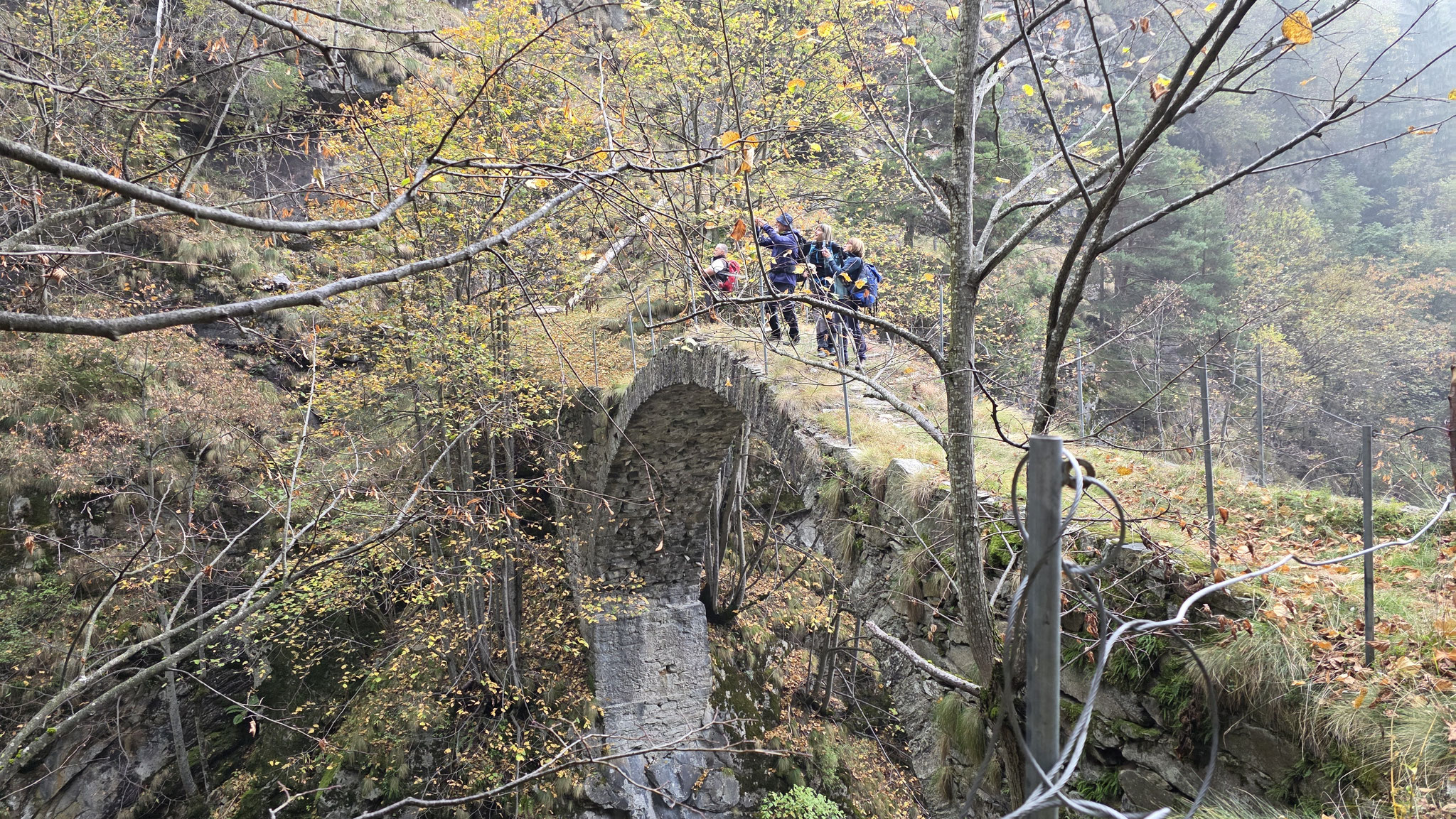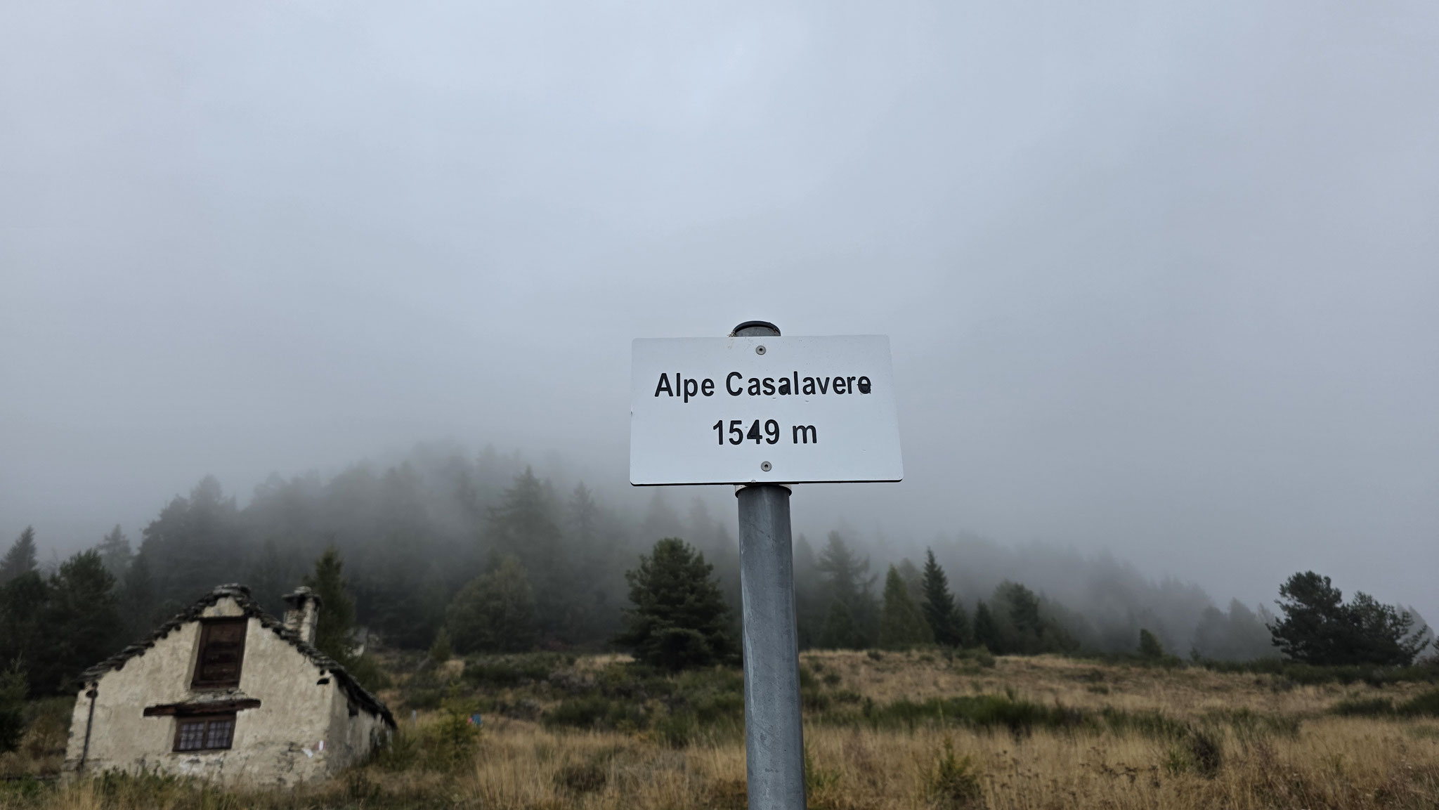 Proseguiamo per un breve tratto sulla strada, poi prendiamo il sentiero per Bugliaga. Alle 9,05 giriamo a sinistra e scendiamo al ponte del diavolino m. 1231 alle 9,25. Risaliamo dalla parte opposta su sentiero non molto agevole e ripido che ci porta sulla strada poco prima di Bugliaga m. 1314 dove arriviamo alle 10,10. Saliamo per un tratto sulla strada, quindi, alle 10,20 ad un bivio giriamo a destra, ad un nuovo bivio, alle 10,40 proseguiamo sempre a destra e arriviamo all'Alpe Casalavero m. 1549 alle 10,55.